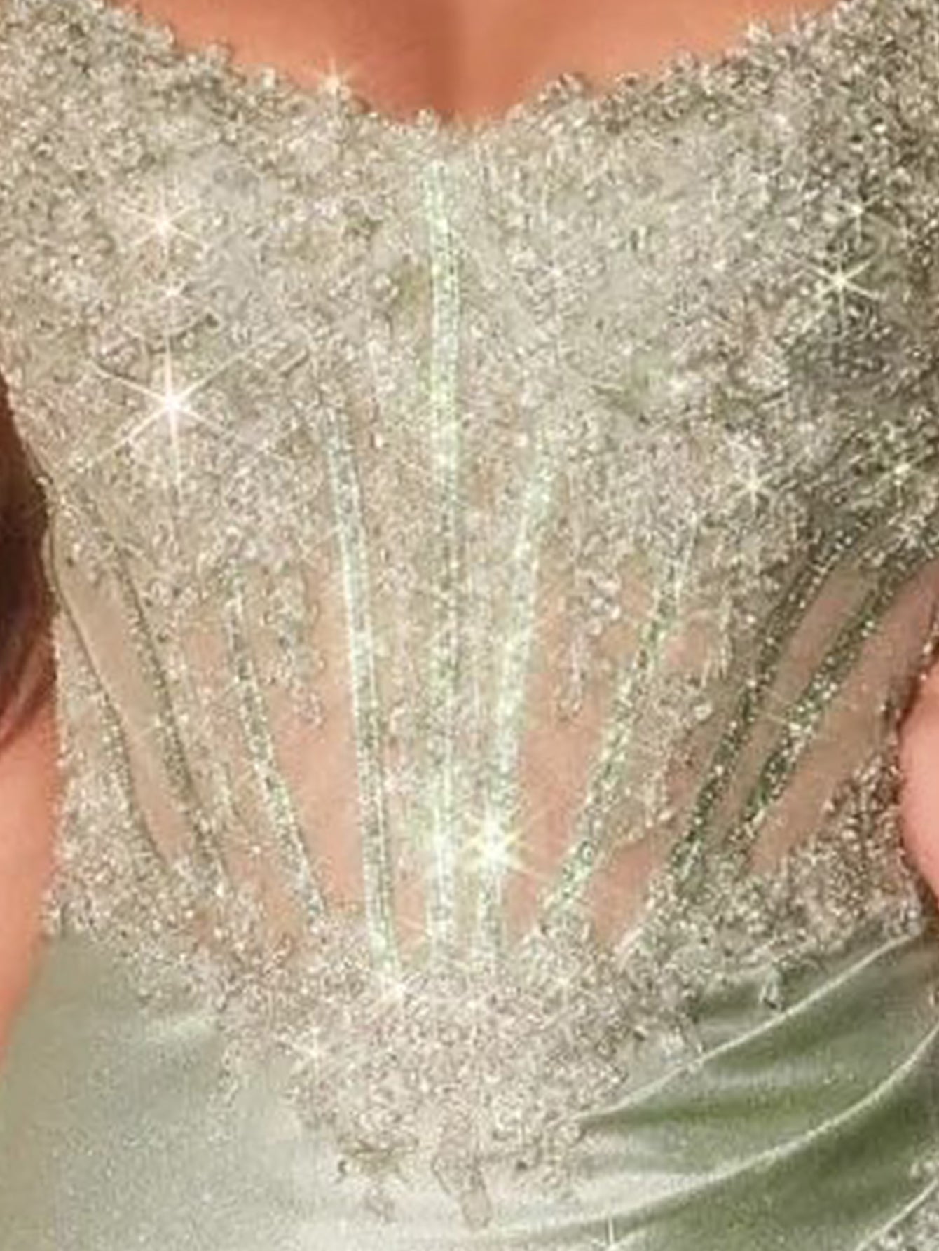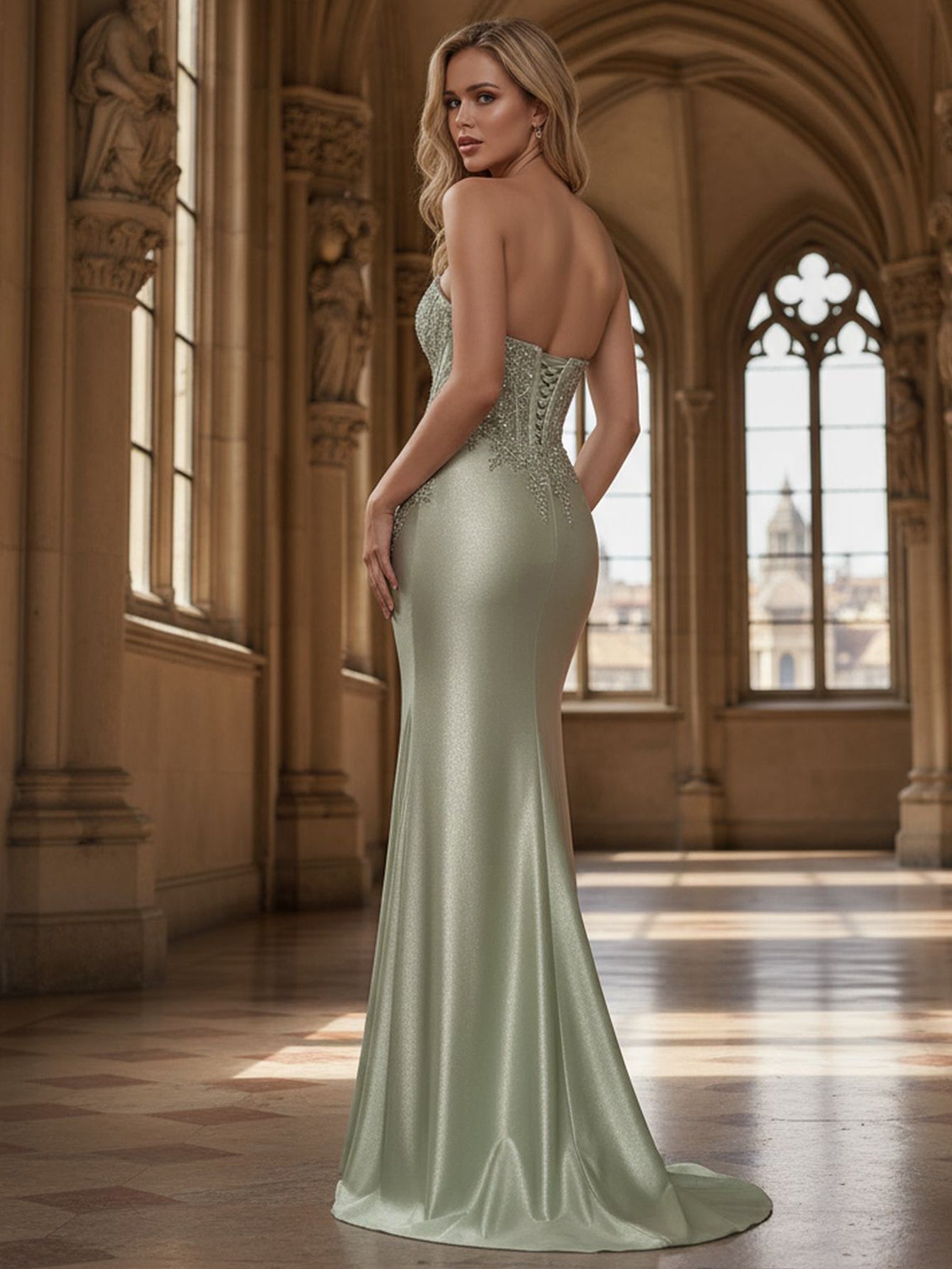 Strapless Hand Beading Lace Up Ruched Illusion Bodice Mermaid Prom Dress With Slit - Light Green