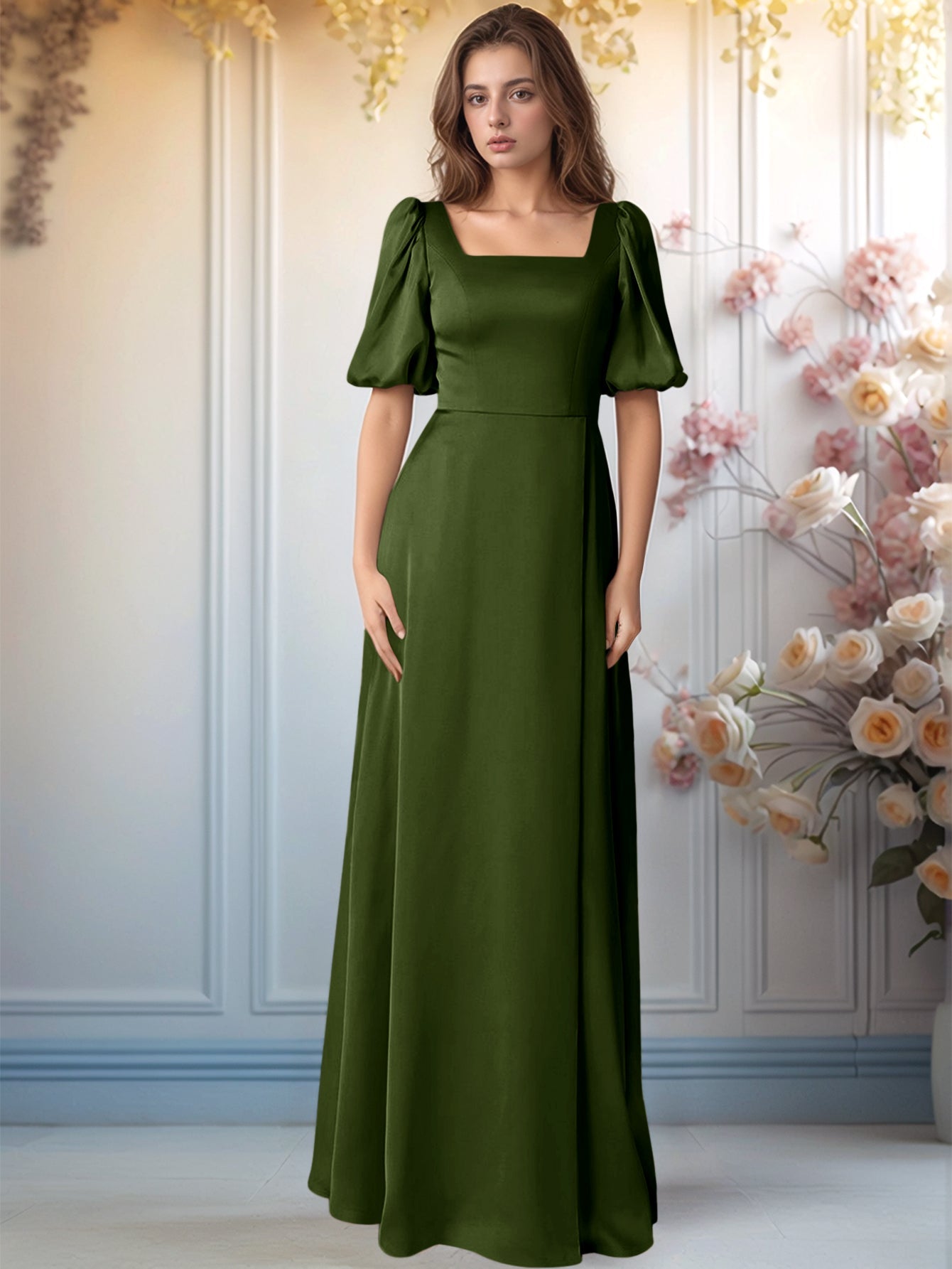 Half Sleeves Square A-Line long Bridesmaid Dress - Olive Green