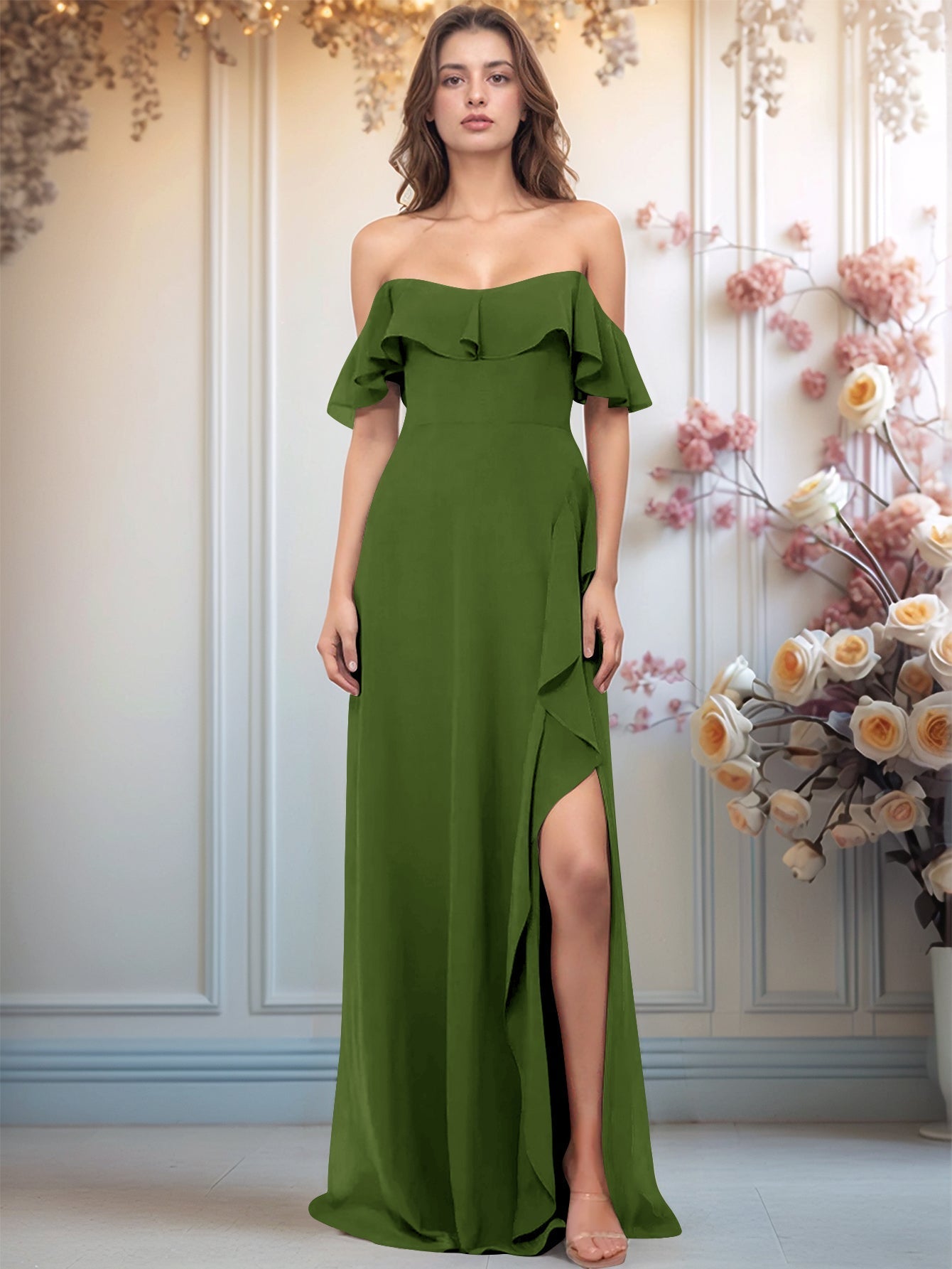 Ruffle Off Shoulder A-Line Chiffon Bridesmaid Dress - Olive Green