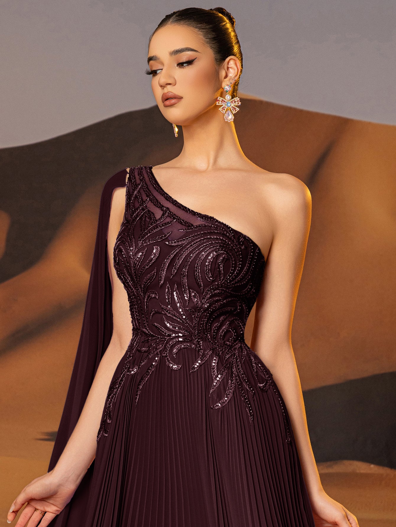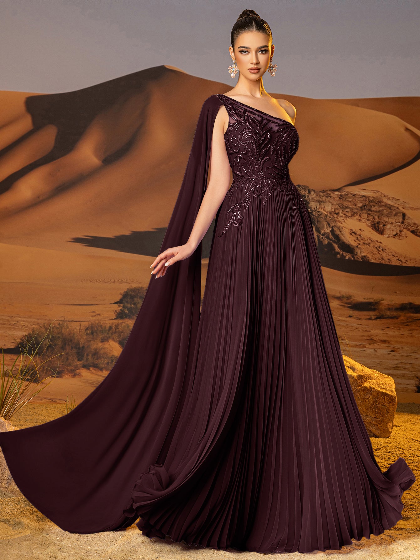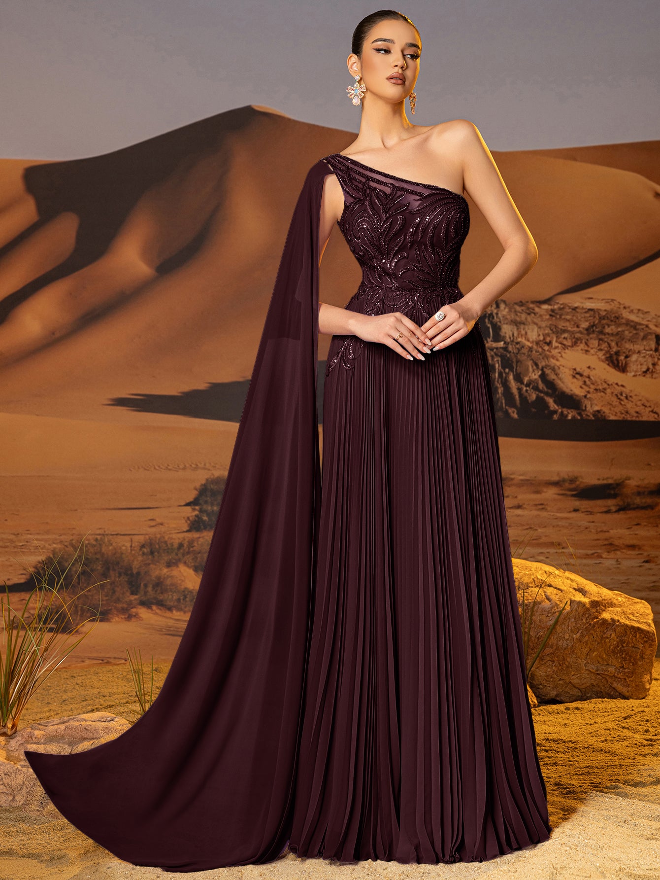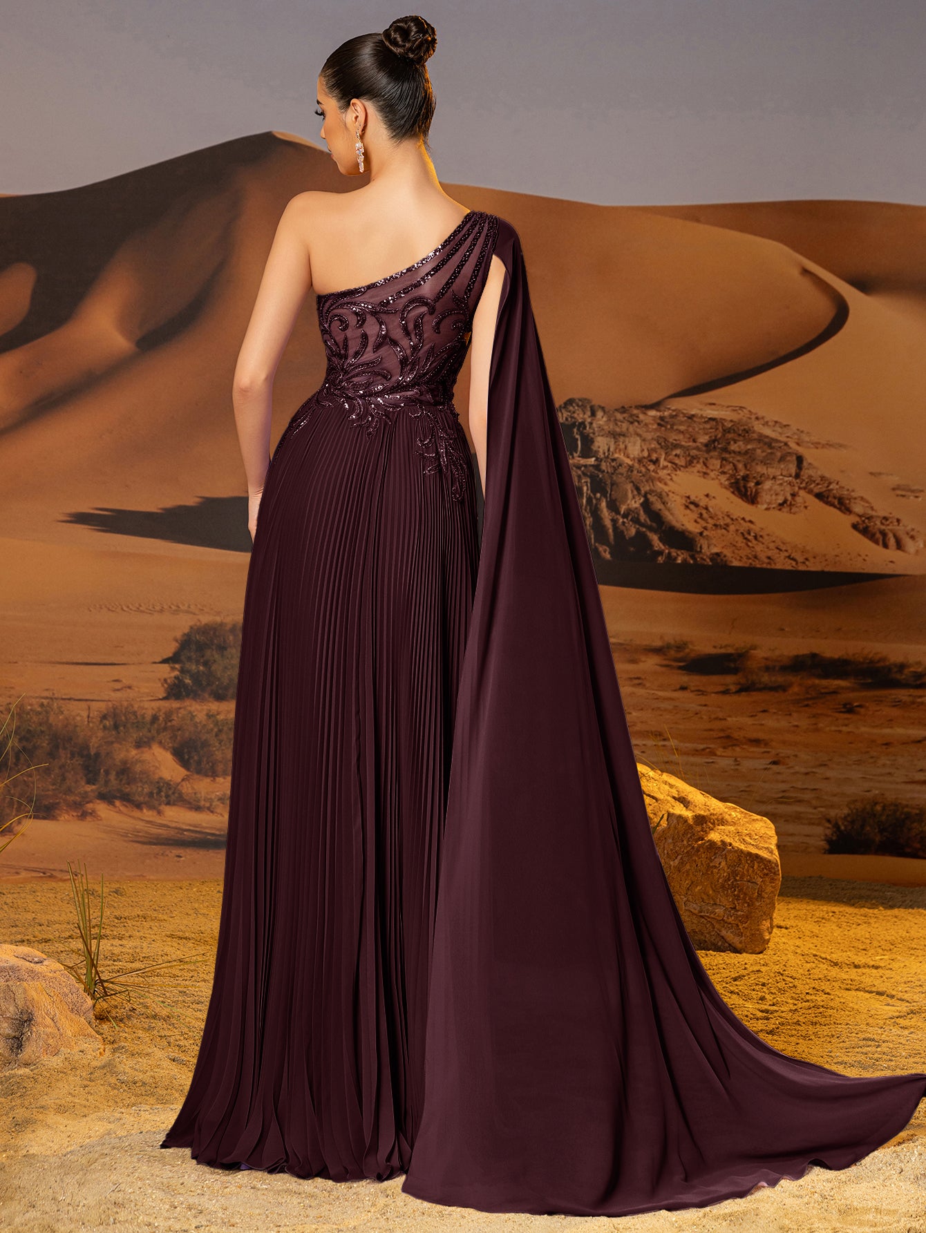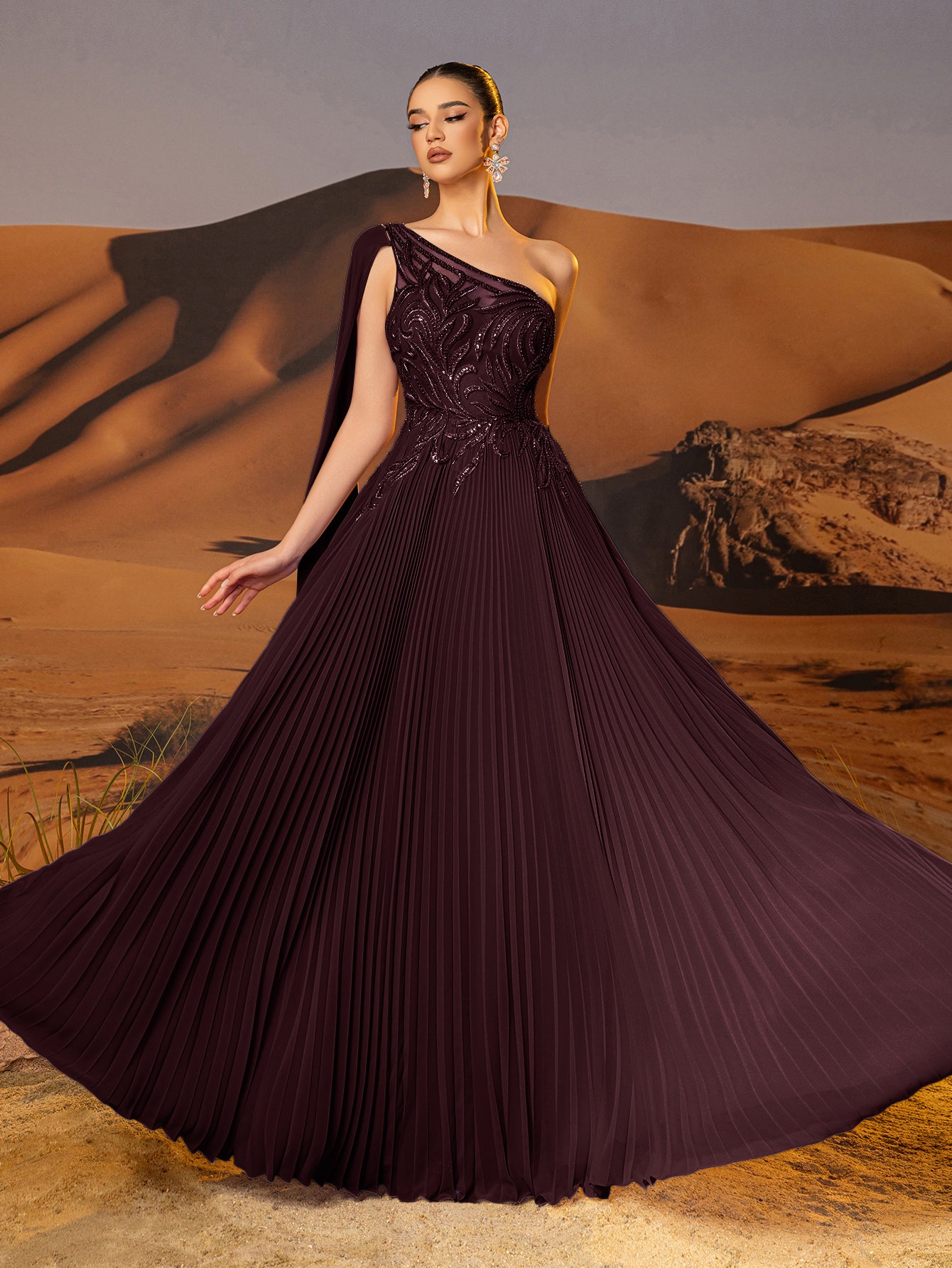 One Shoulder Beaded Pleats Long A-Line Prom Dress With Tulle - Burgundy