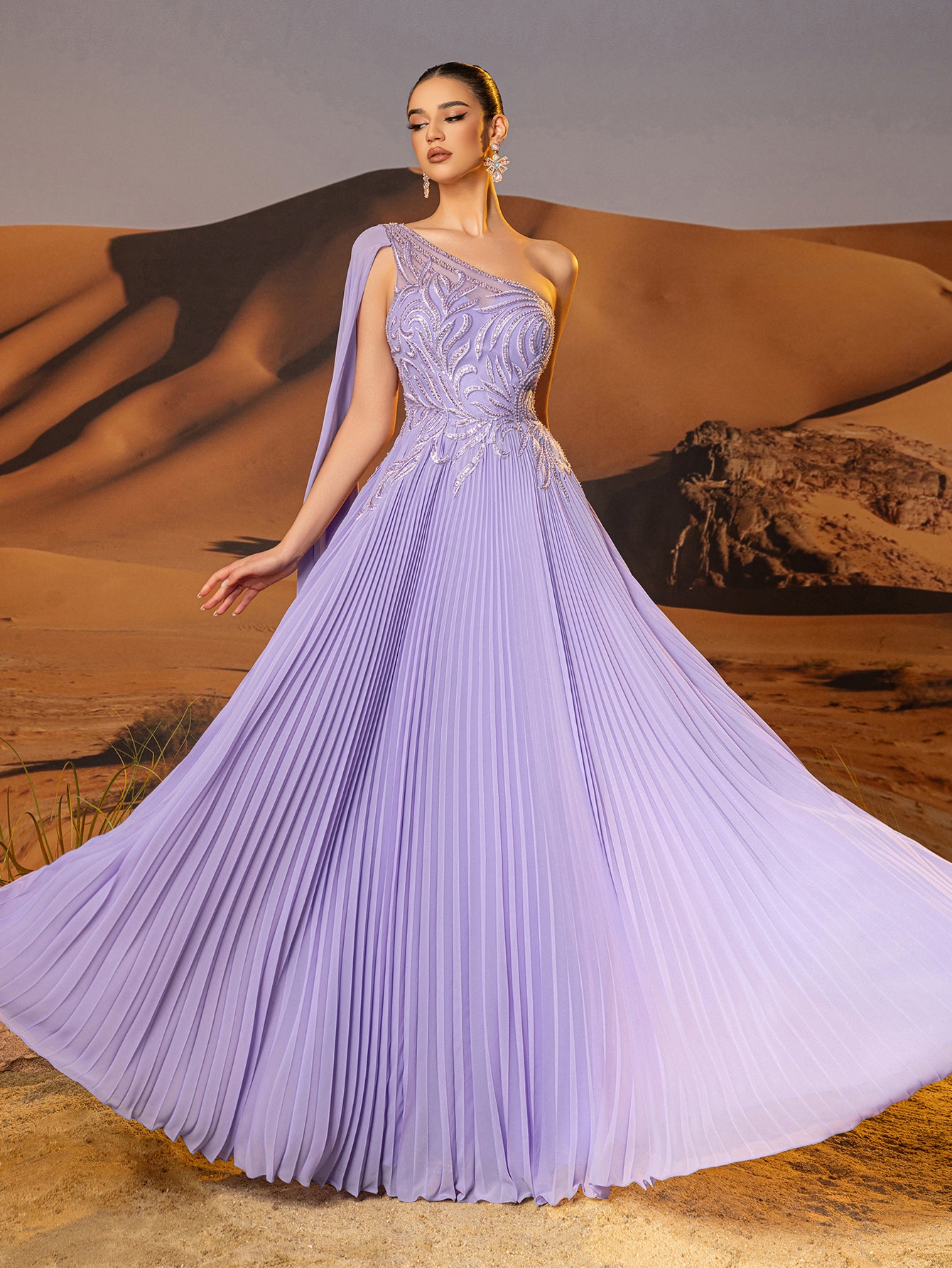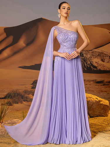 One Shoulder Beaded Pleats Long A-Line Prom Dress With Tulle - Lilac