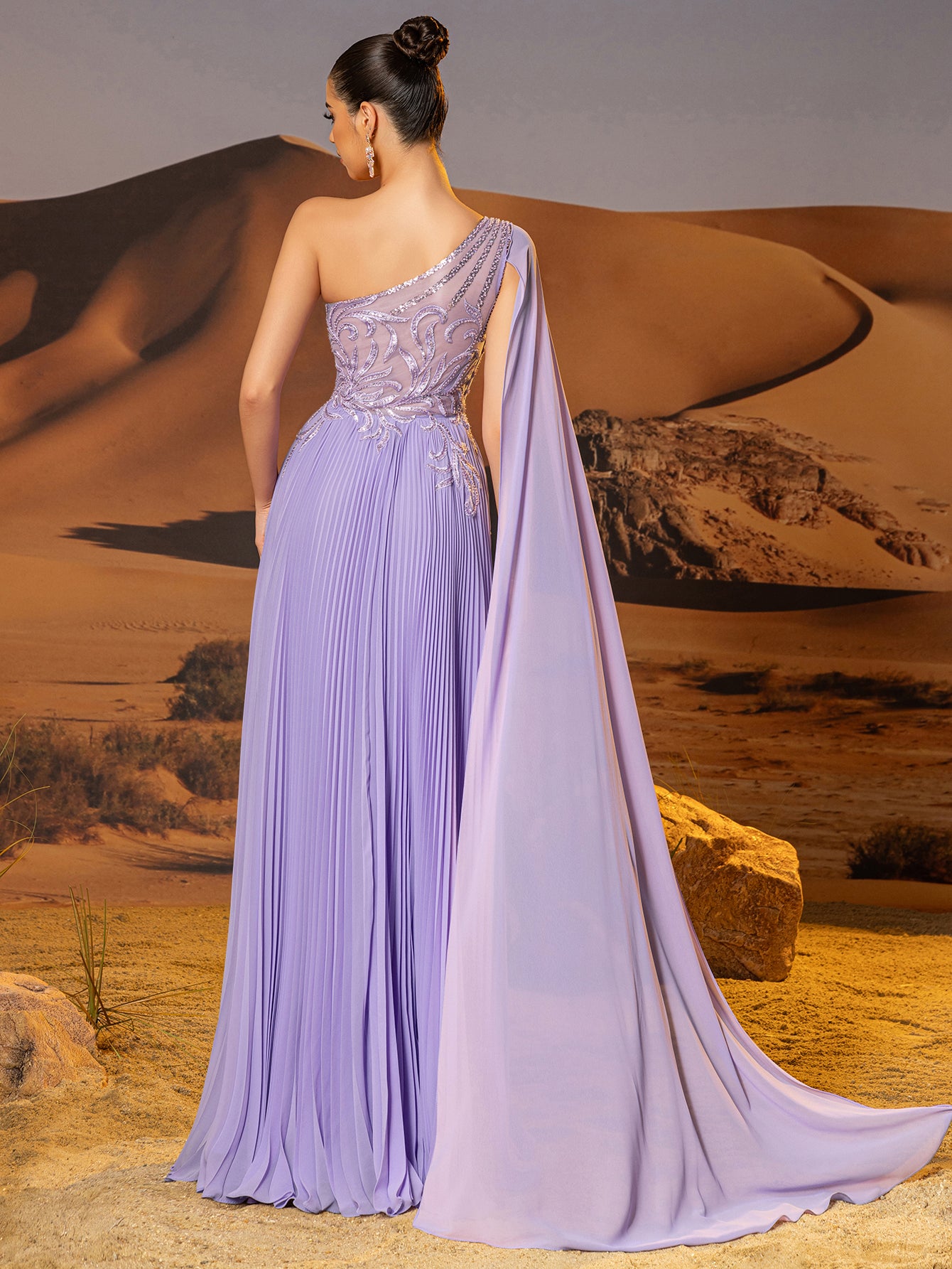 This chiffon gown features beaded embroidery and drop train on the bodice. The one shoulder dress for prom has a asymmetrical Neckline and pleated hem. This a-line dress for cocktail is ideal for party, evening or festivals.
