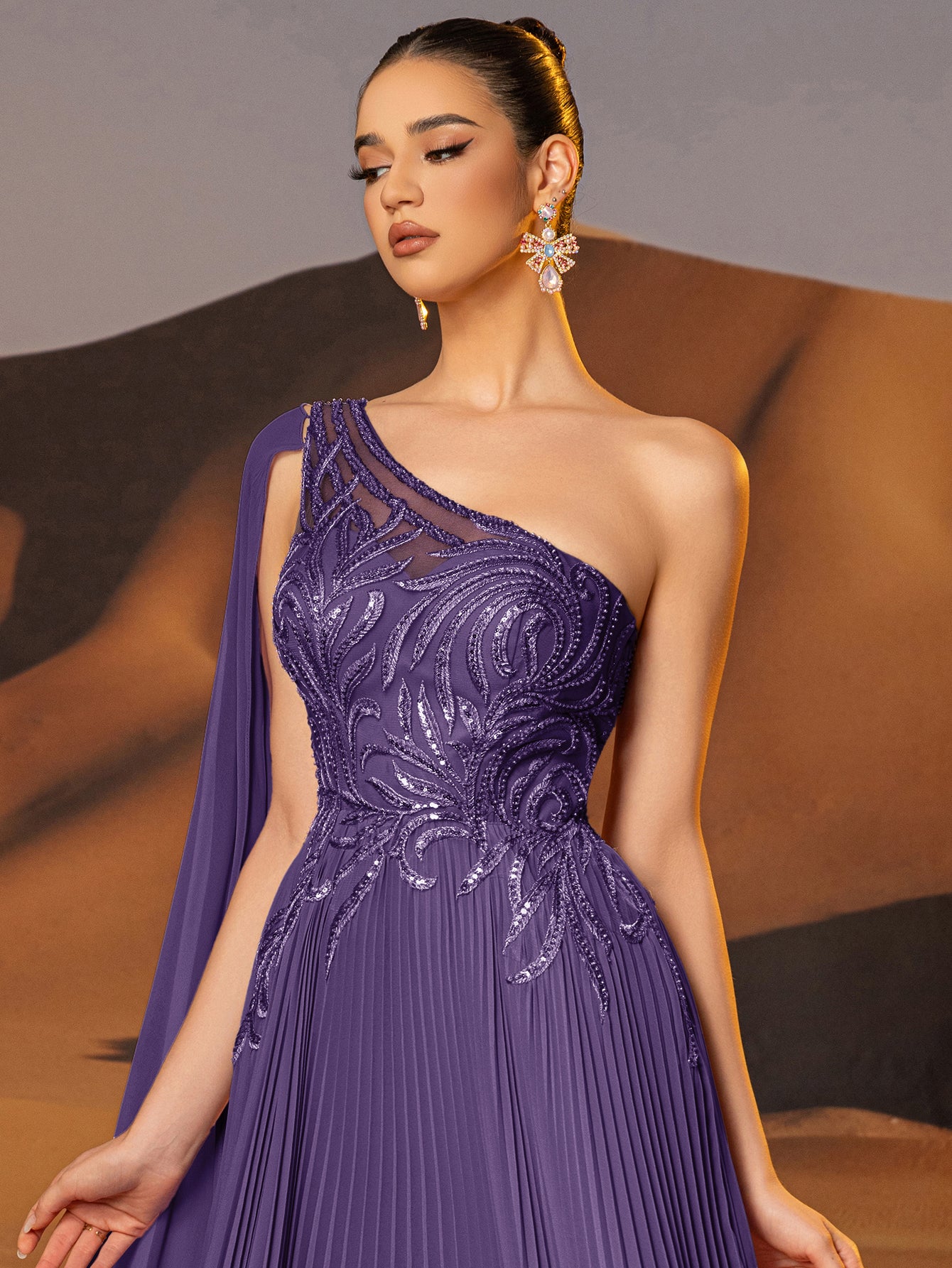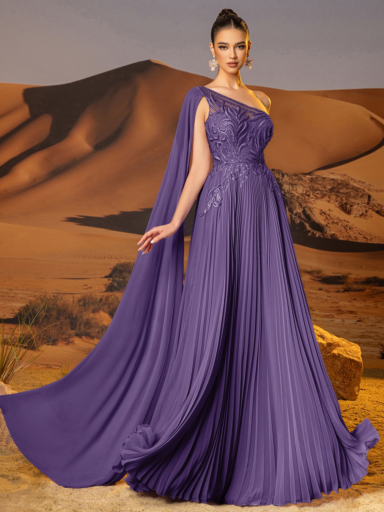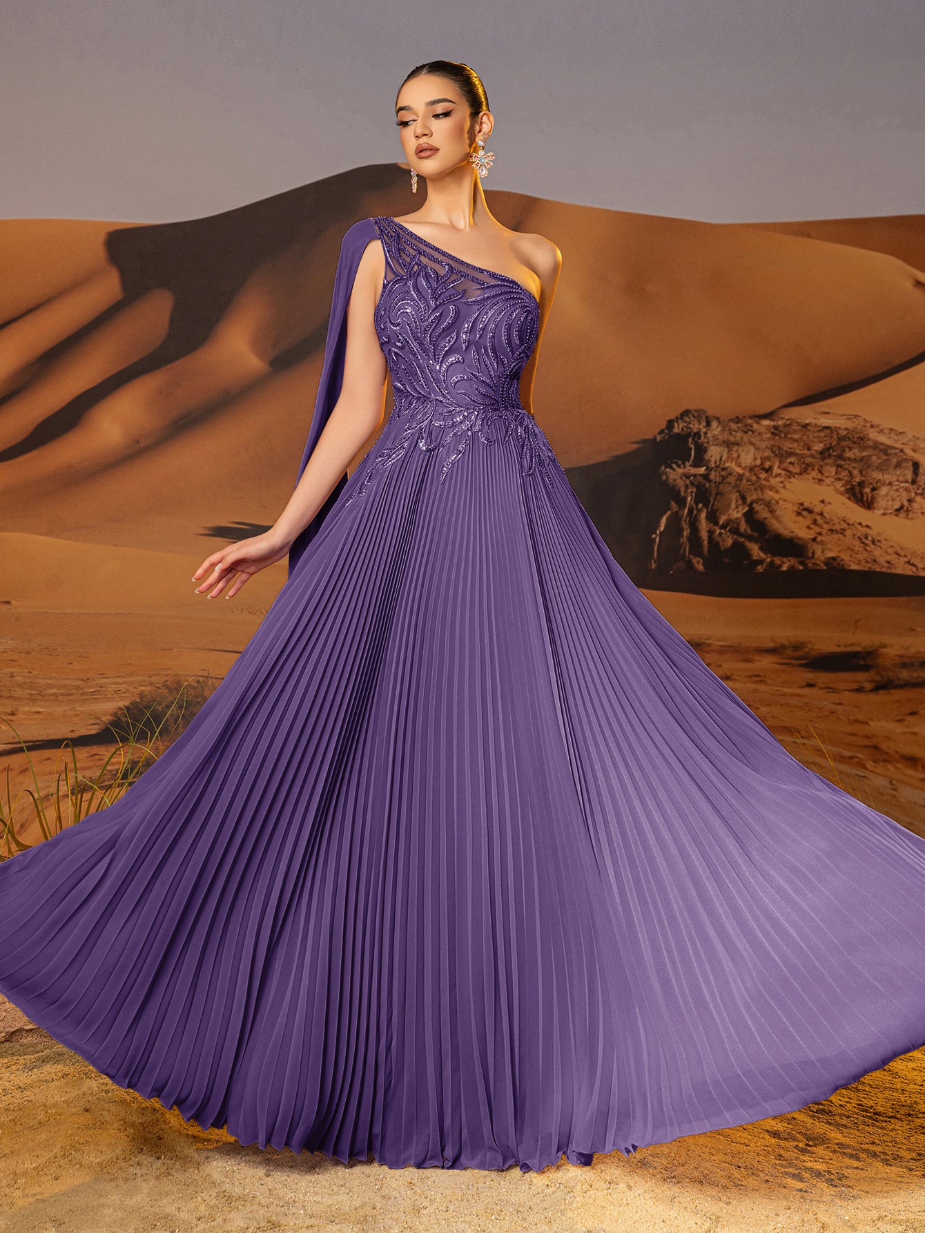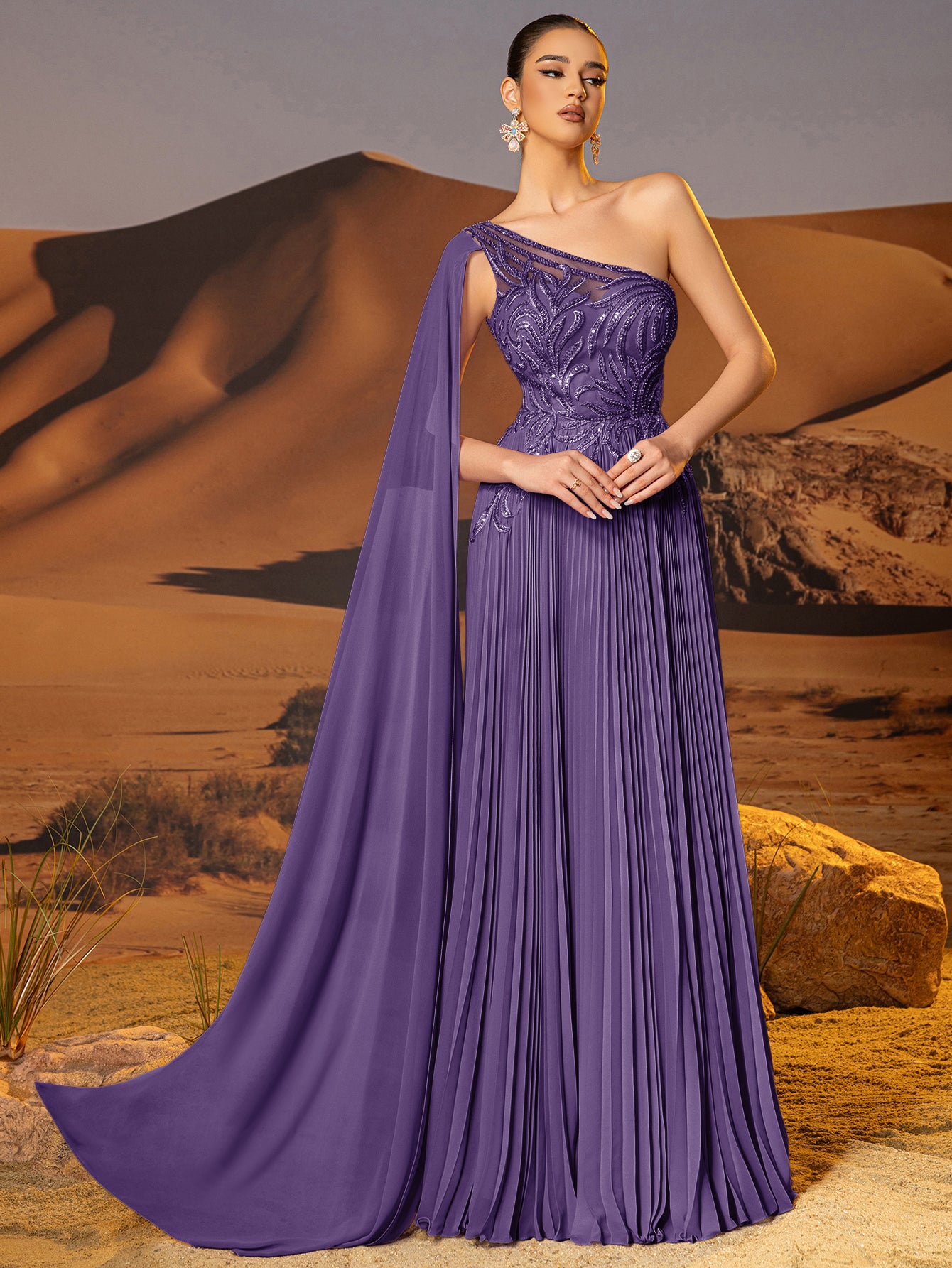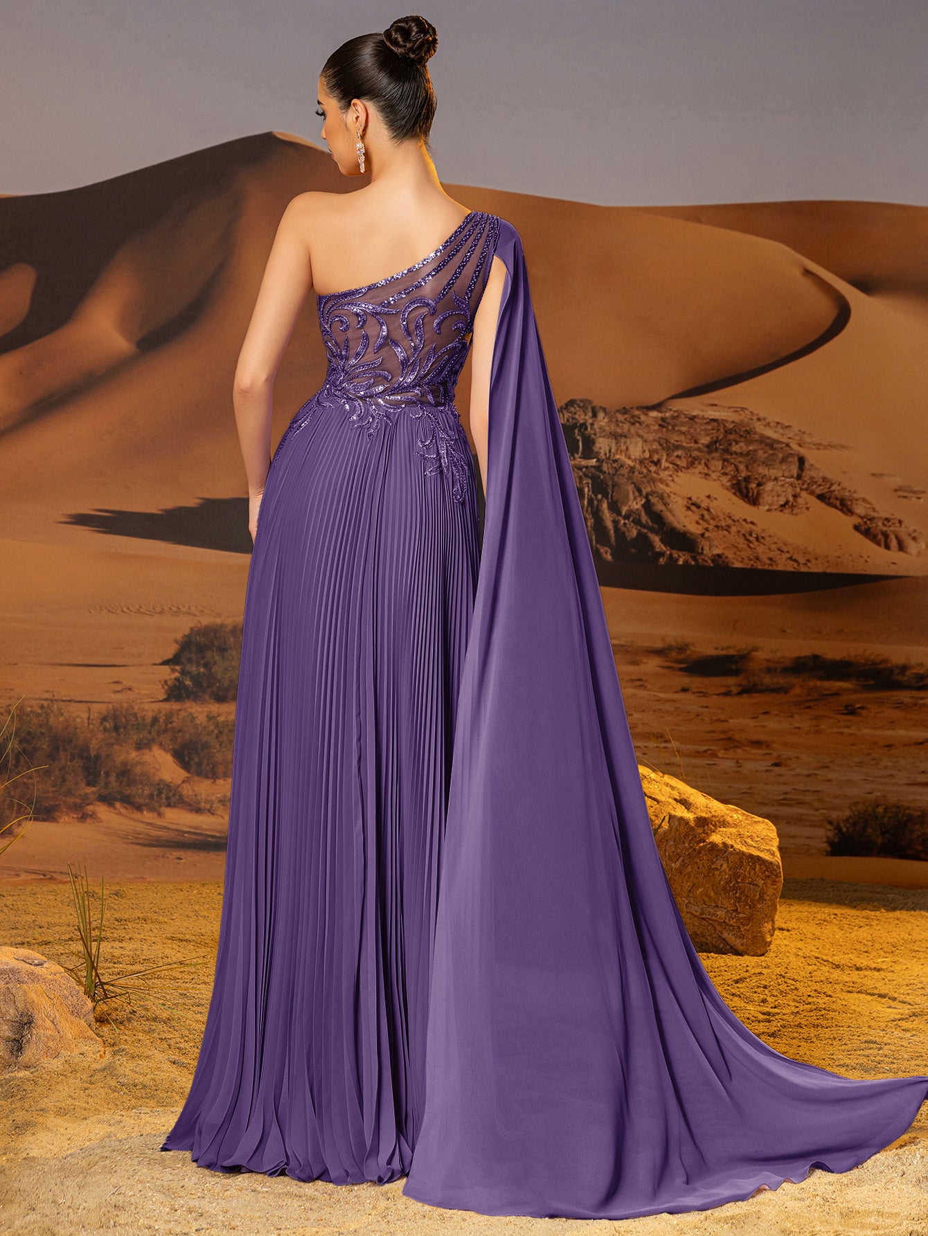 One Shoulder Beaded Pleats Long A-Line Prom Dress With Tulle - Purple