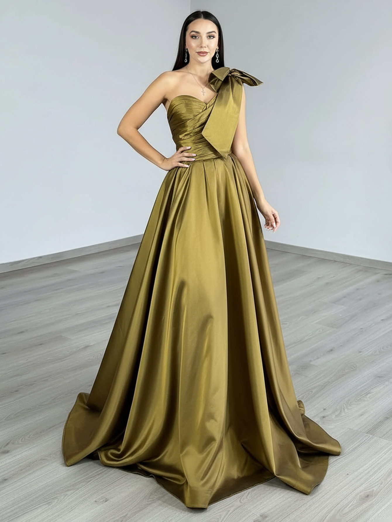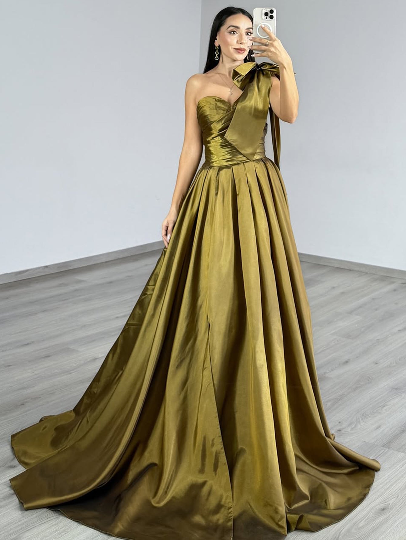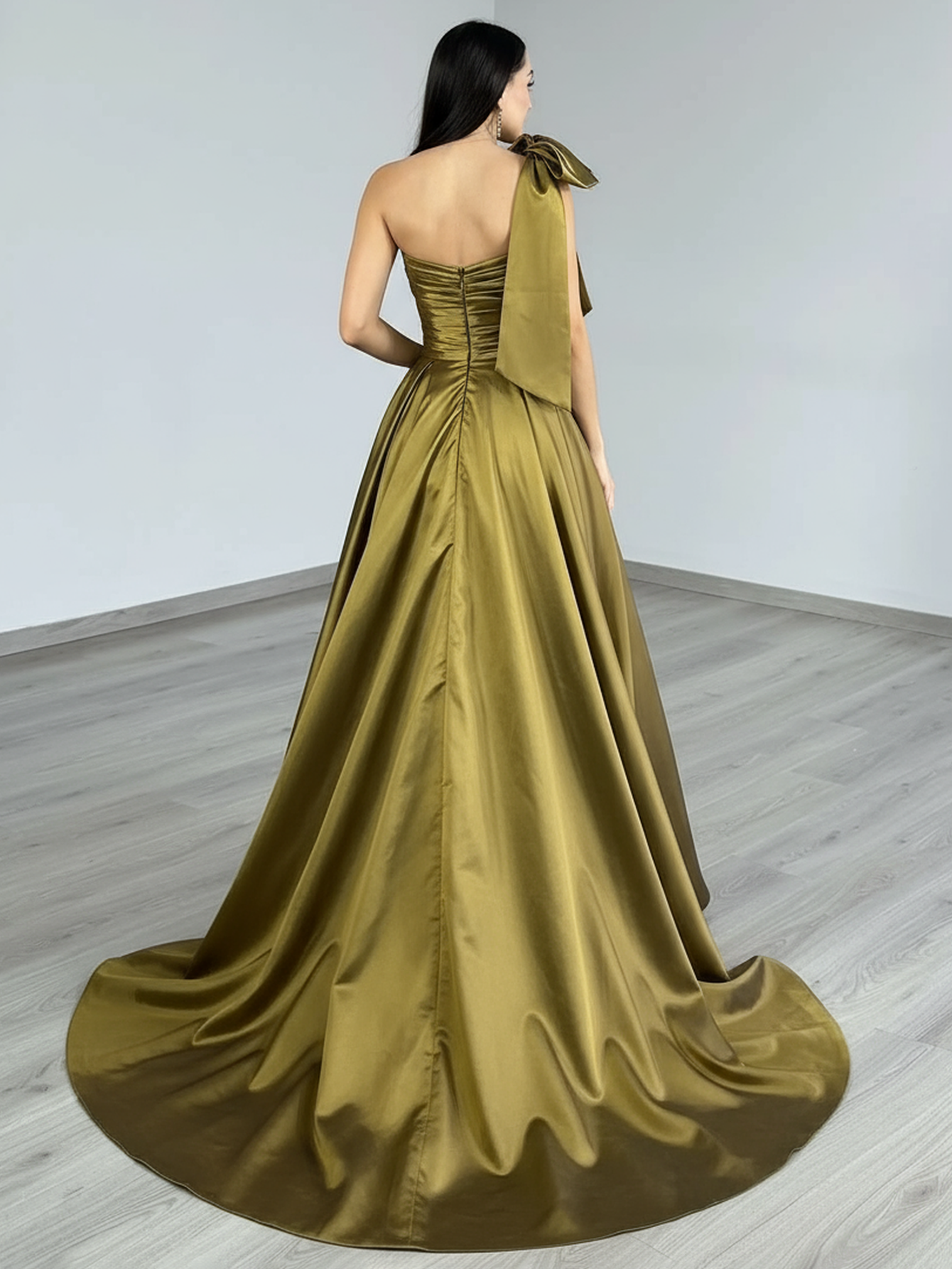 One Shoulder Ruched Big Bow Bodice Ball Gown Prom Dress - Olive Green