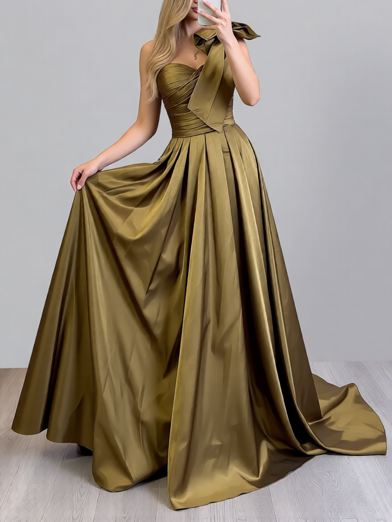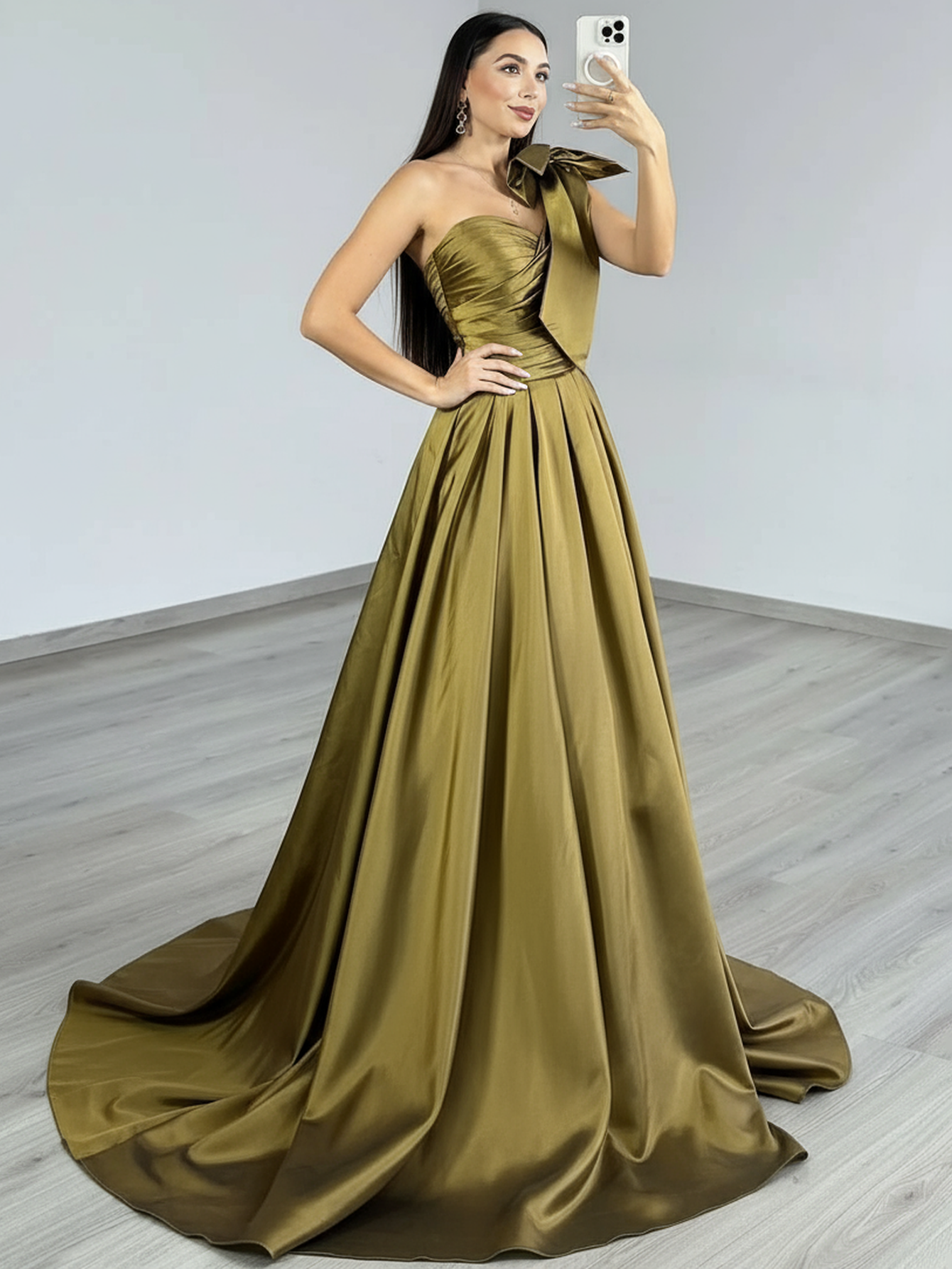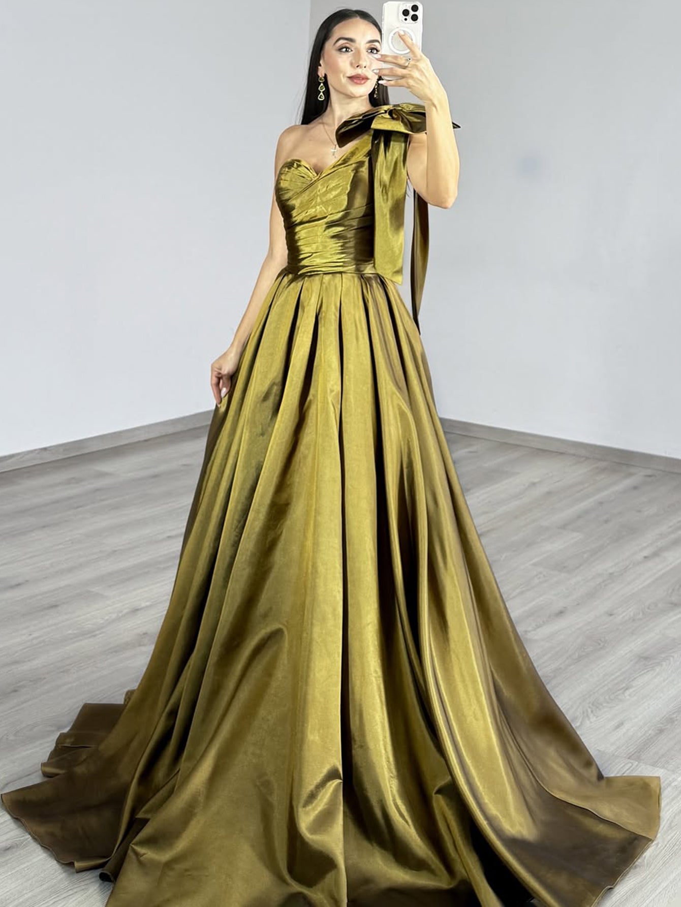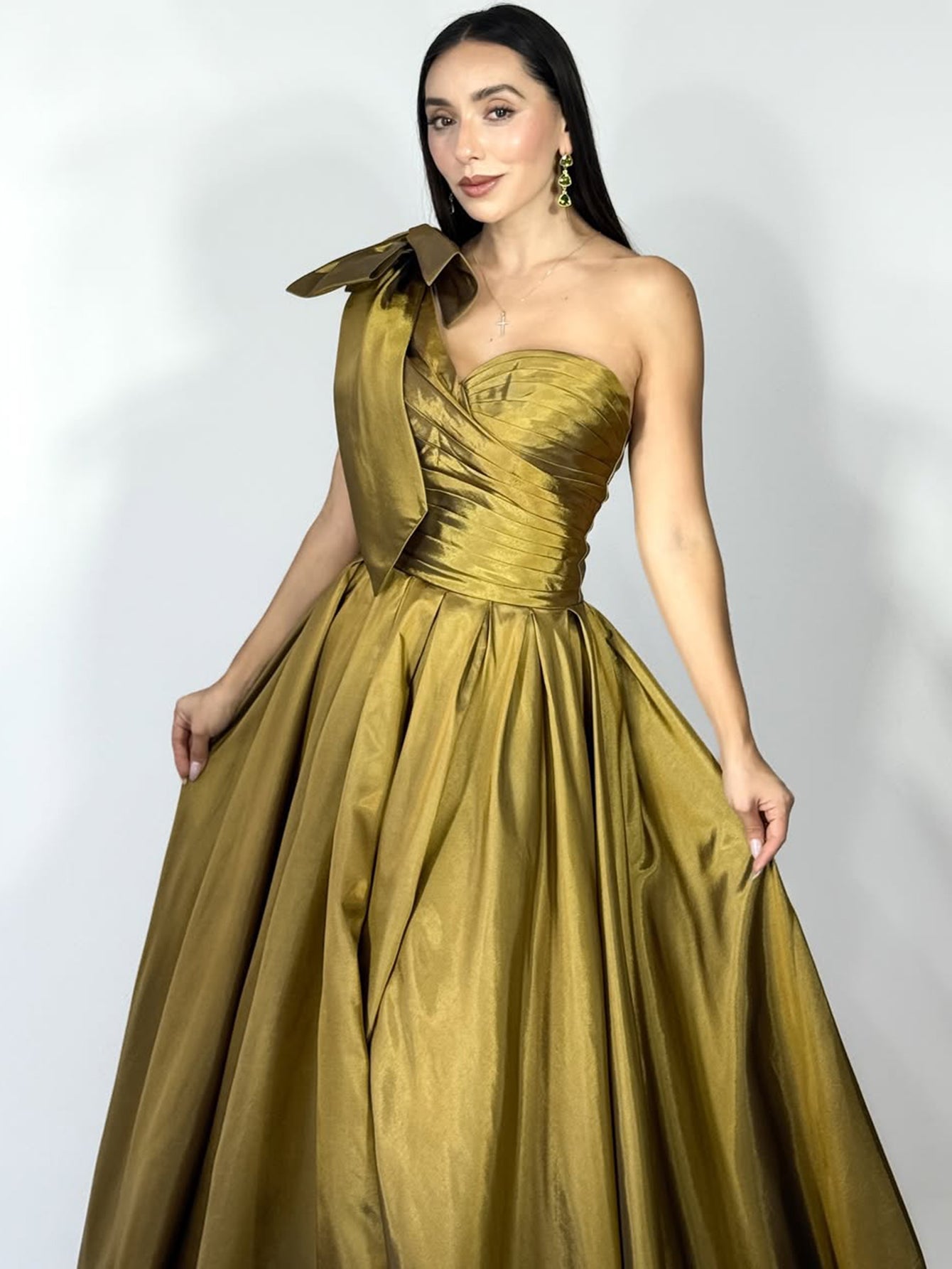 One Shoulder Ruched Big Bow Bodice Ball Gown Prom Dress - Olive Green
