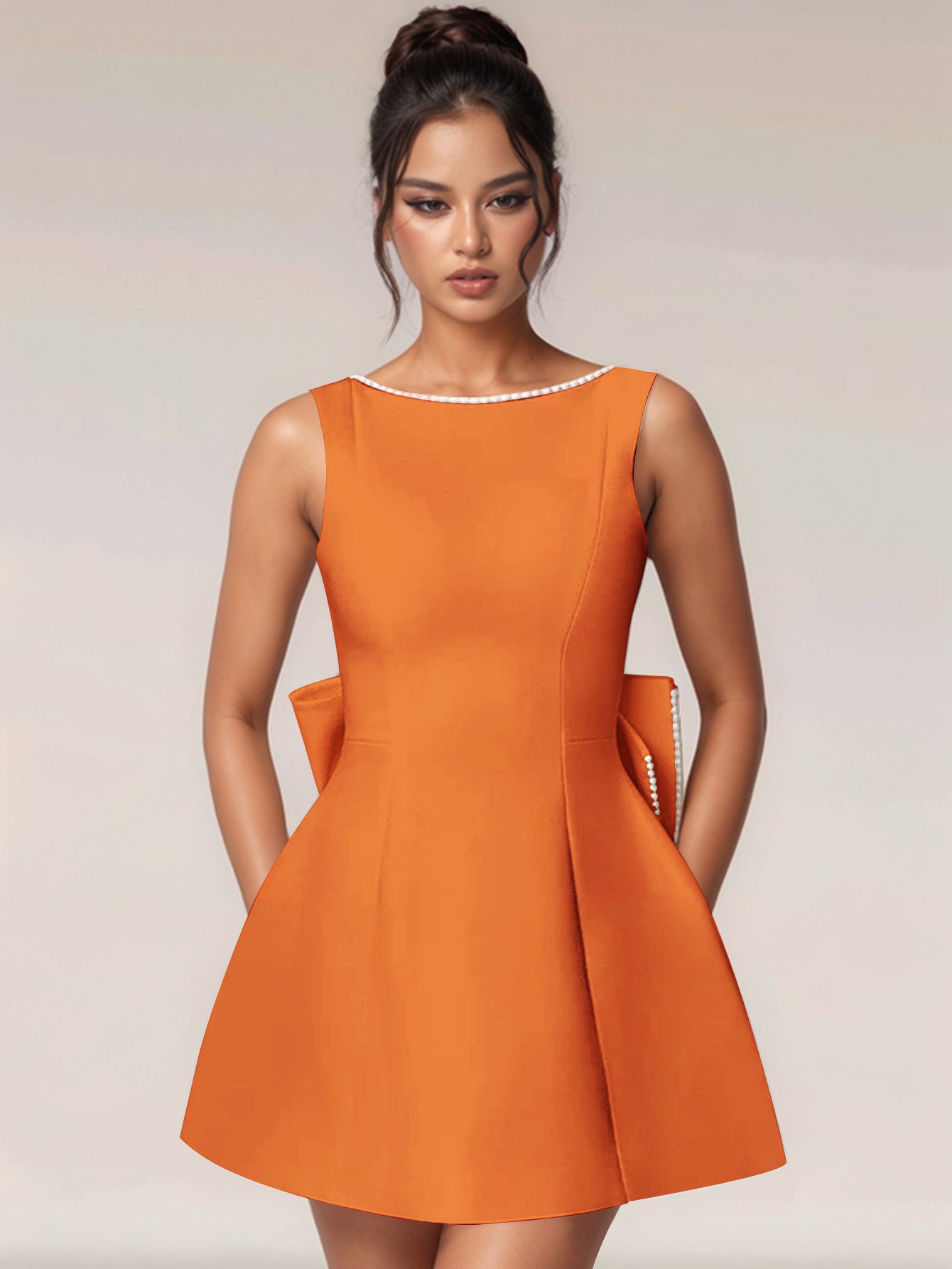 Hand Beading Backless Bow Ball Gown Prom Bridal Mini Dress - Orange