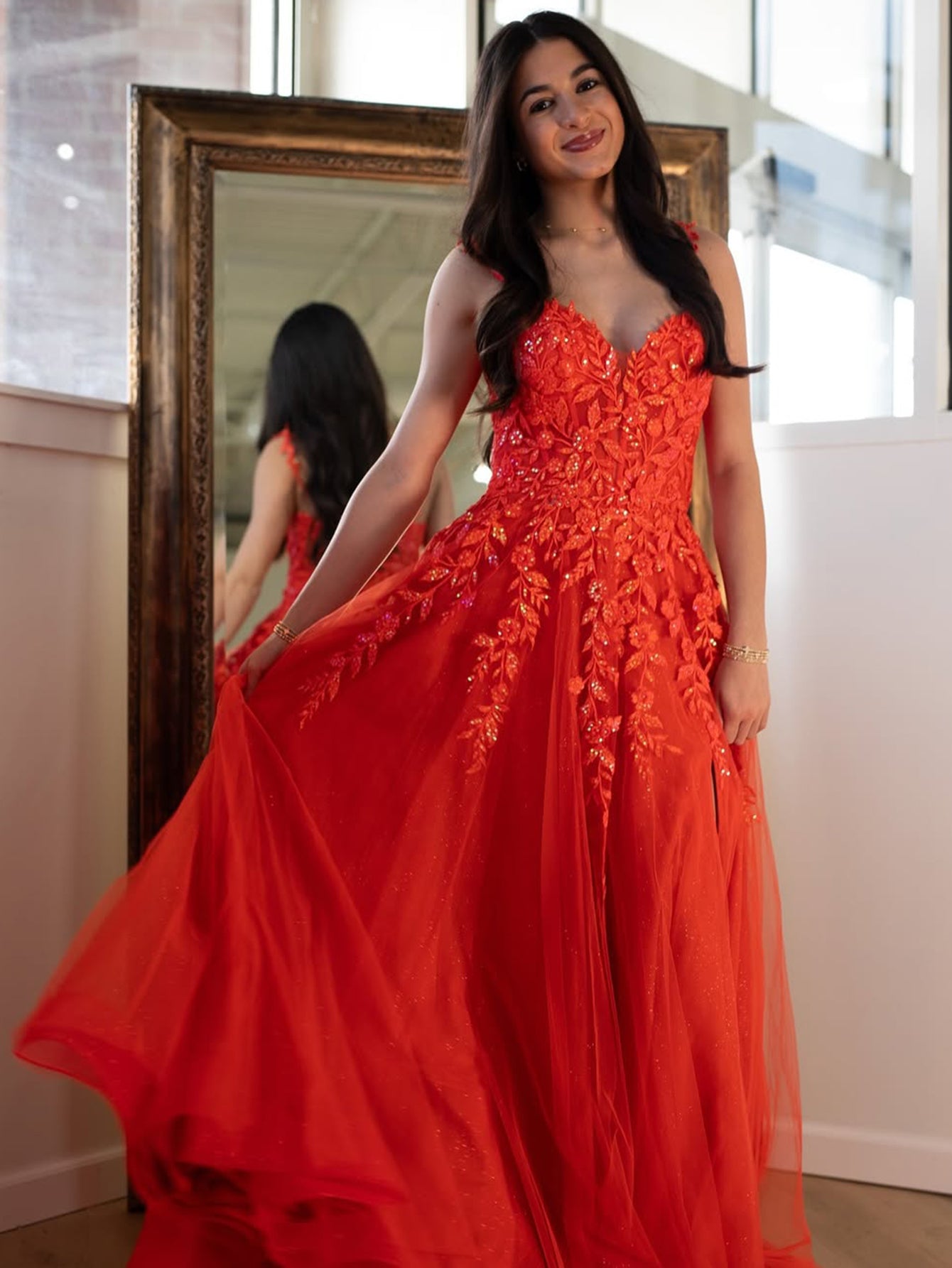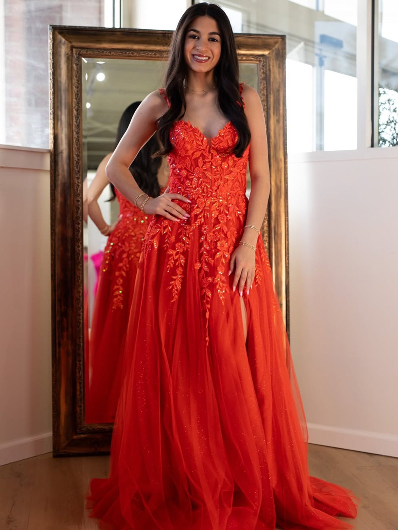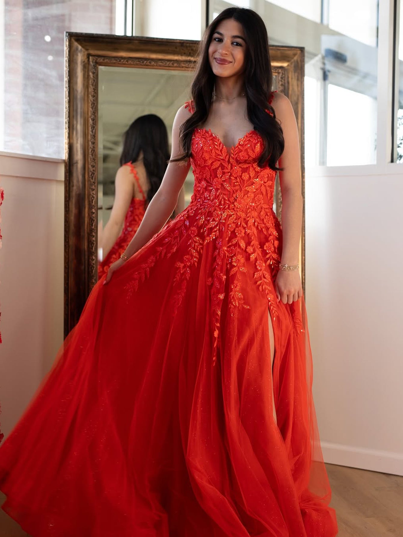 This tulle prom gown features floral embroidery with beading on the bodice. The spaghetti straps dress has a V-neckline and split hem. Worldprom ball gown prom dresses are ideal for party, evening or festivals.