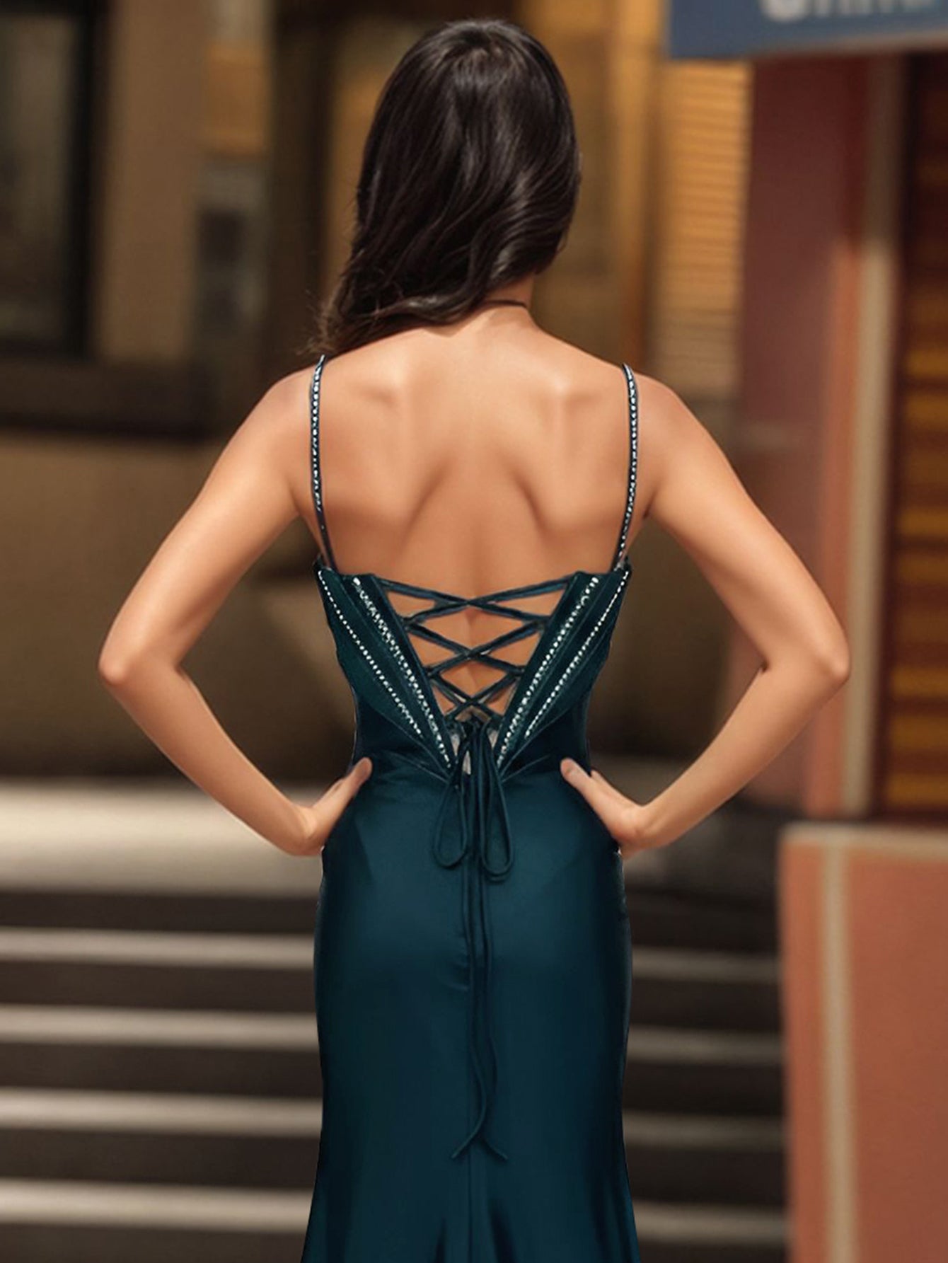 Details: Backless, Lace Up, Crystals, Split, Illusion, Sheer, Pleated