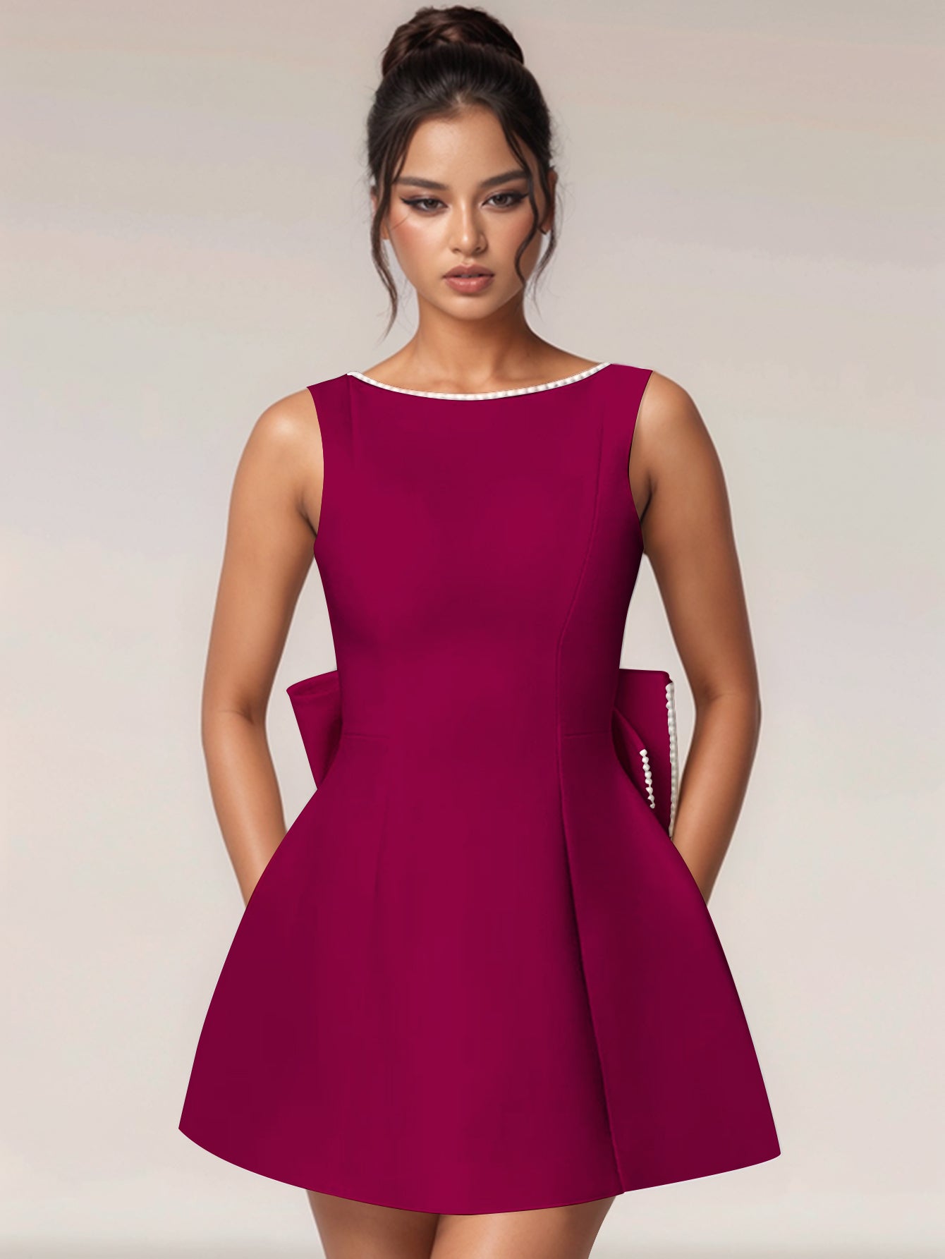 Hand Beading Backless Bow Ball Gown Prom Bridal Mini Dress - Fuchsia
