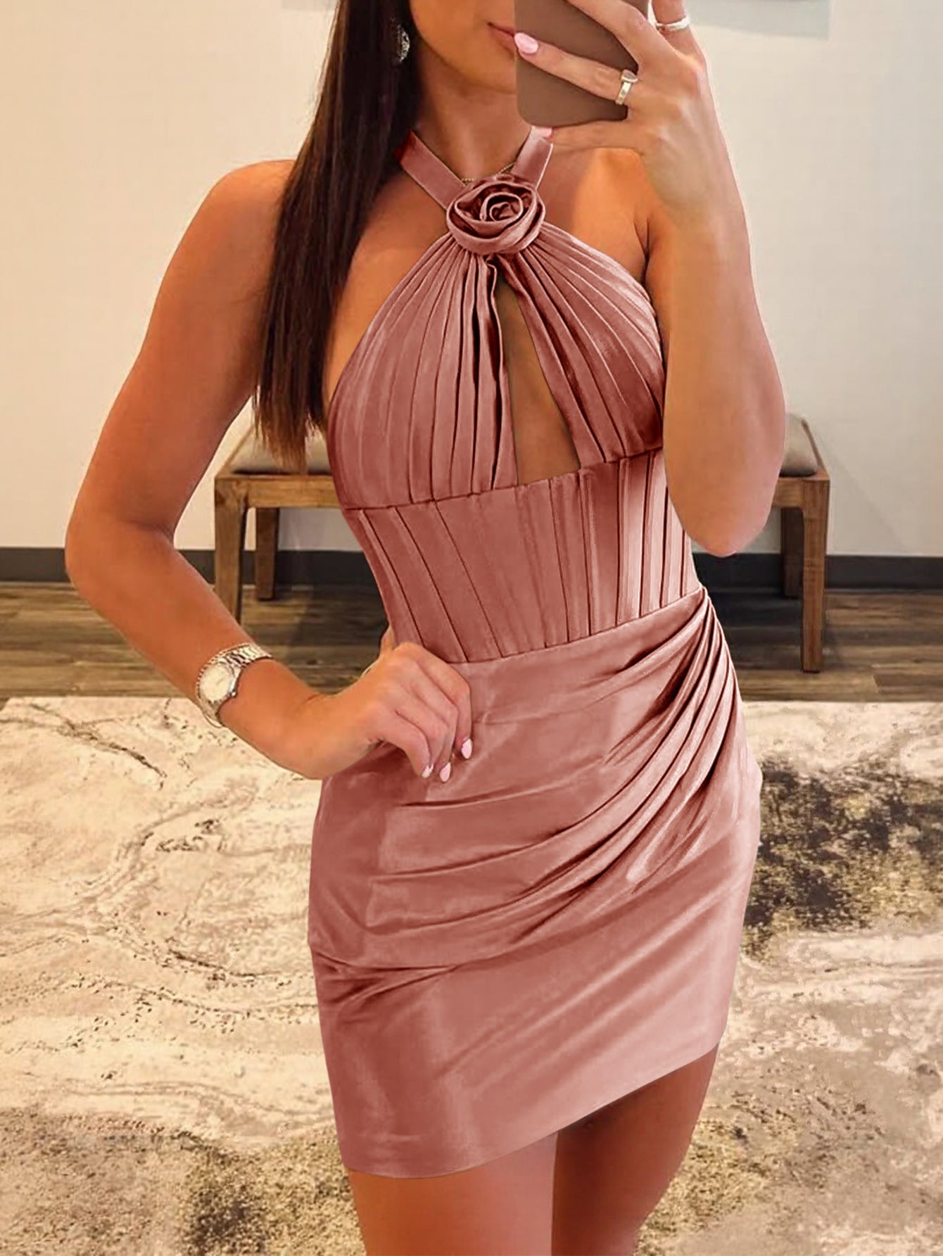 This satin mini prom gown features hand made flower on the bodice. The halter hoco dress has a pleated waist and hem. The short birthday dress is ideal for graduation party, homecoming or prom party.