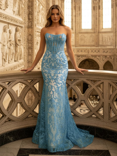 Strapless Illusion Beading Embroidery Bodice Mermaid Prom Dress - Blue