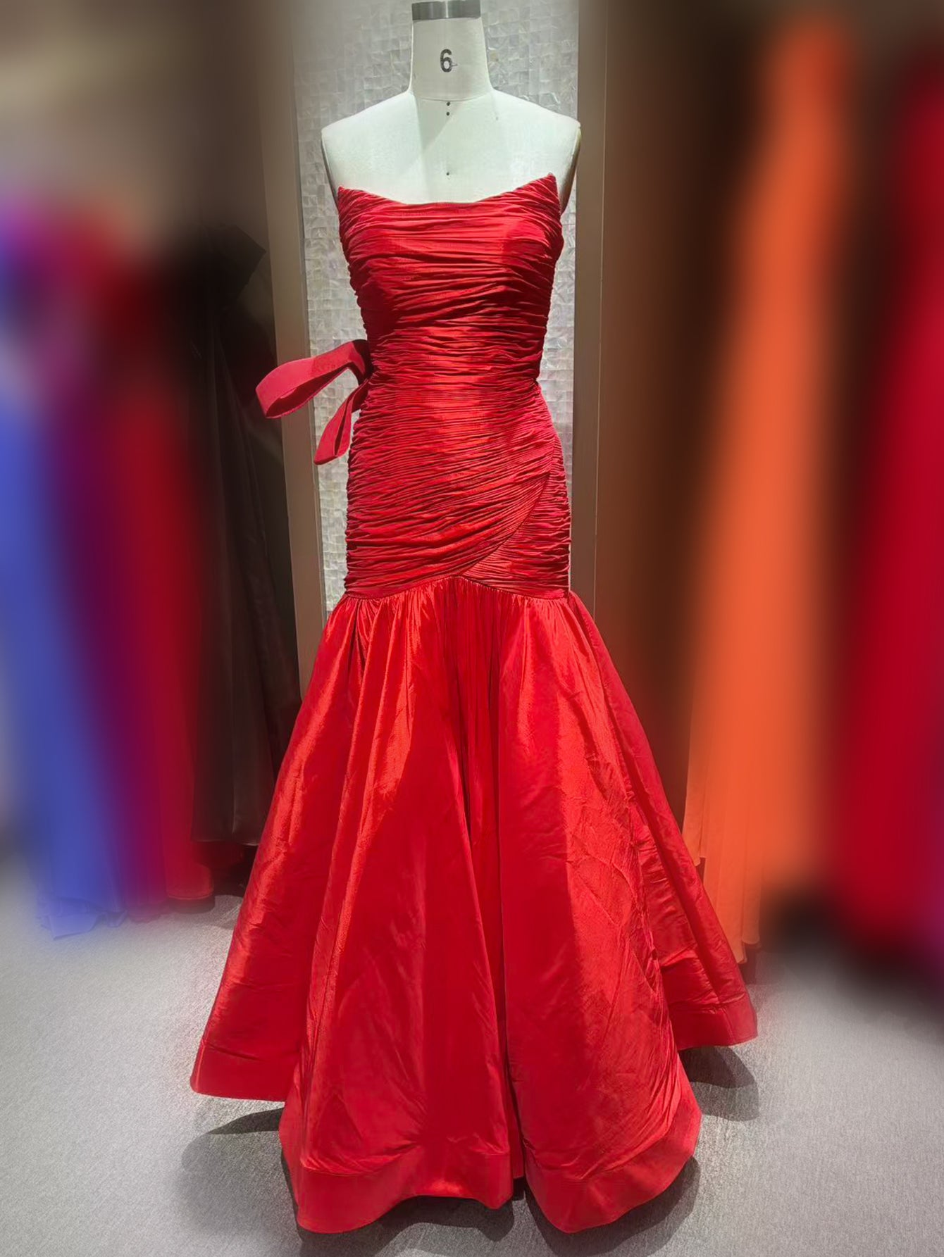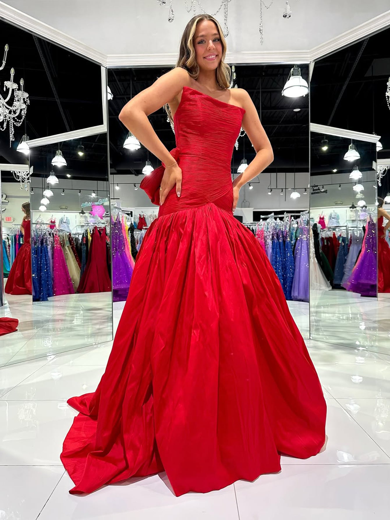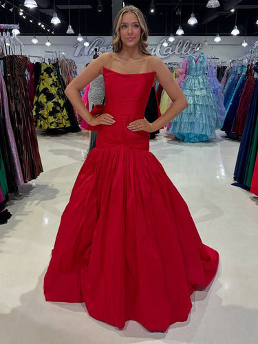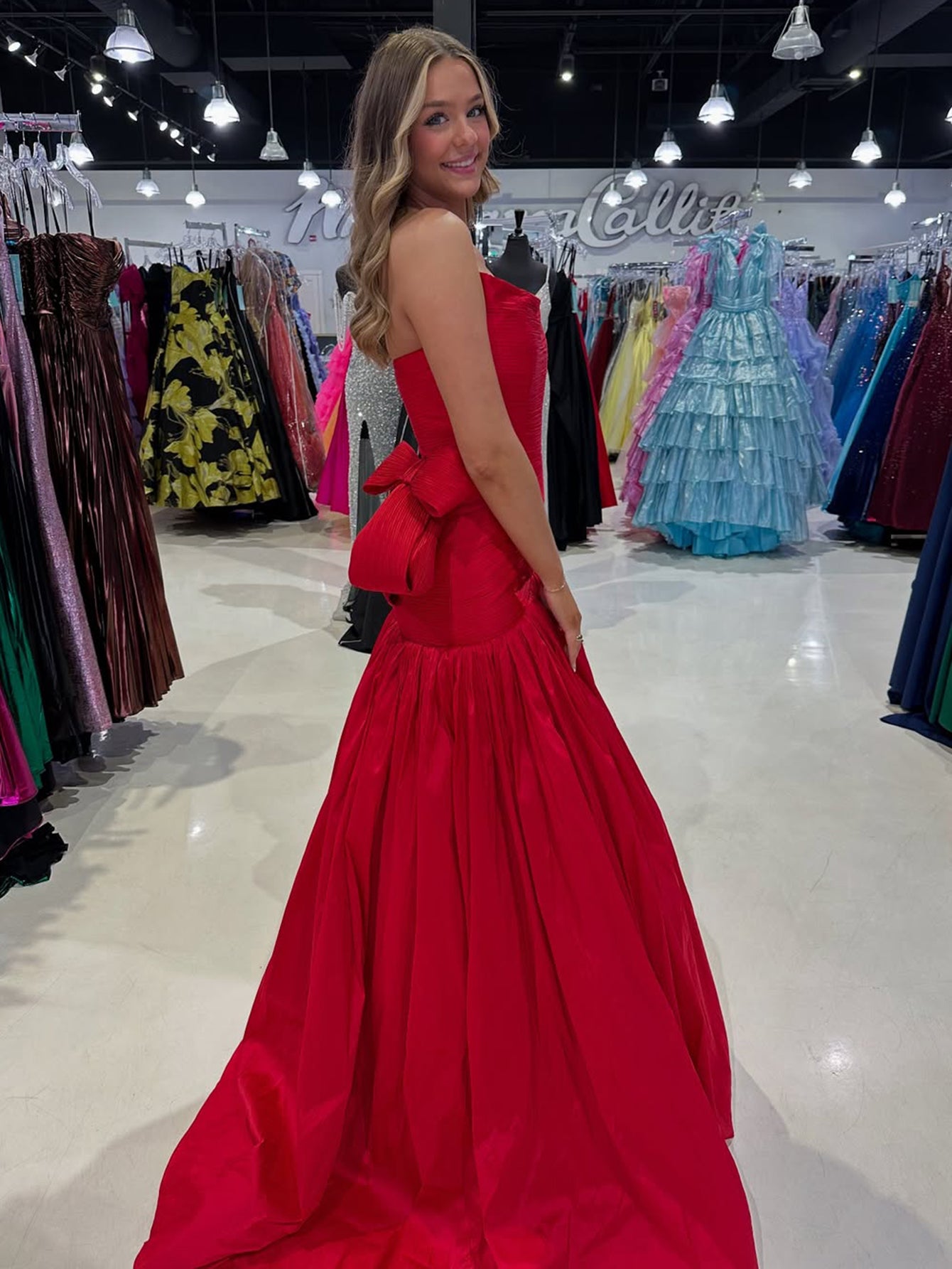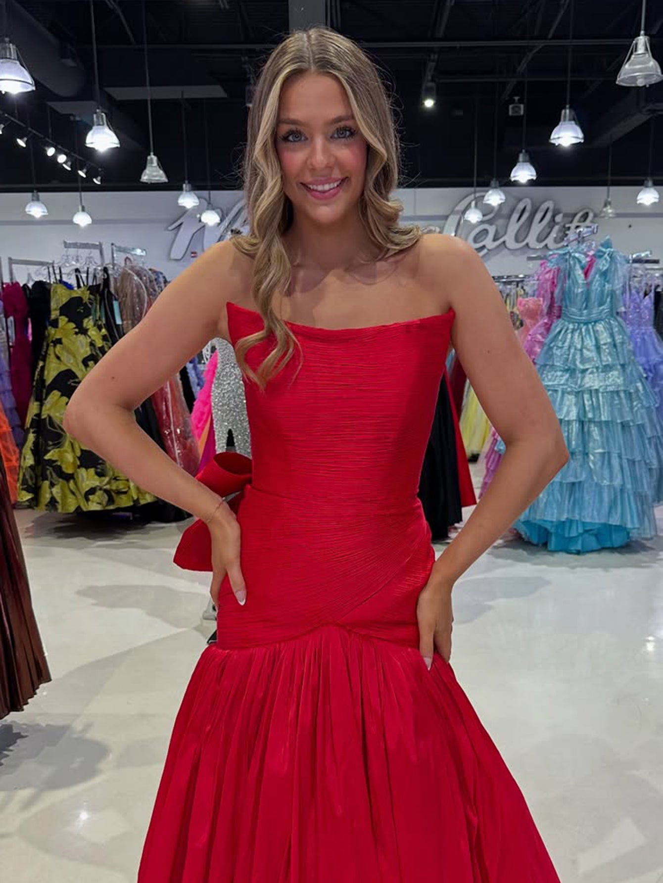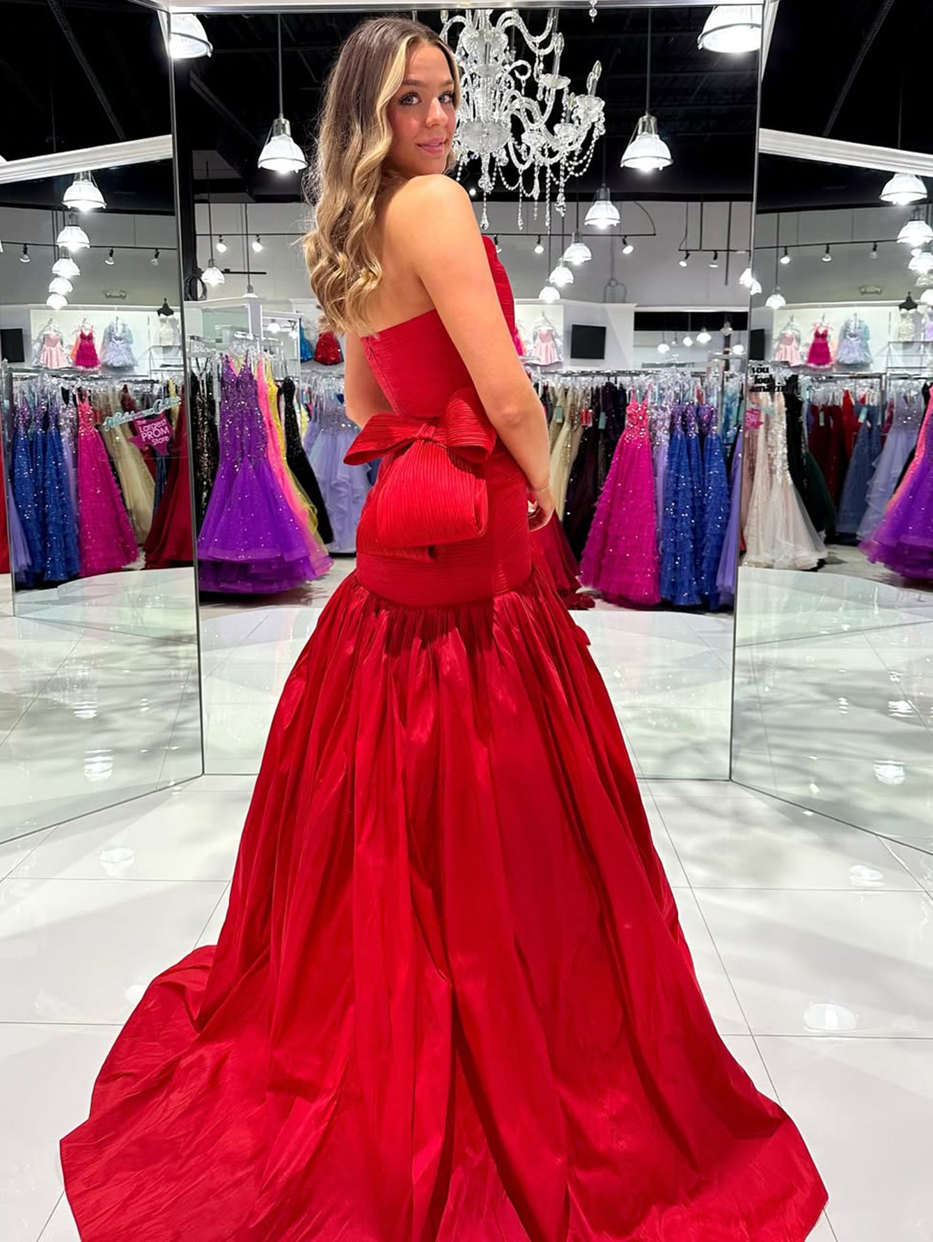 Strapless Ruched Bow Back Bodice Ball Gown Prom Dress - Red