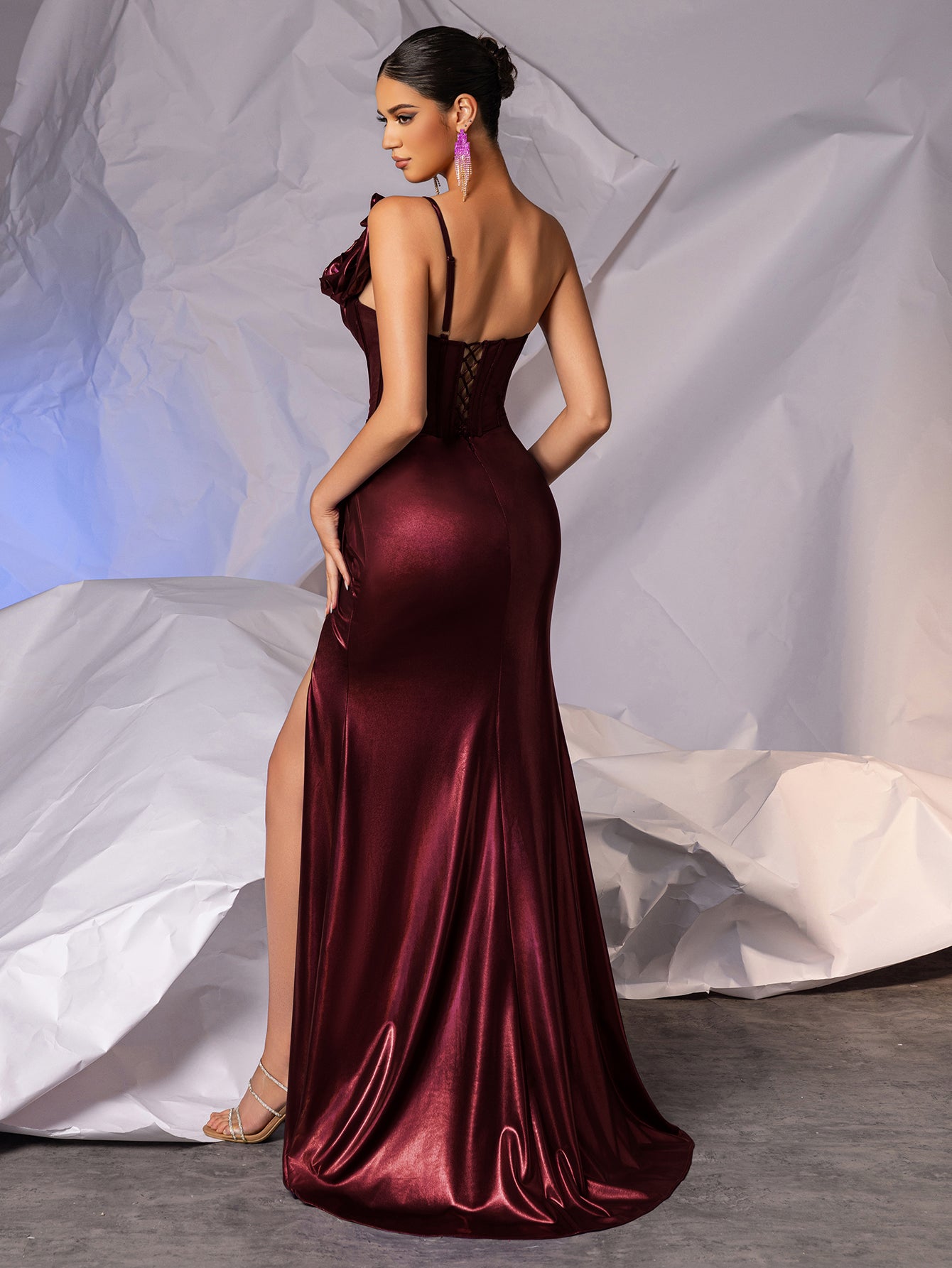3D Rose Sheer Bodice Boned Satin Mermaid Prom Dress Long - Deep Burgundy