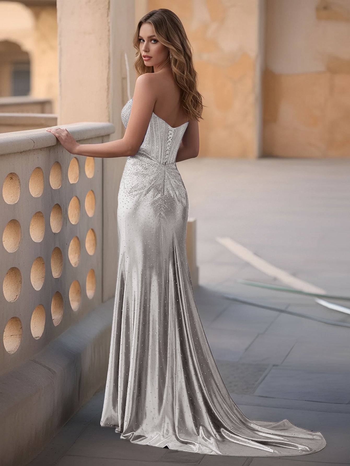 Luxury Hot Fix Boned Bodice Strapless Mermaid Evening Dress - Silver