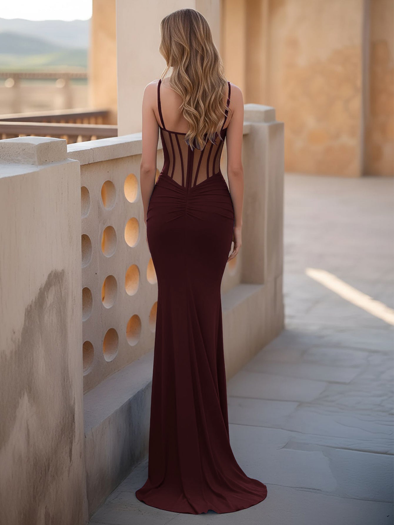This satin evening dress features pleats on a sheer net bodice. The spaghetti straps prom dress has a deep v-neck. This sexy mermaid dress for cocktail is ideal for party, evening or festivals.