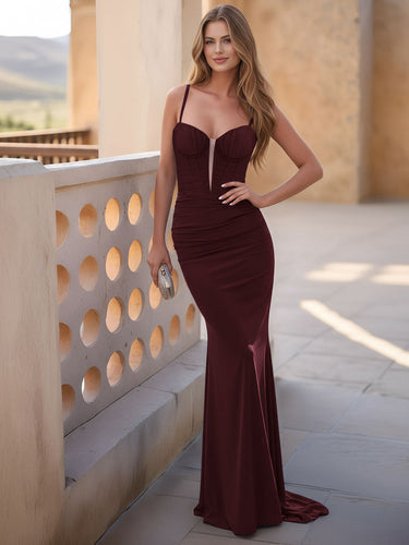 Pleats Deep V-Neck Spaghetti Strap Mermaid Prom Dress - Burgundy