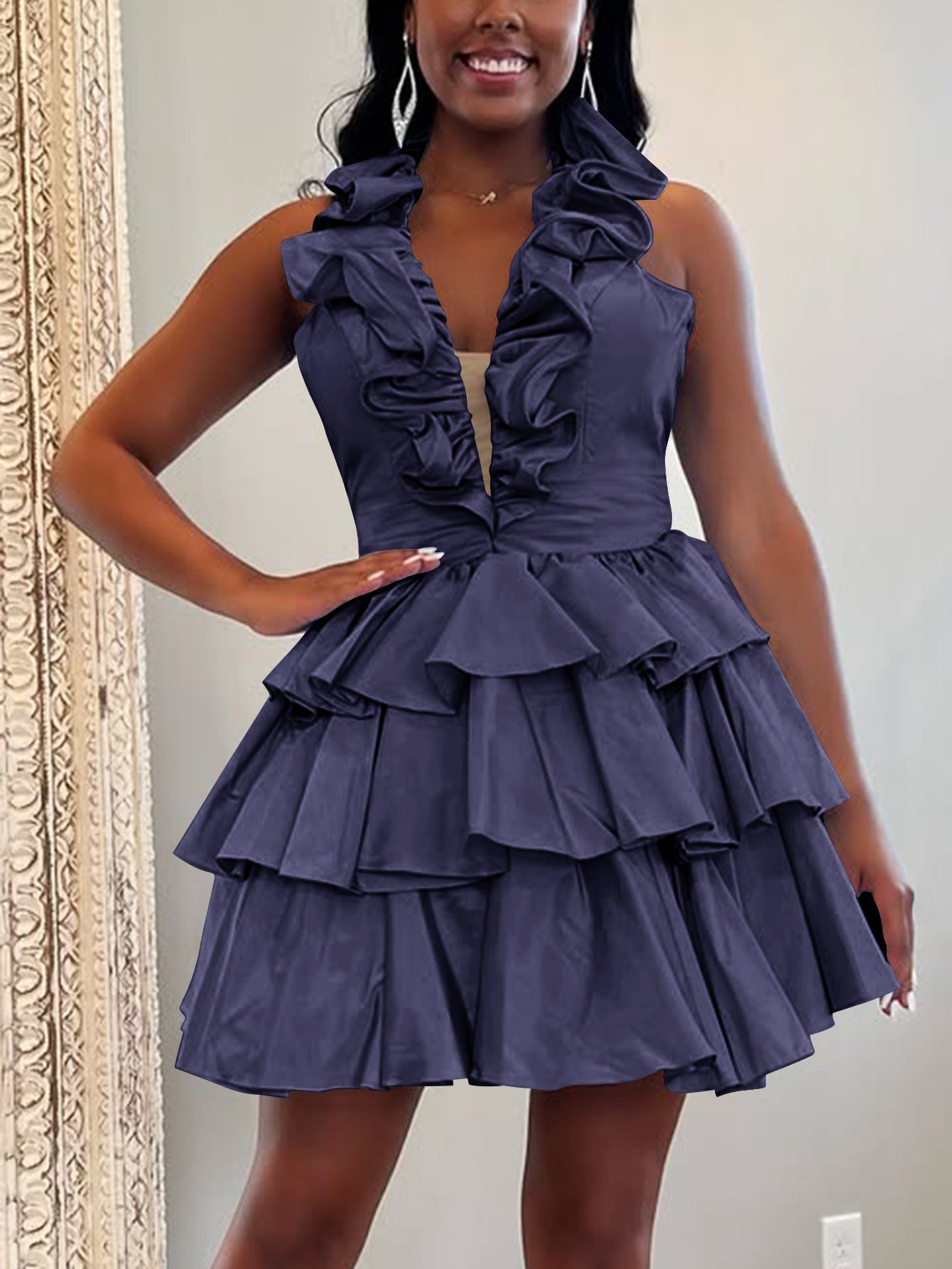 This satin short prom dress features shoulder ruffle on the bodice. The halter mini dress has a deep v-neck and ruffled hem. The blue puffy dress is ideal for graduation party, homecoming or prom party.