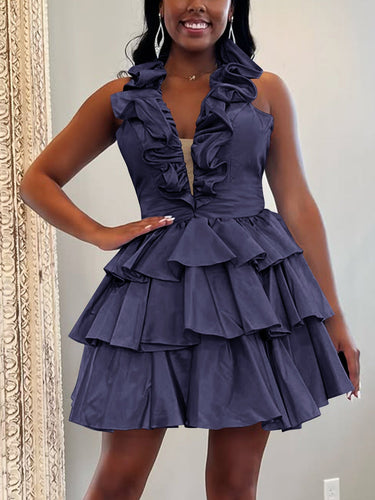 Ruffle Halter Deep V-Neck Satin Mini Prom Dress - Purple