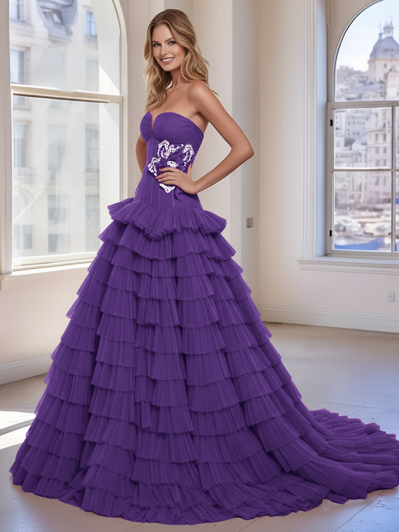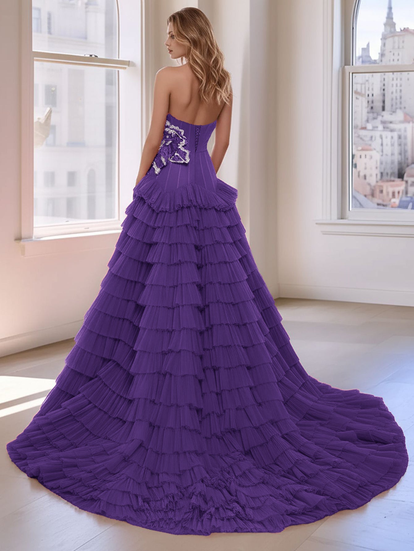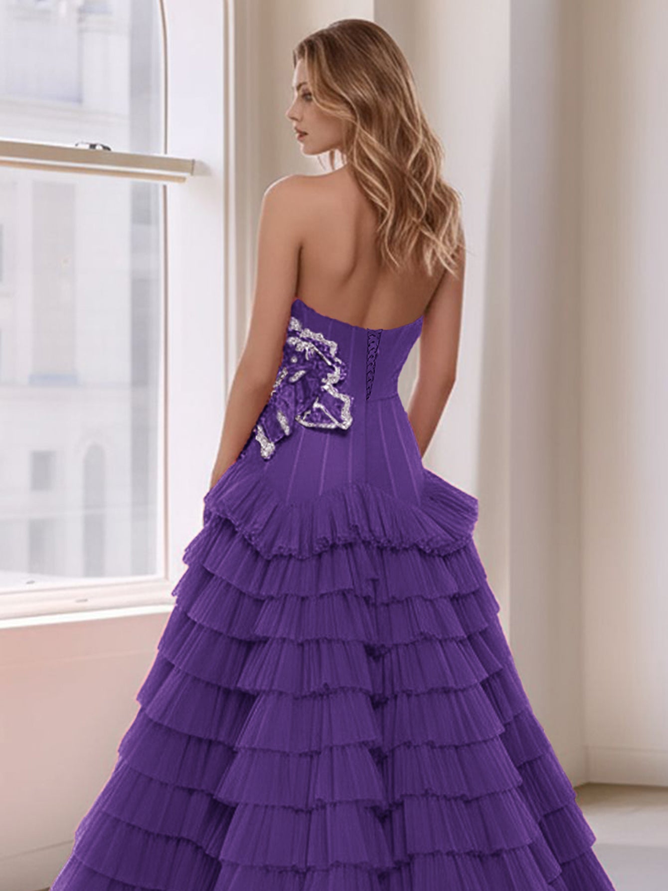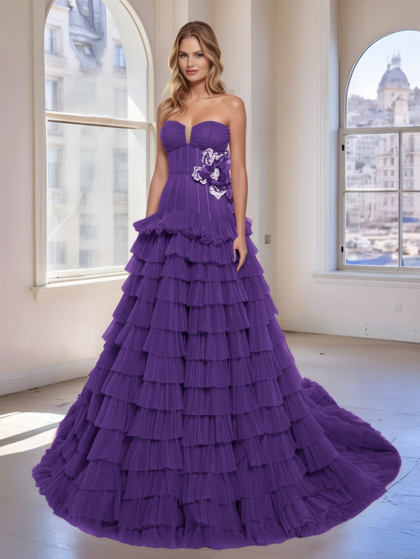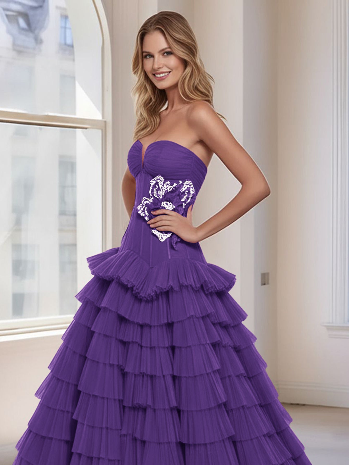 This purple evening ball gown features tulle with 3d rose on the bodice. The strapless prom gown has a sweetheart neck and layered ruffle hem. This luxury dubai evening gown is ideal for party, evening or homecoming events.