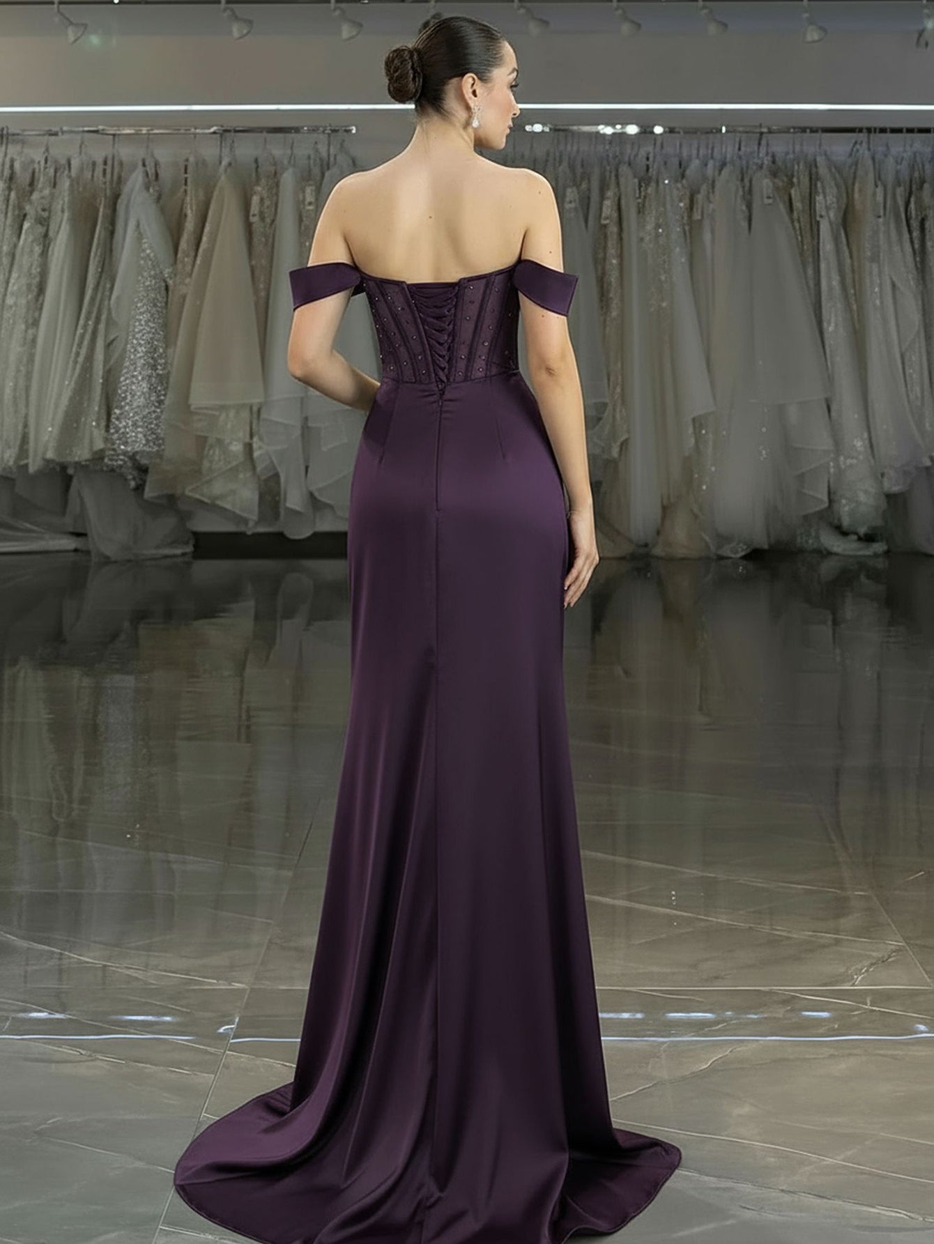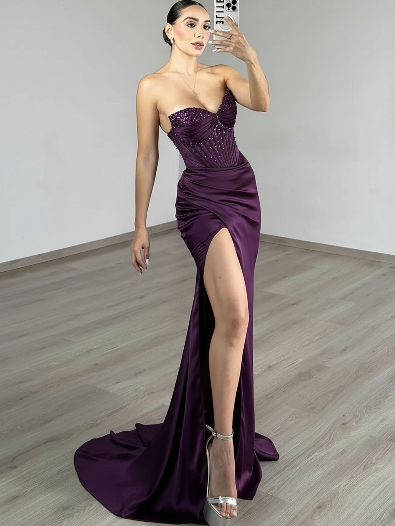 Beaded Strapless Illusion Bodice Mermaid Prom Dress Long - Purple