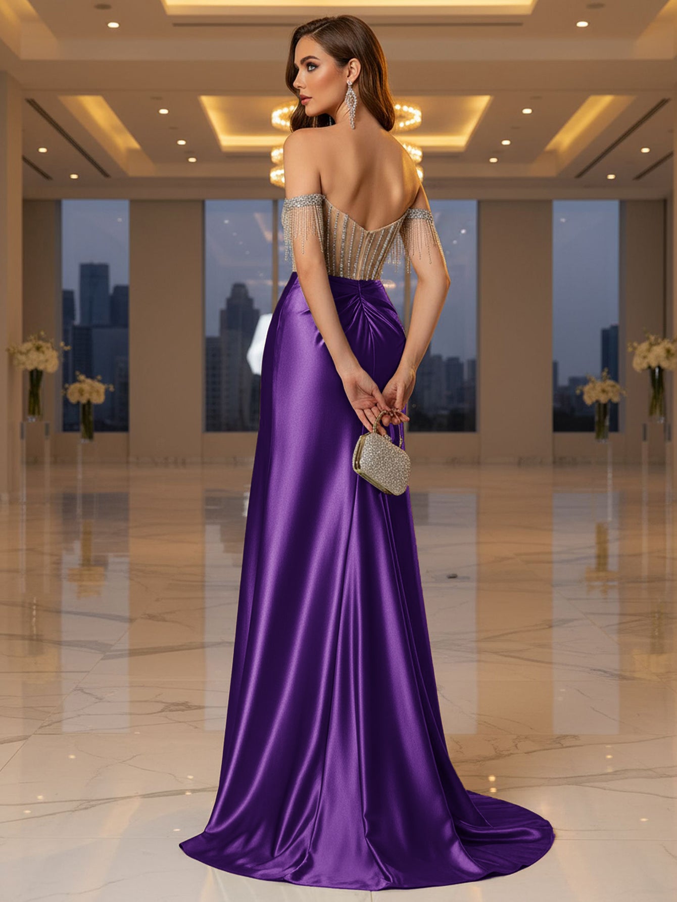 This sexy satin prom gown features hand beading with fringe on the bodice. The off-shoulder formal dress has a sweetheart neckline and pleated split hem. This mermaid cocktail dress is ideal for party, evening or festivals.