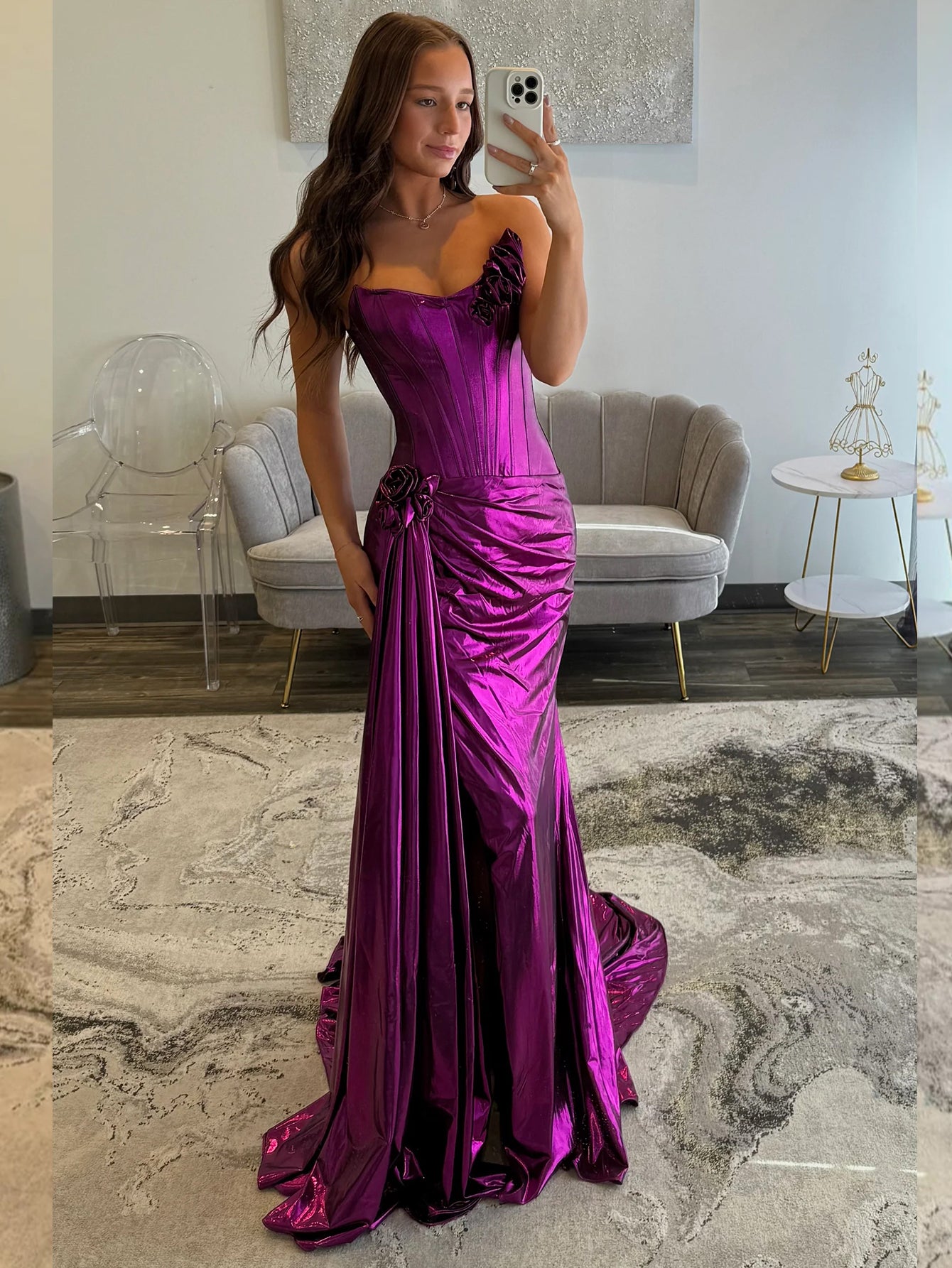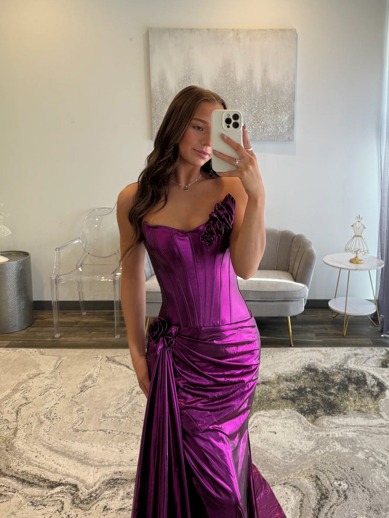 Hand Made Flowers Boned Strapless Mermaid Prom Dress With Drop - Purple