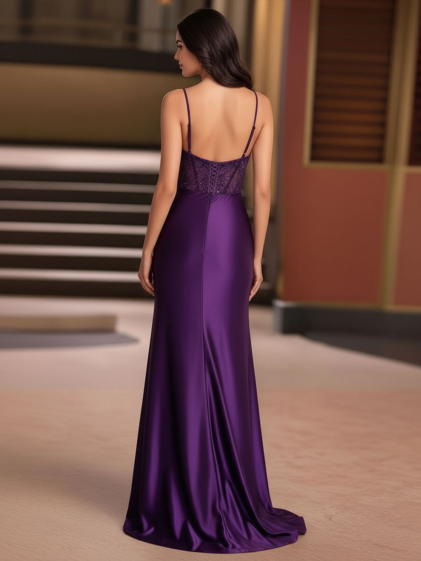 This long prom gown features lace embroidery on the illusion bodice. The strapless maxi dress has a V-neckline and twist hem. Mermaid split formal dresses are ideal for party, evening or festivals.