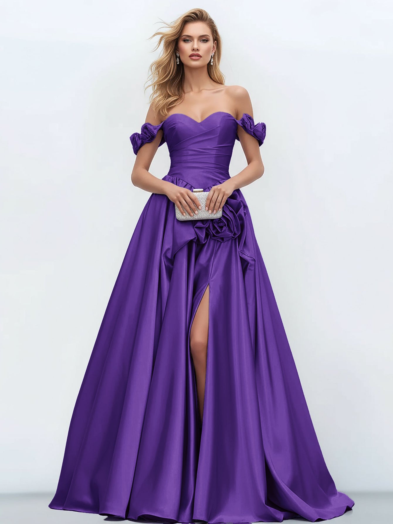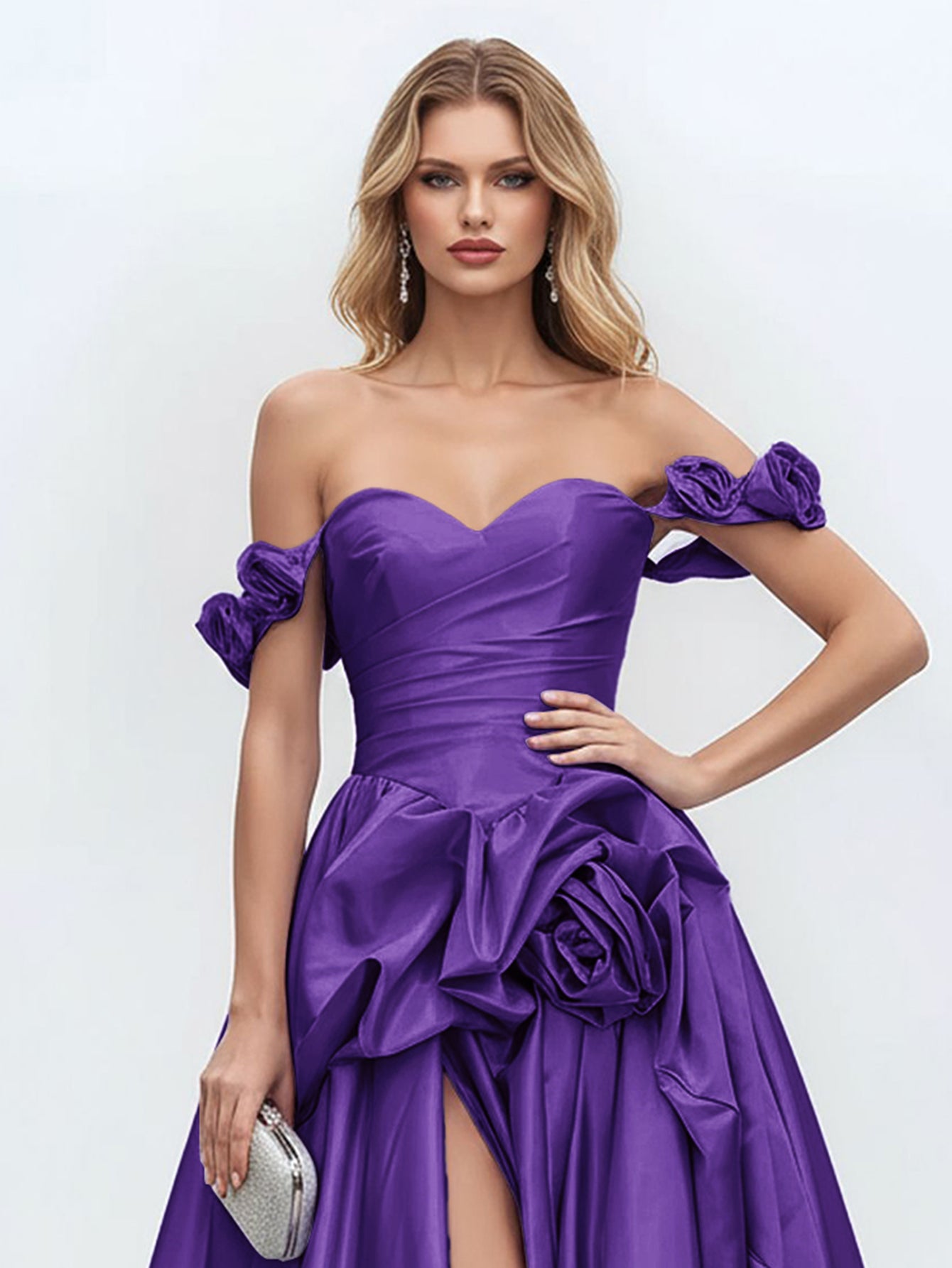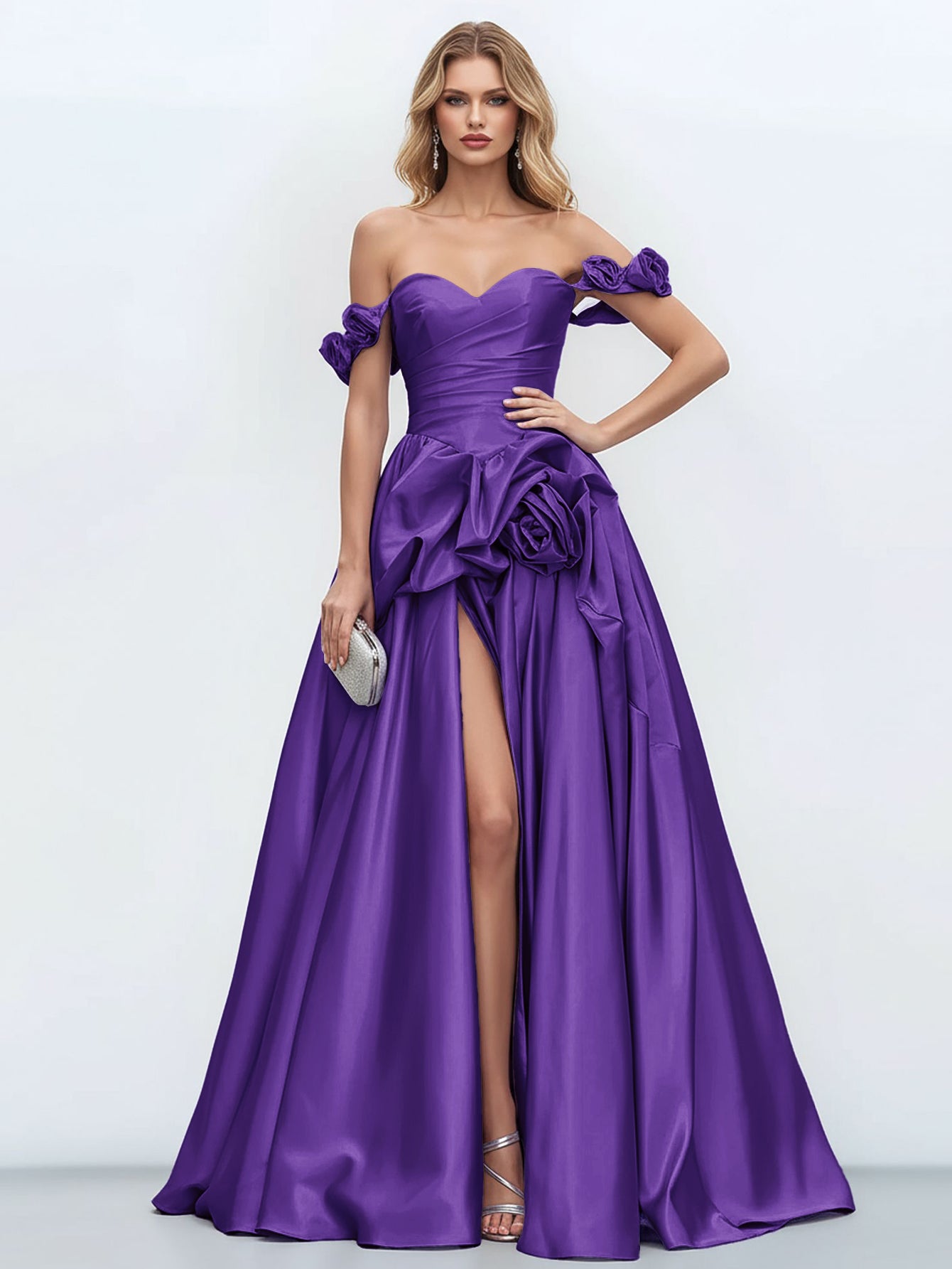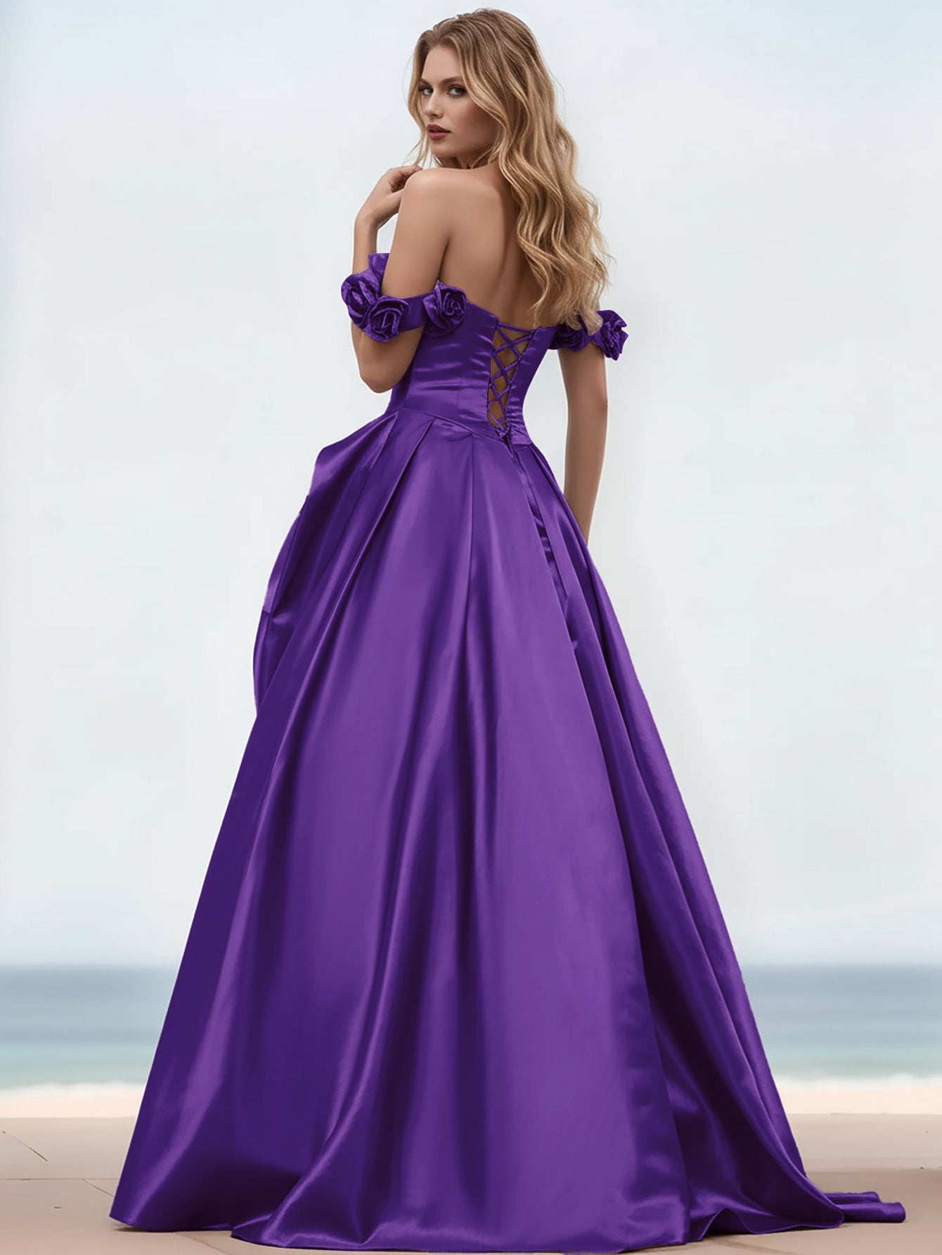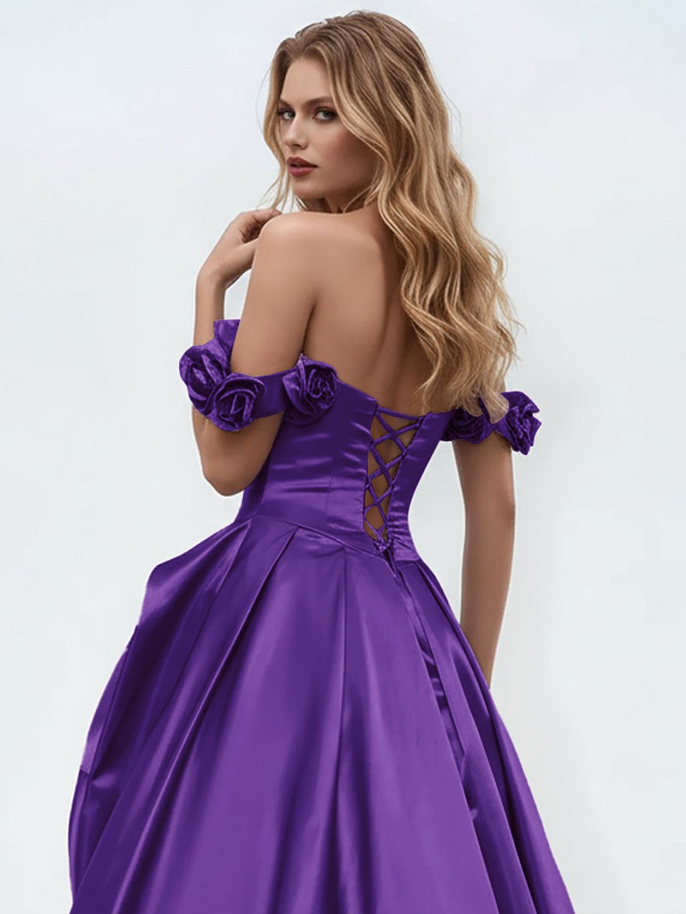 Off Shoulder 3D Rose Pick Up Satin Ball Gown Evening Dress - Purple