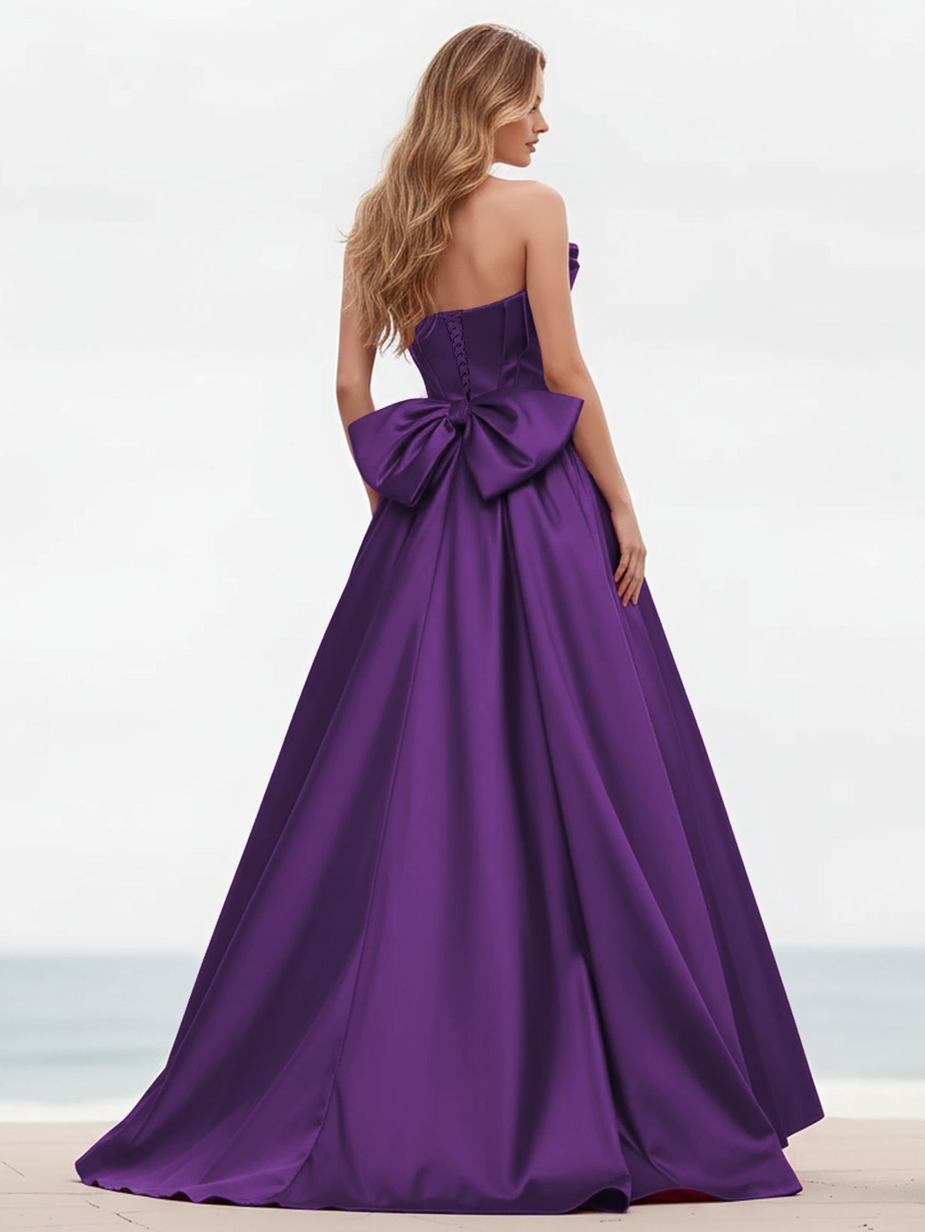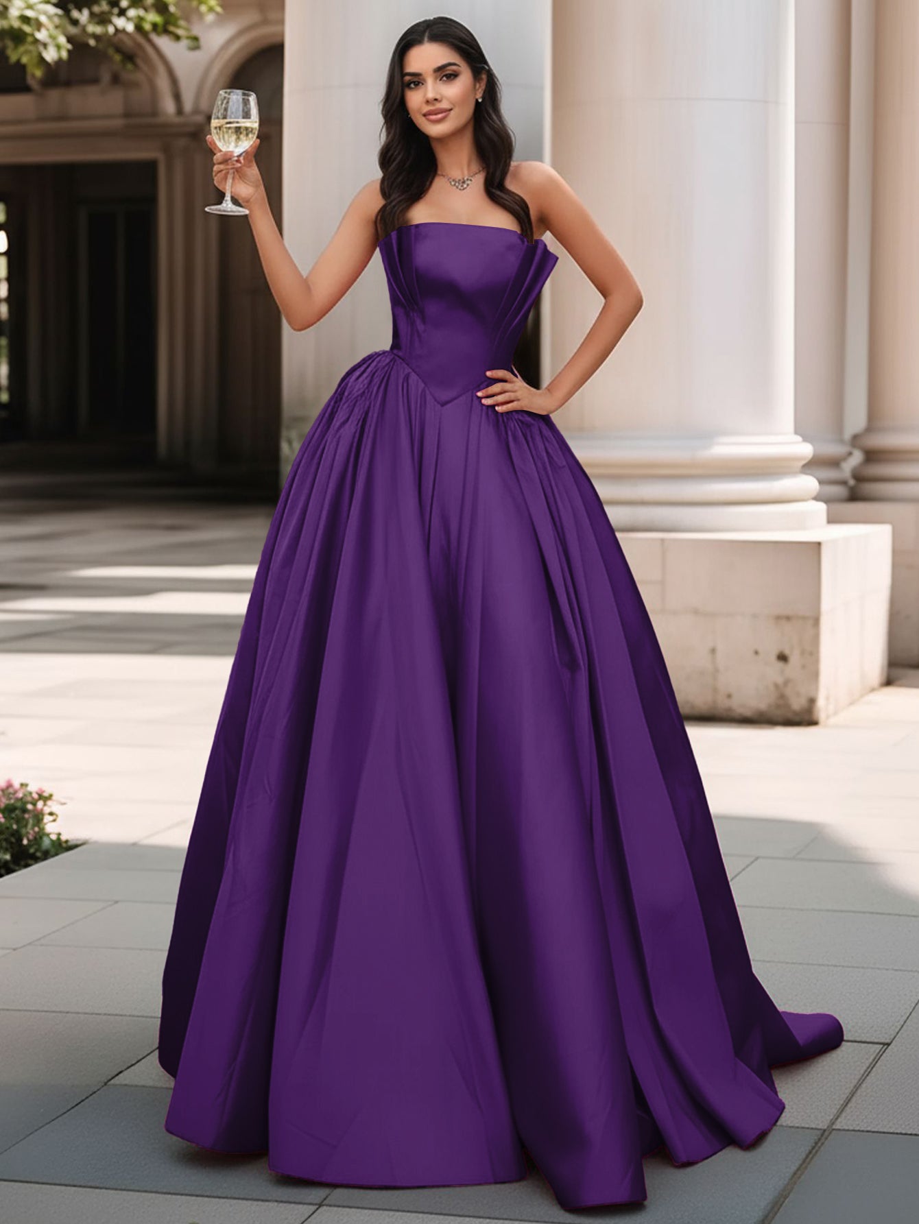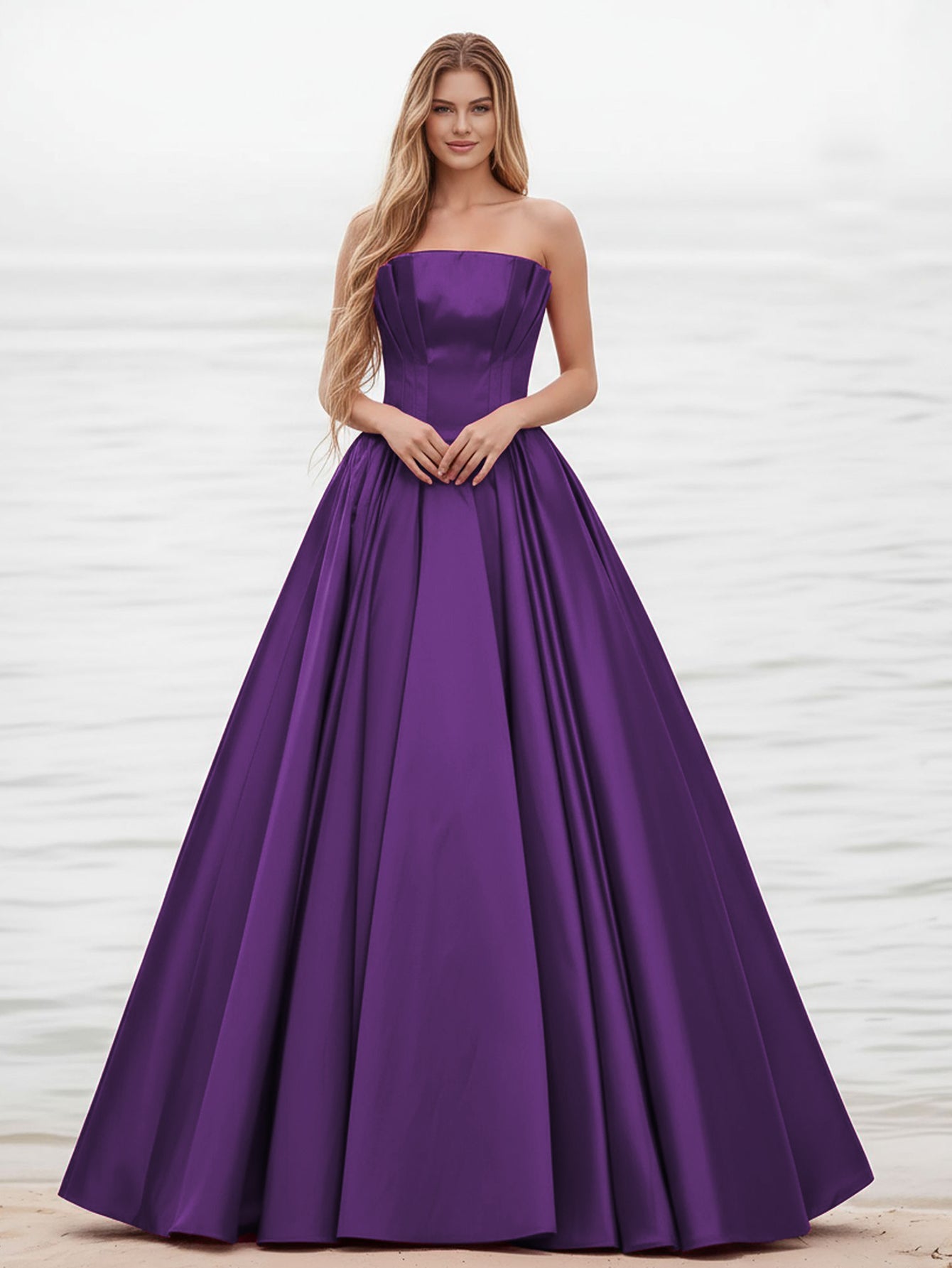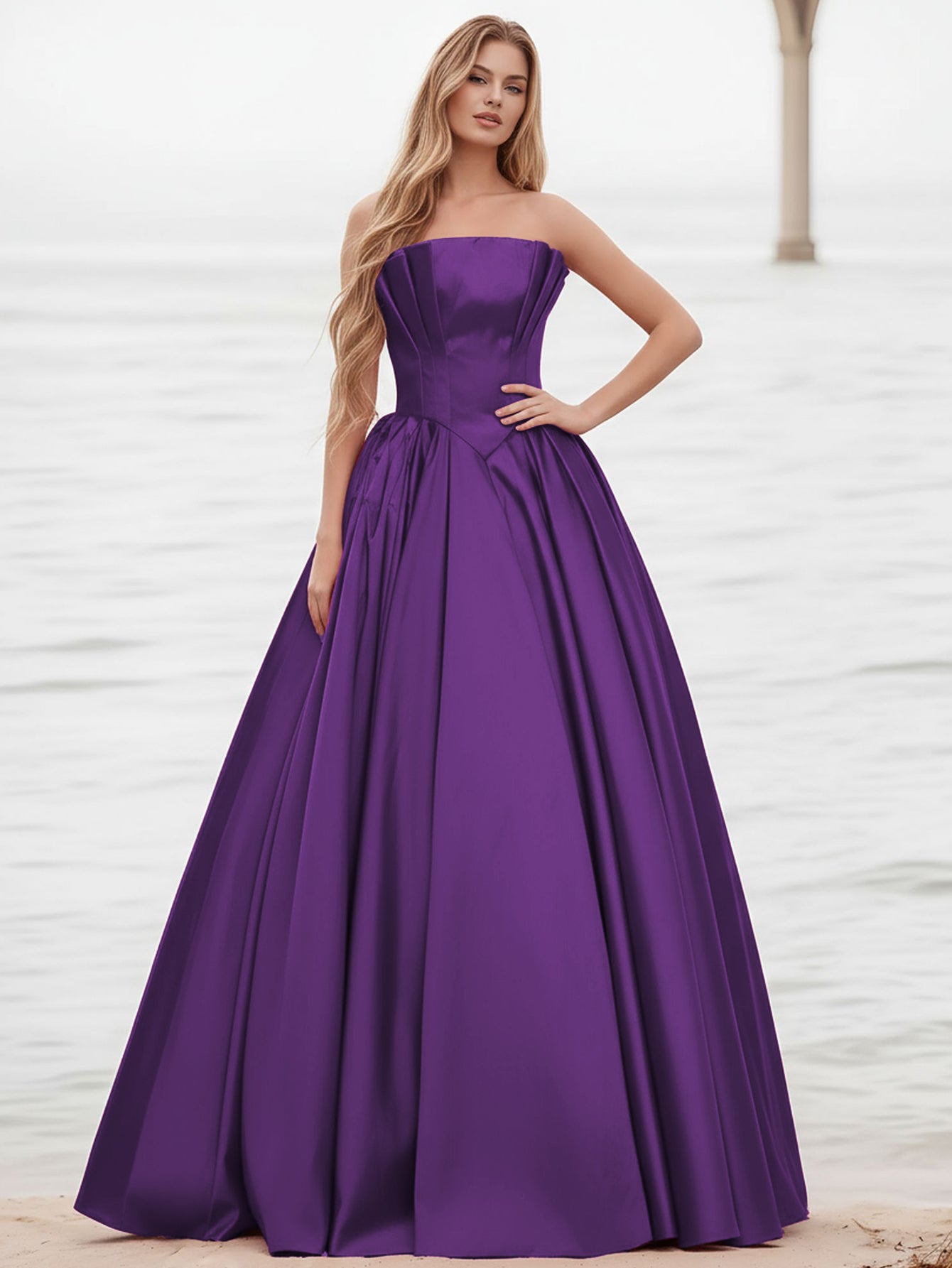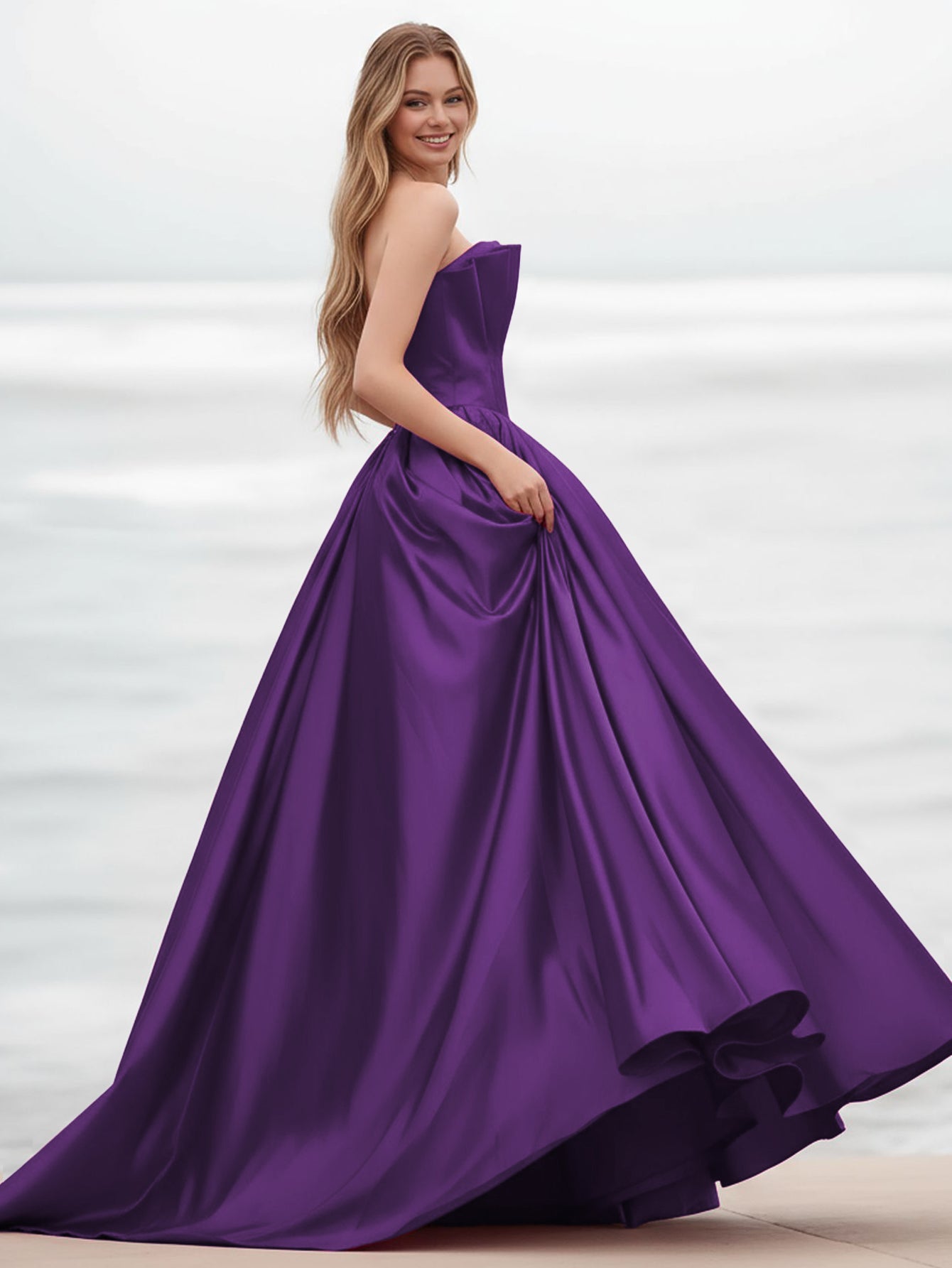 Pleated Bust Ruffle Hem Strapless Satin Prom Ball Gown - Purple