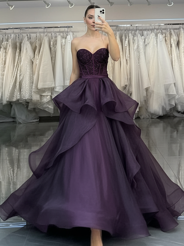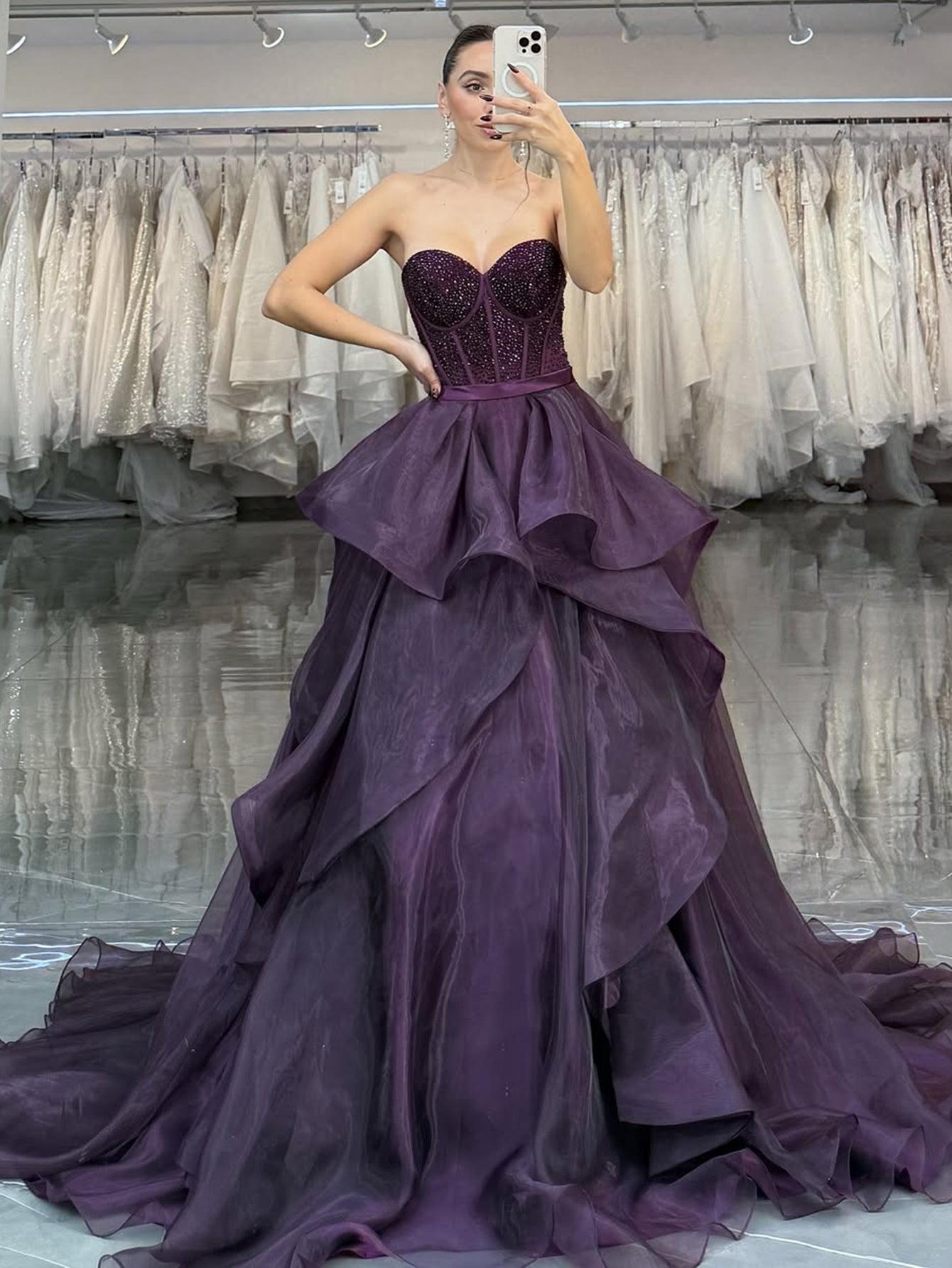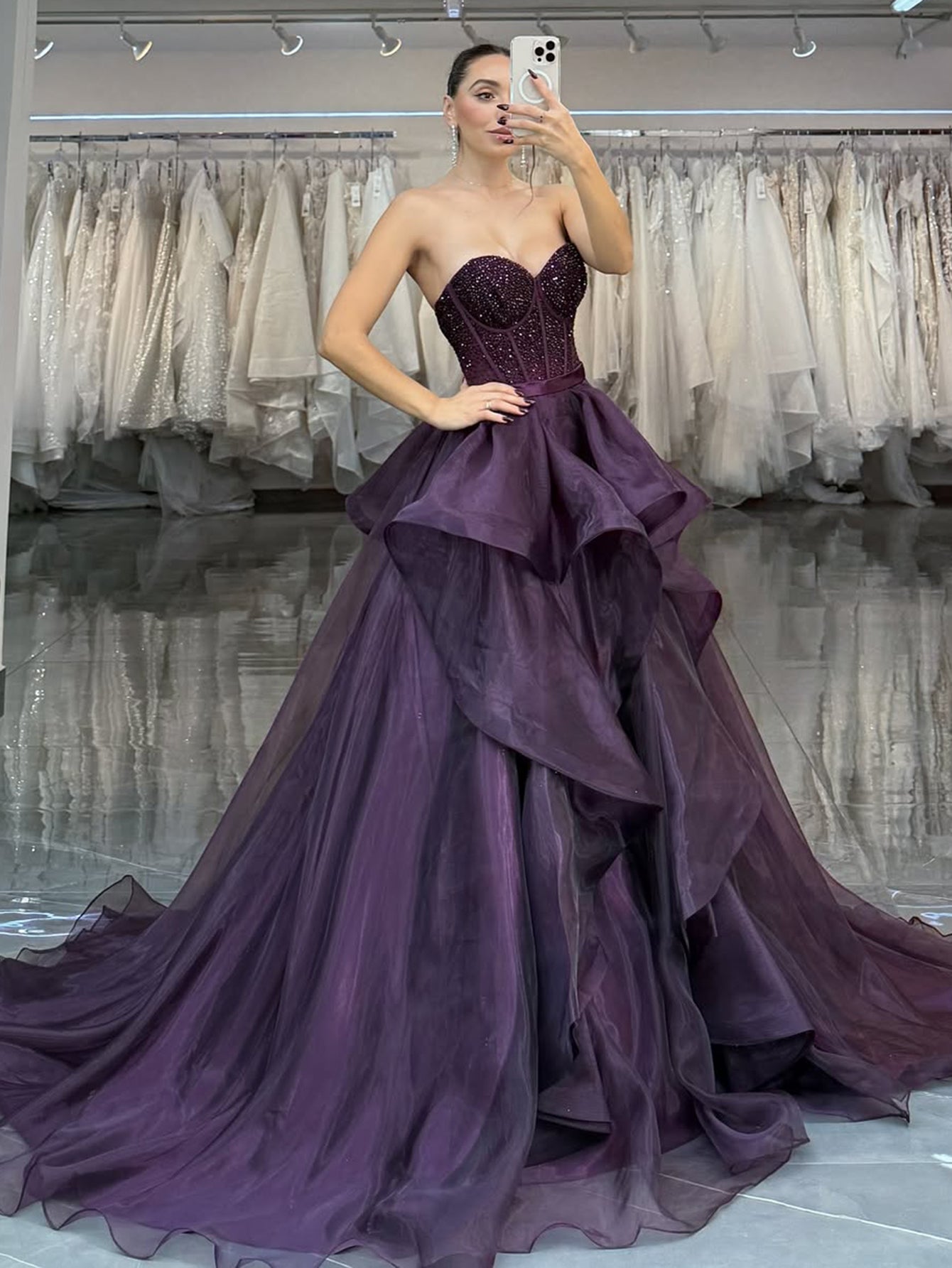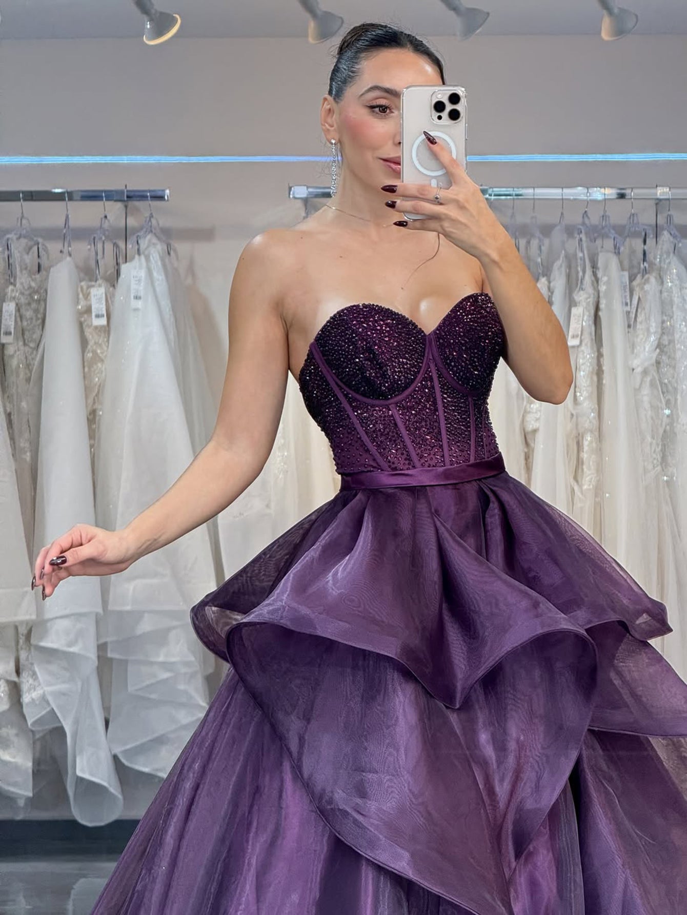 Strapless Beading Lace Up Layered Bodice Ball Gown Prom Dress - Purple