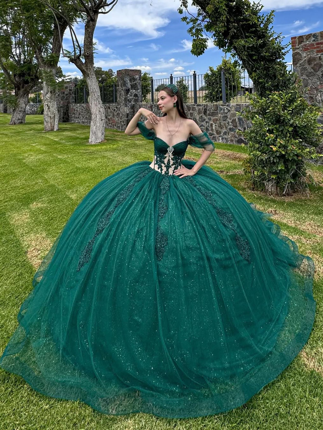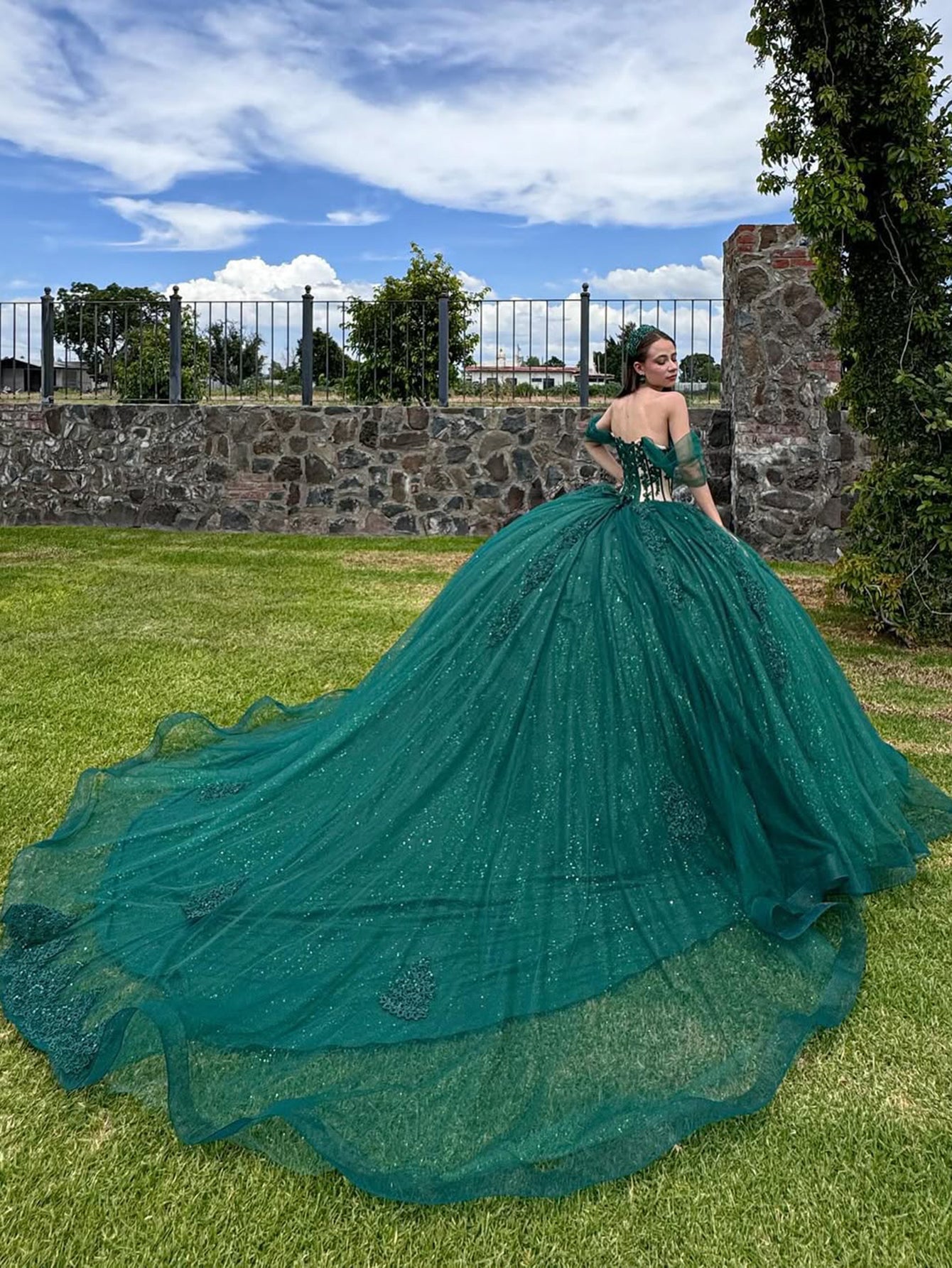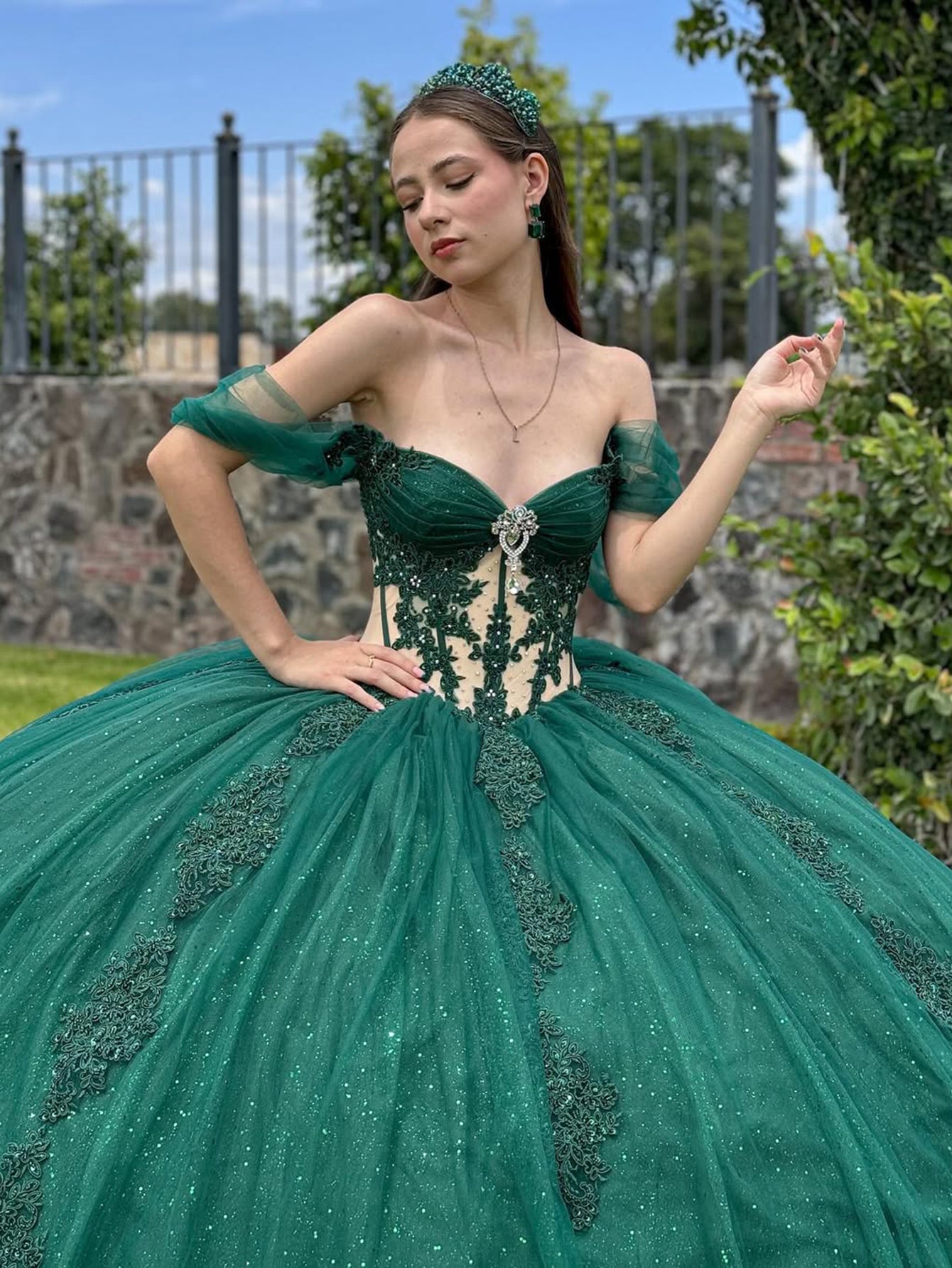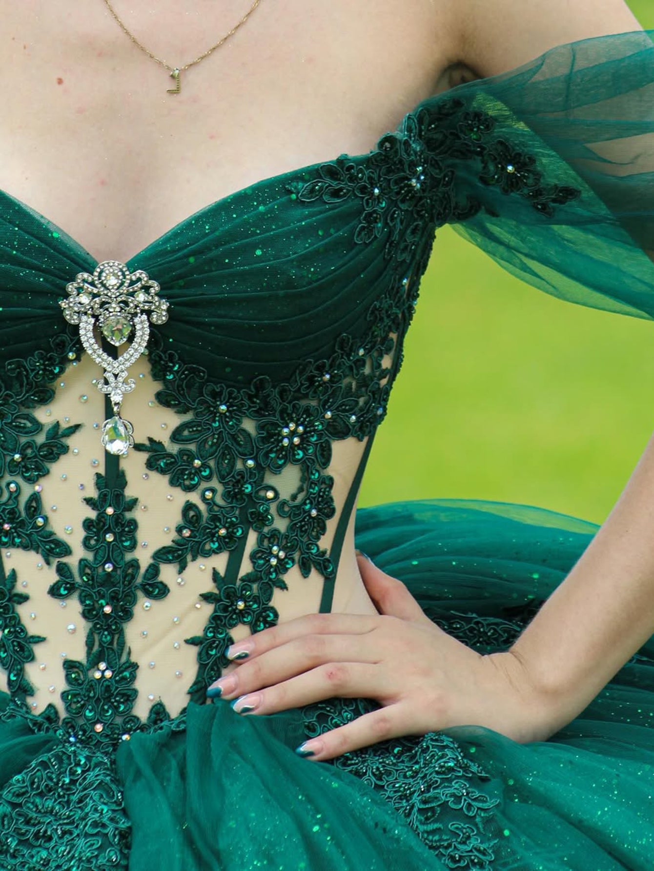 Hot Fix Crystal Ruched Off Shoulder Sheer Bodice Long Quinceanera Dress- Green