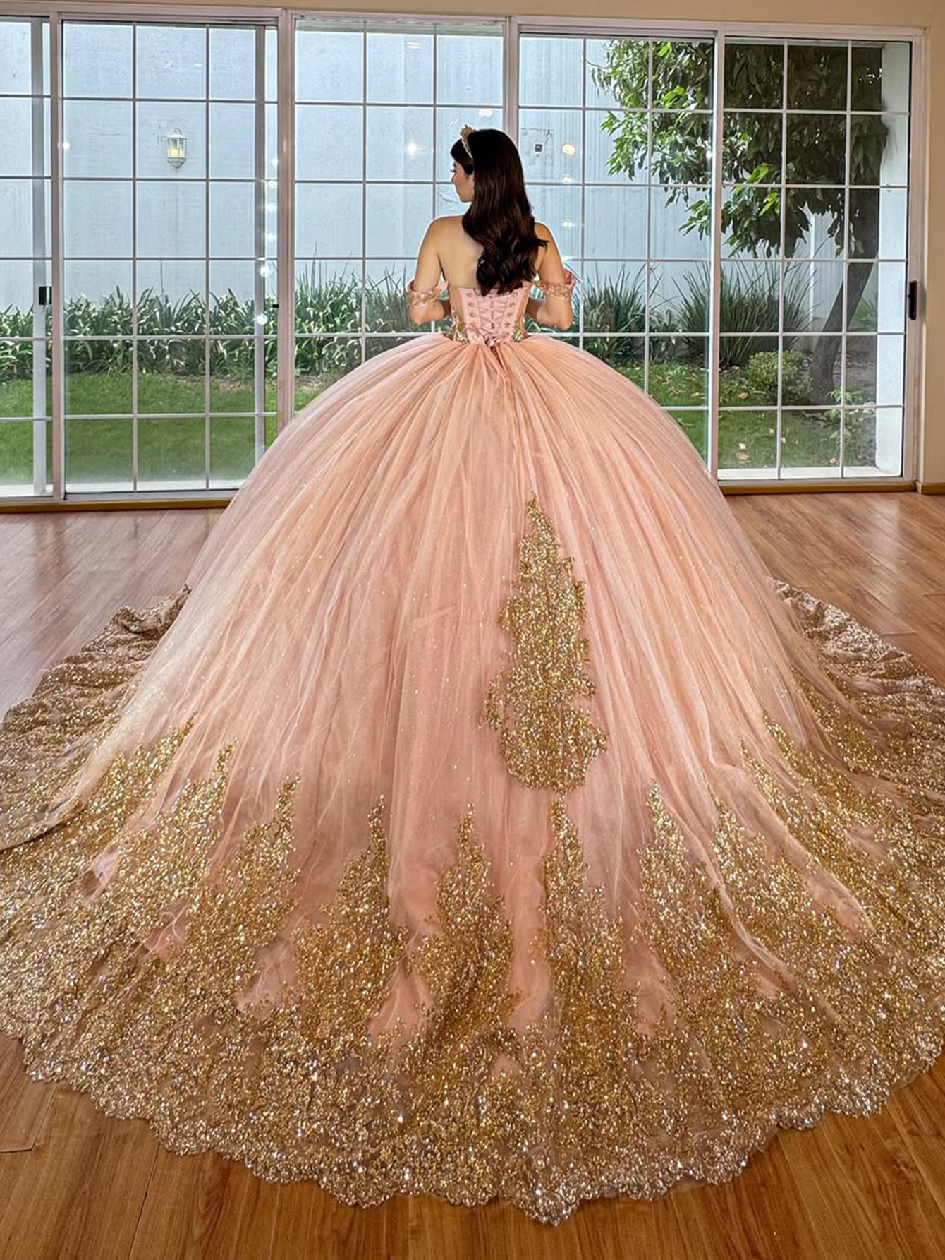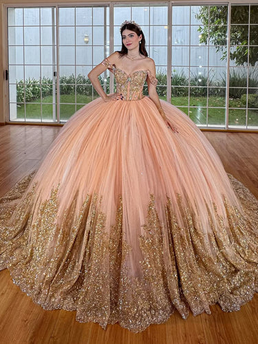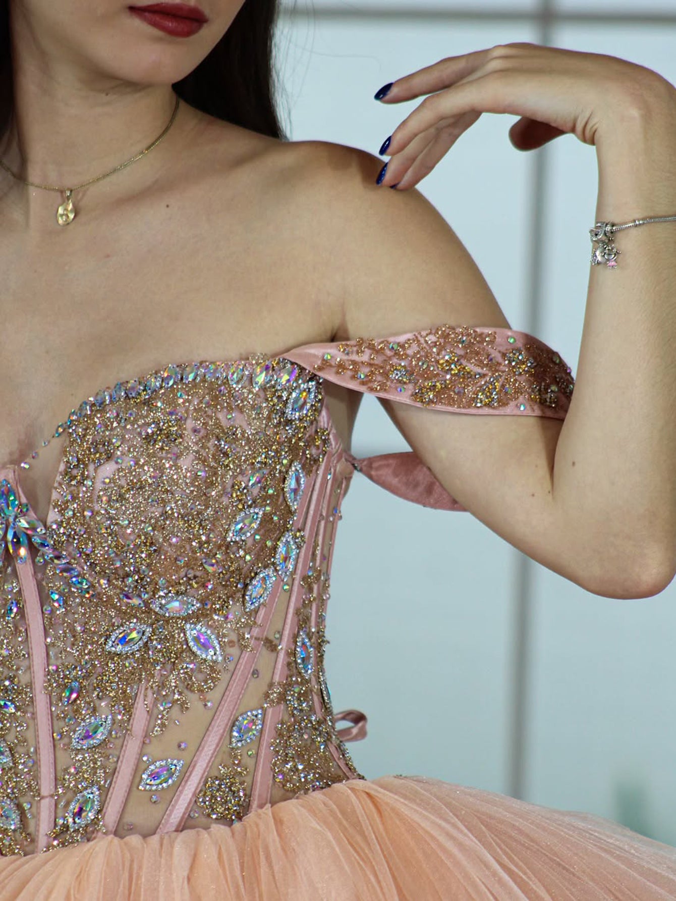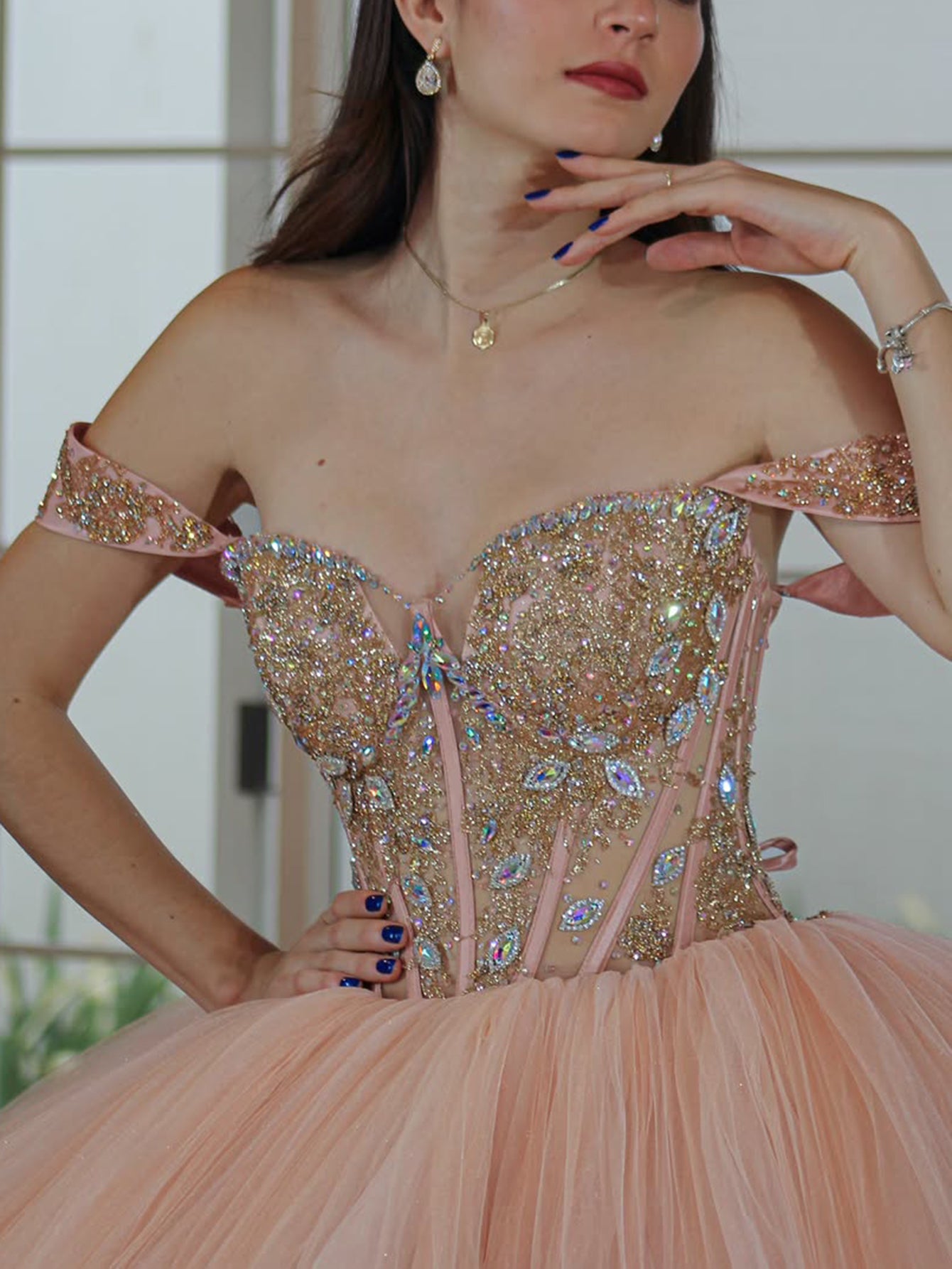Lace Up Off Shoulder Embroidery Bodice Rhinestone Long Quinceanera Dress - Peach