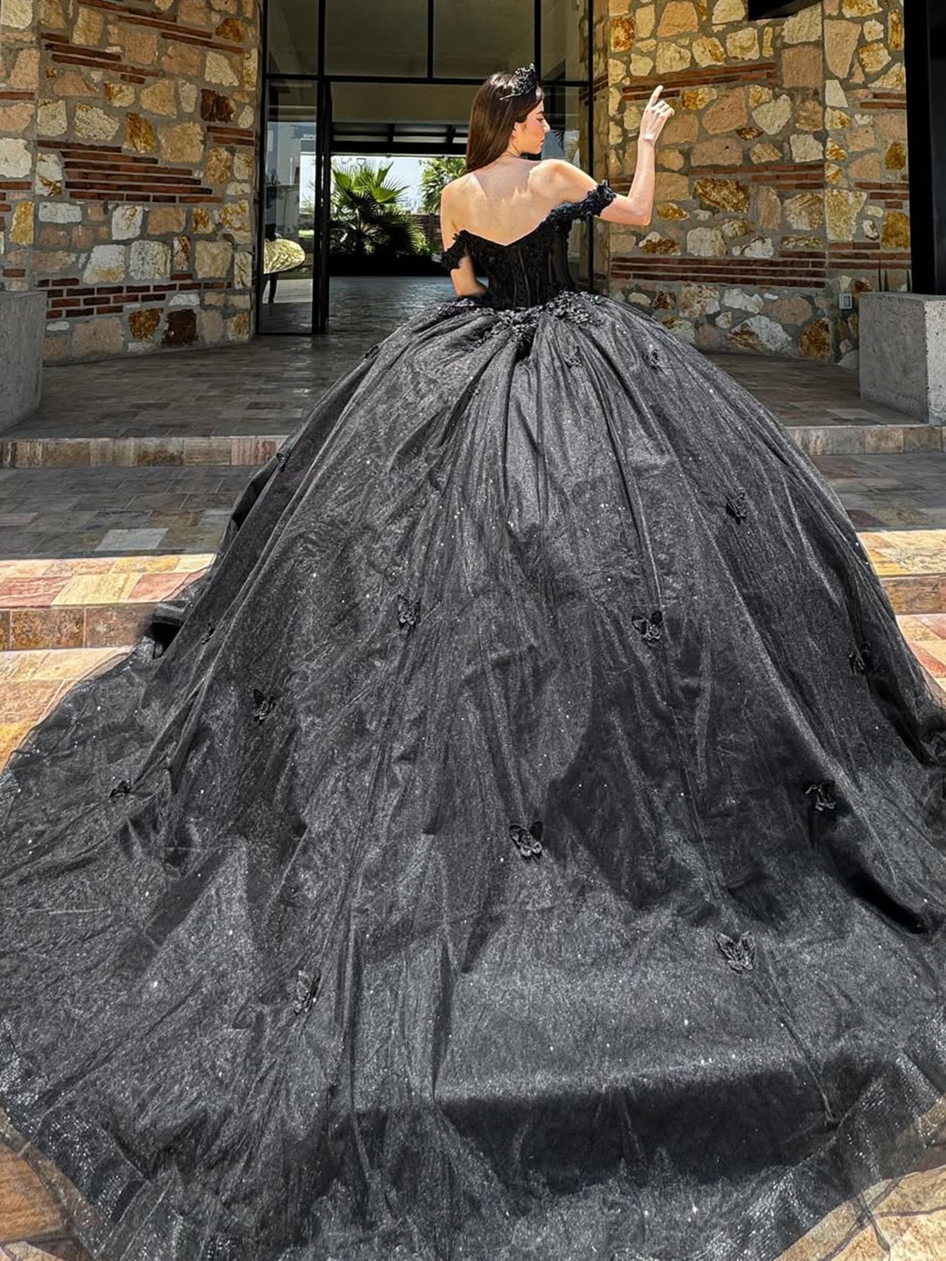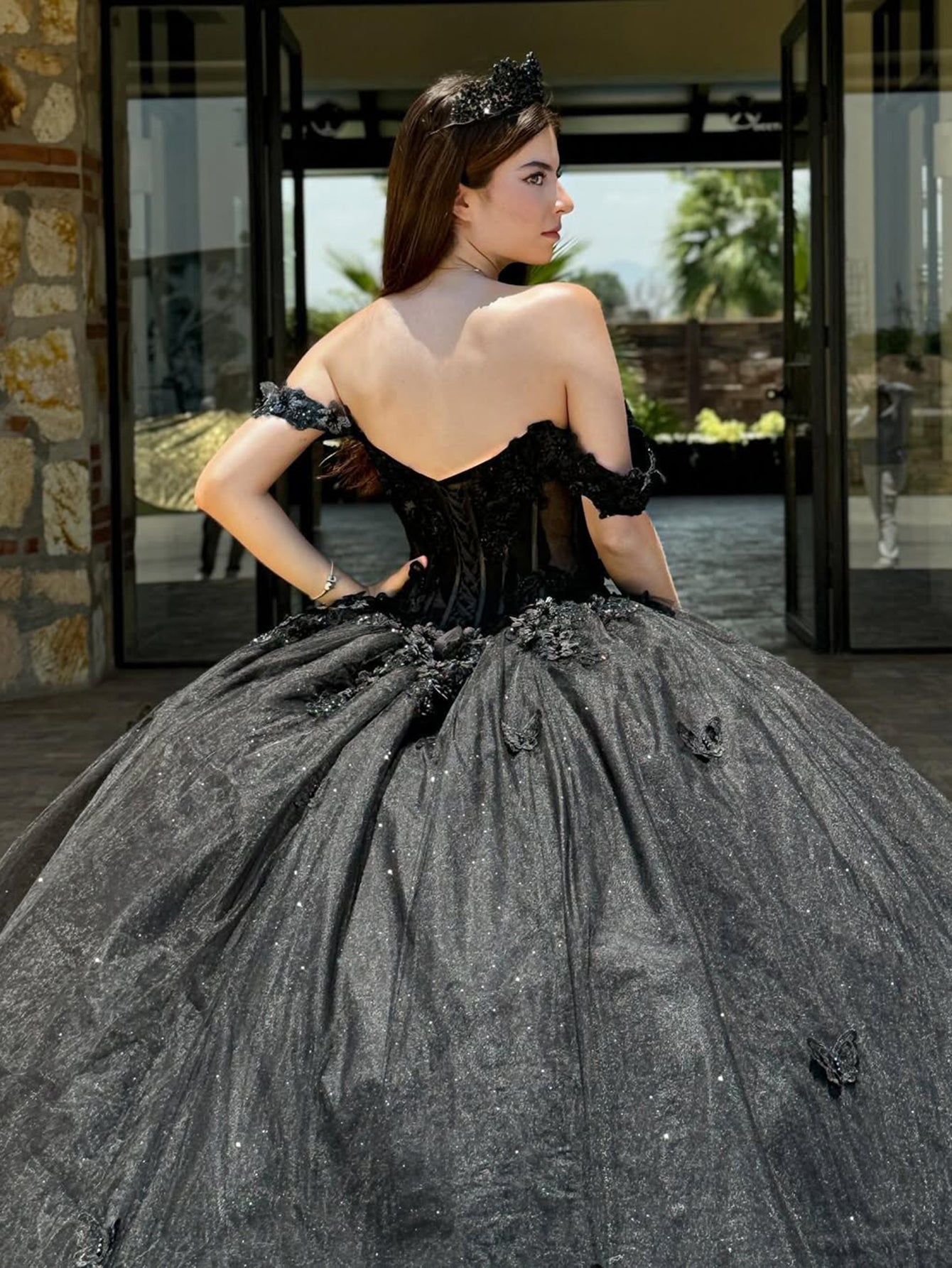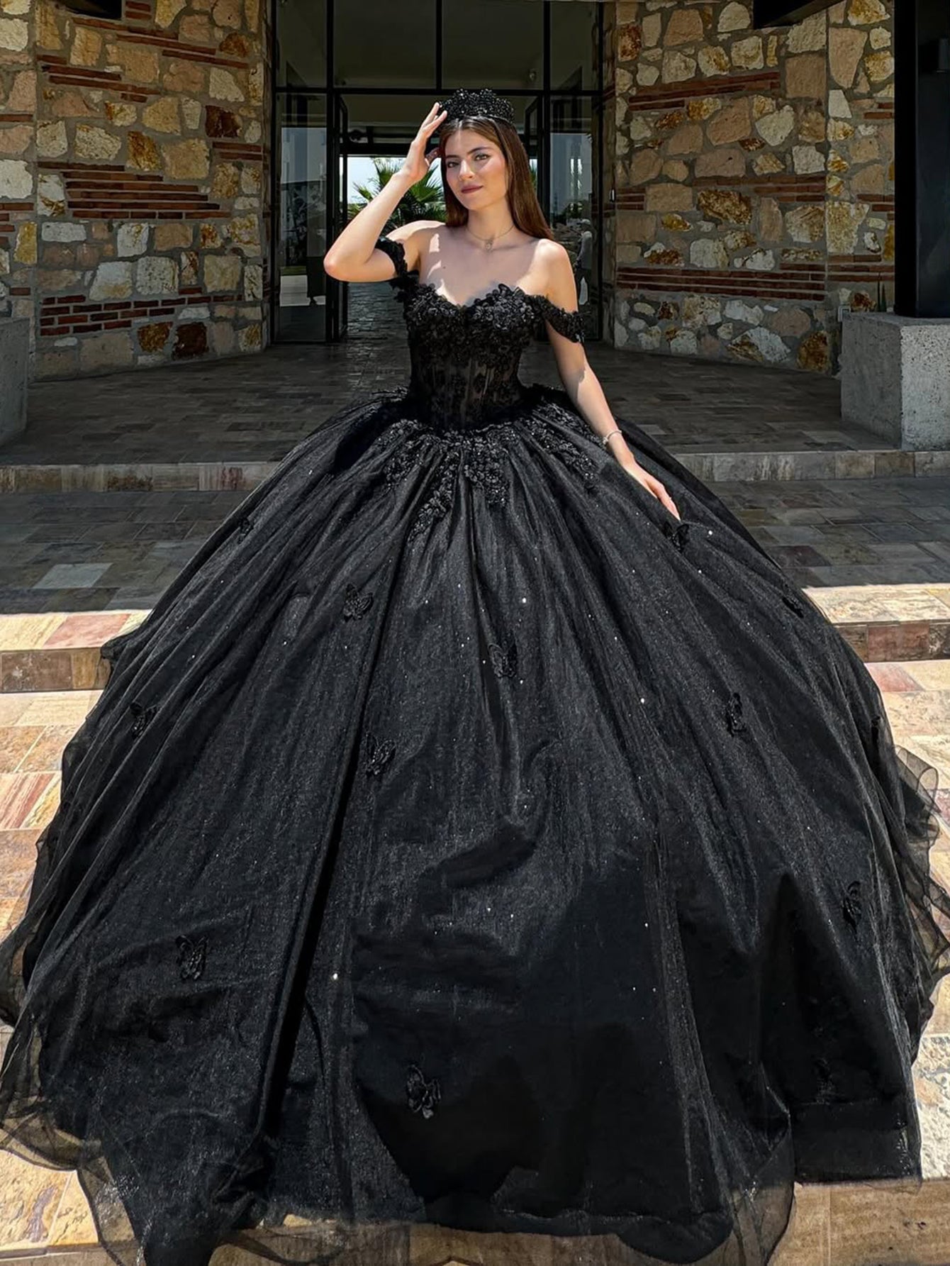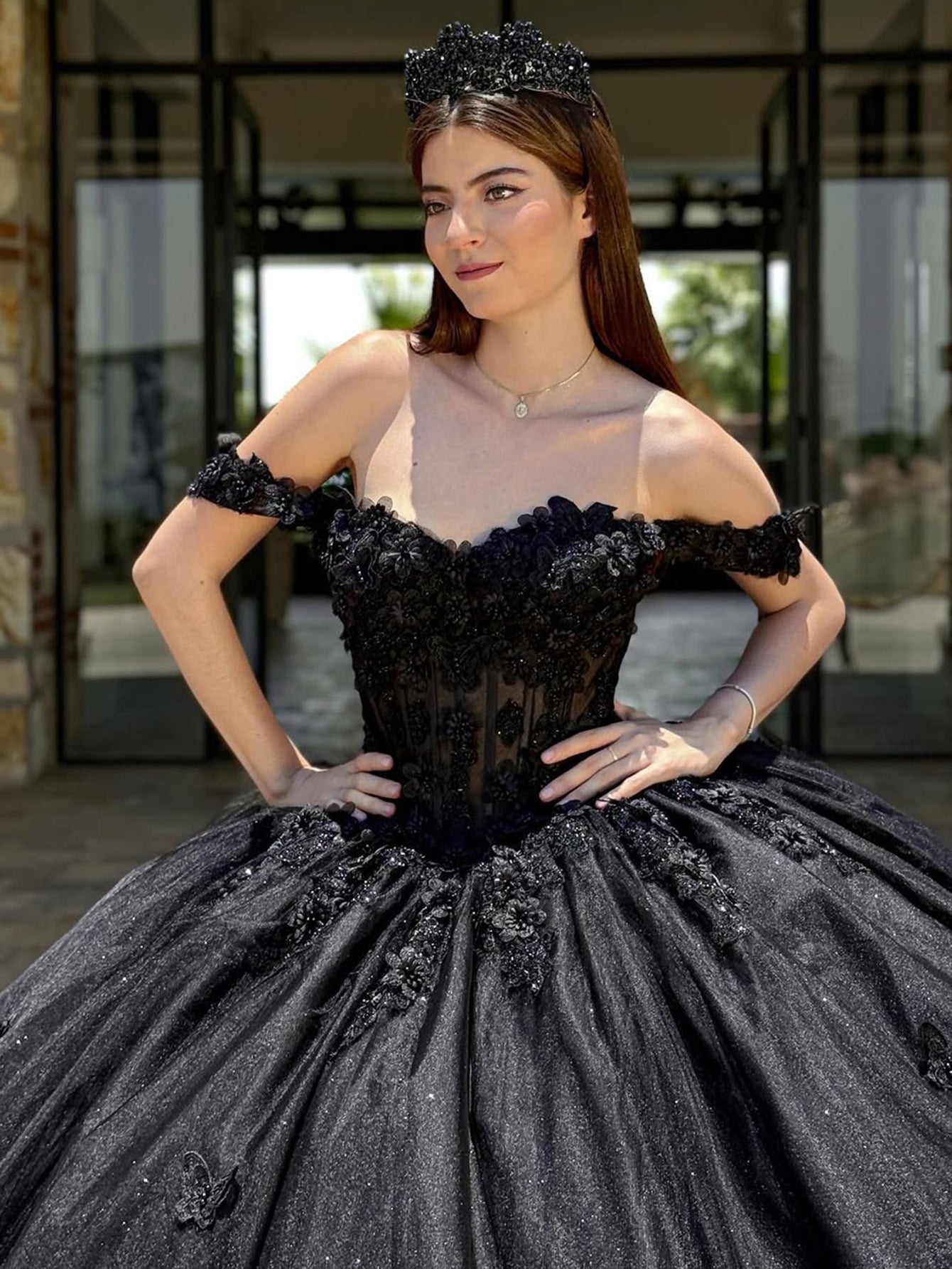 Off Shoulder Sweetheart Bodice Flower Embroidery Long Quinceanera Dress - Black