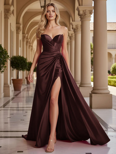 This hot pink prom dress features satin with twist bow on the waist. The strapless prom dress has a v-neck and a split pleated hem. This mermaid long prom dress is ideal for party, evening or homecoming events.