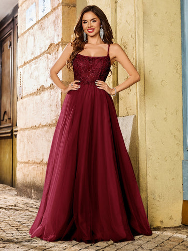This tulle prom dress features hand beading on the bodice. The spaghetti straps dress has a square neck and pleated hem. This maxi party dress is ideal for party, evening or festivals.