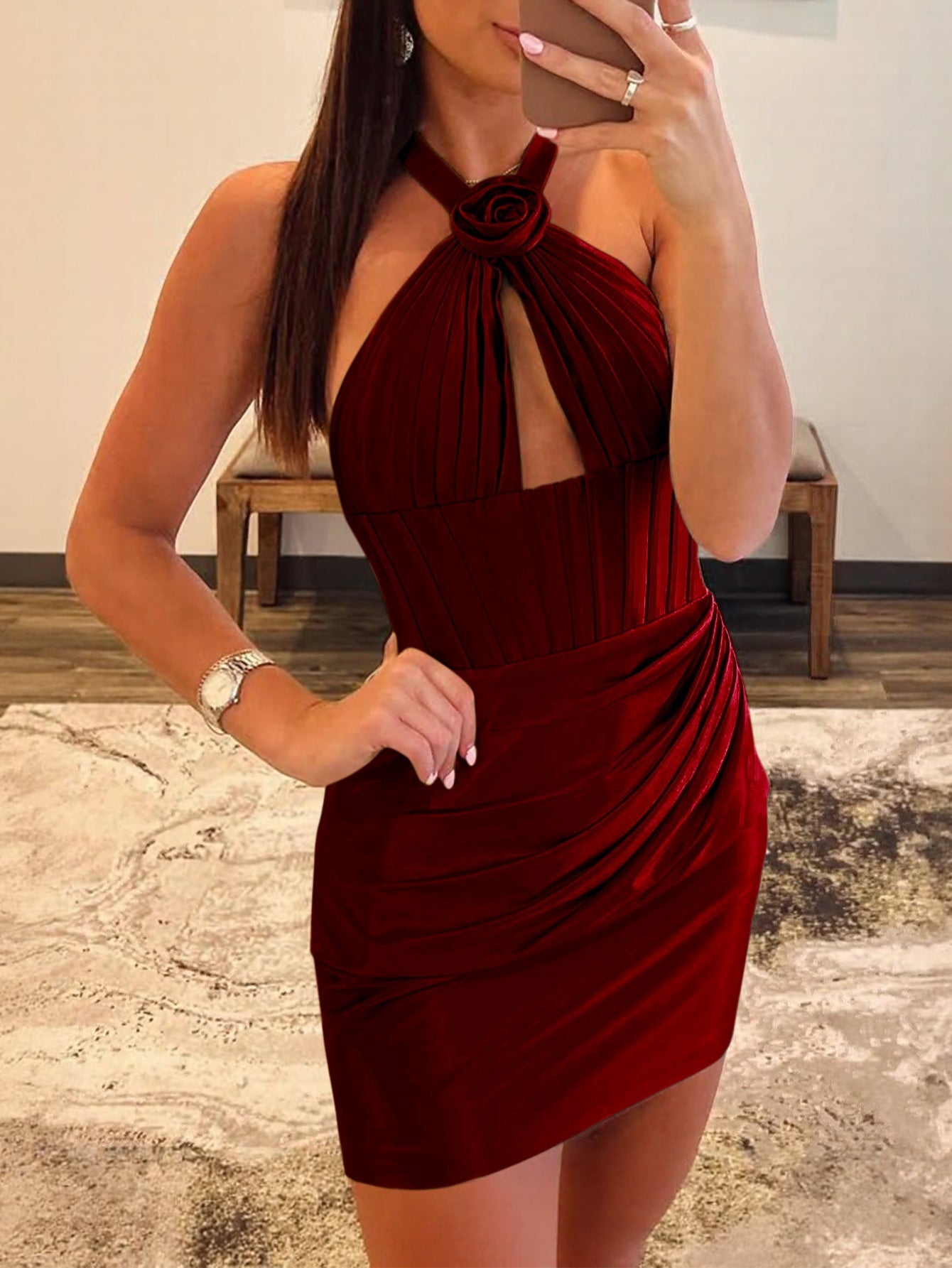 This satin mini prom gown features hand made flower on the bodice. The halter hoco dress has a pleated waist and hem. The short birthday dress is ideal for graduation party, homecoming or prom party.