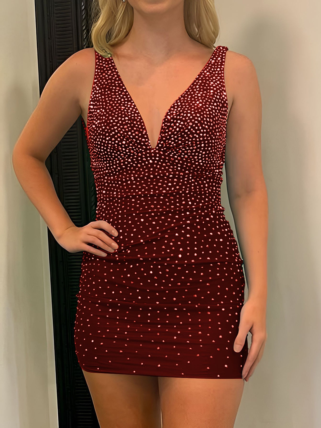 Hot Fix Deep V-Neck Sheath Mini Prom Dress - Burgundy