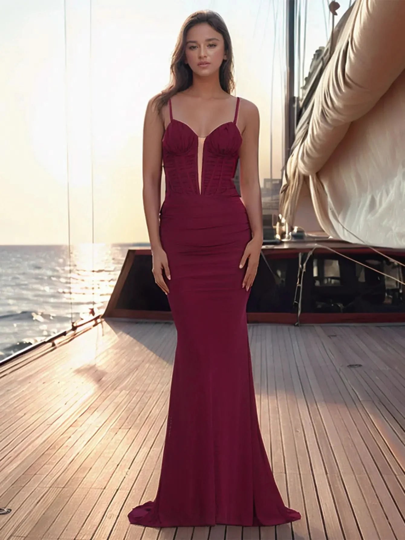 Pleats Deep V-Neck Spaghetti Strap Mermaid Prom Dress - Burgundy