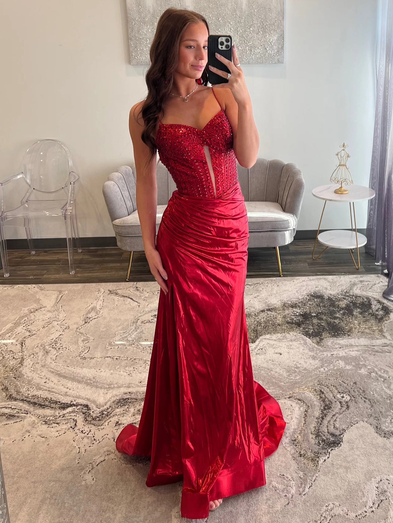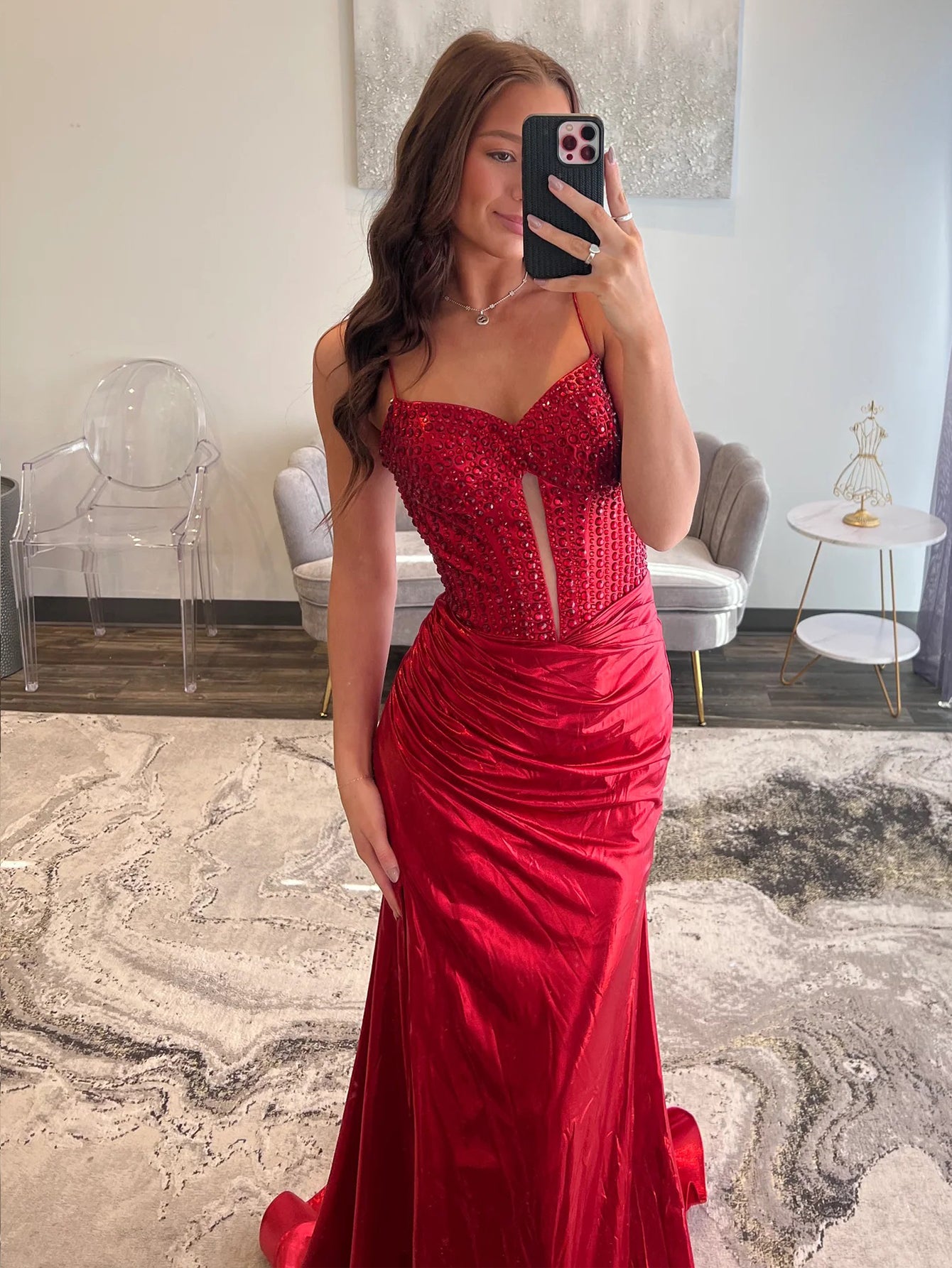 Crystal Cut Front Pleated Mermaid Prom Dress - Red