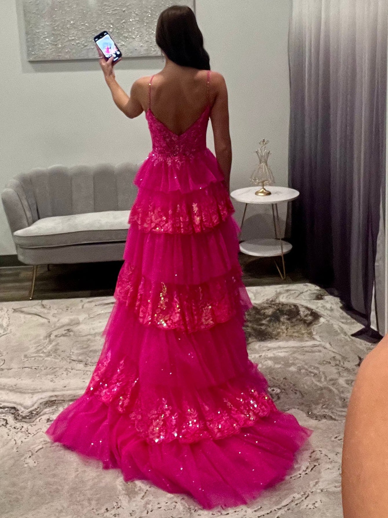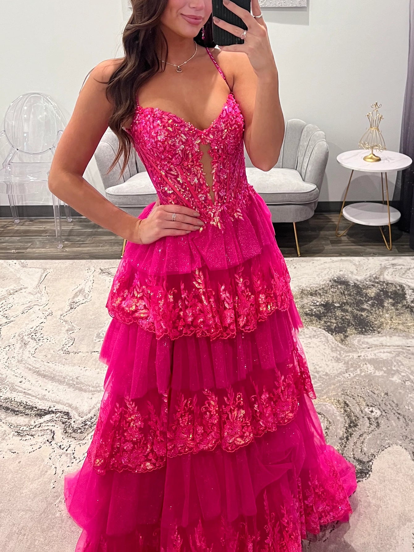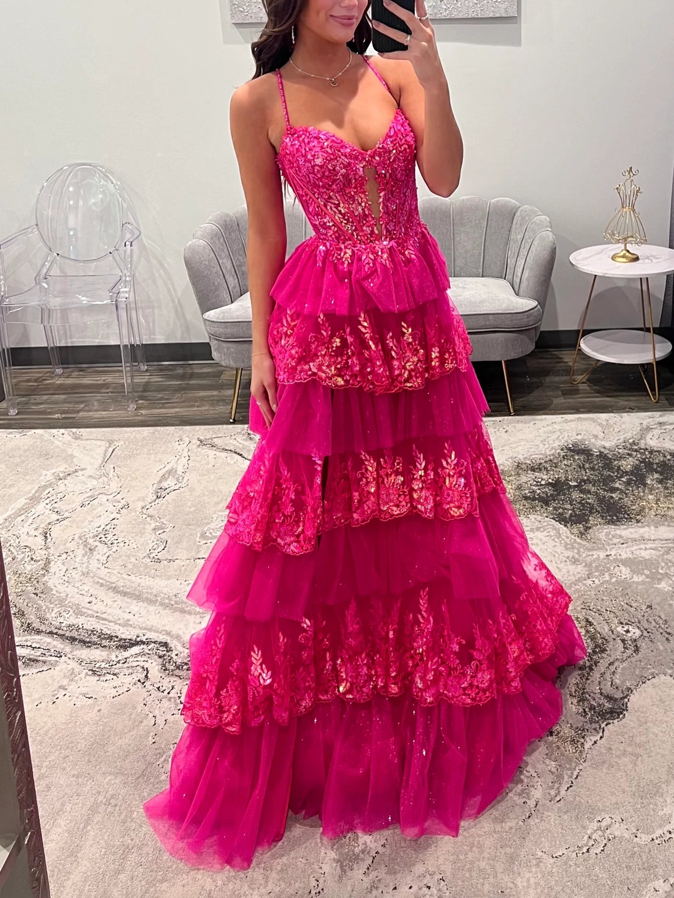 Cut Front Sparkly Lace Embroidery Tiered Ball Gown Prom Dress With Ruffle - Hot Pink