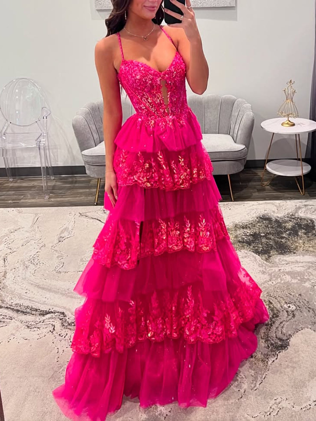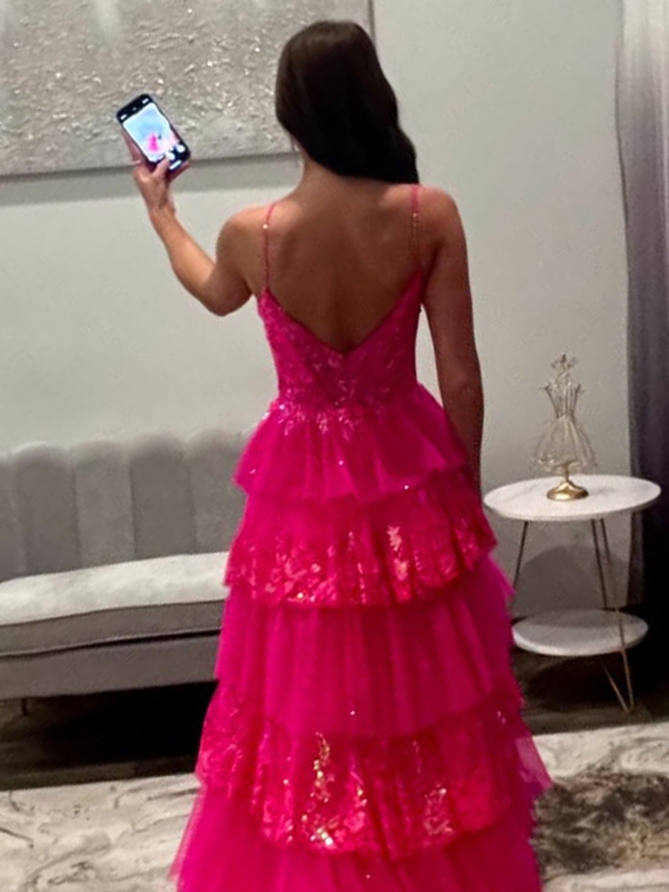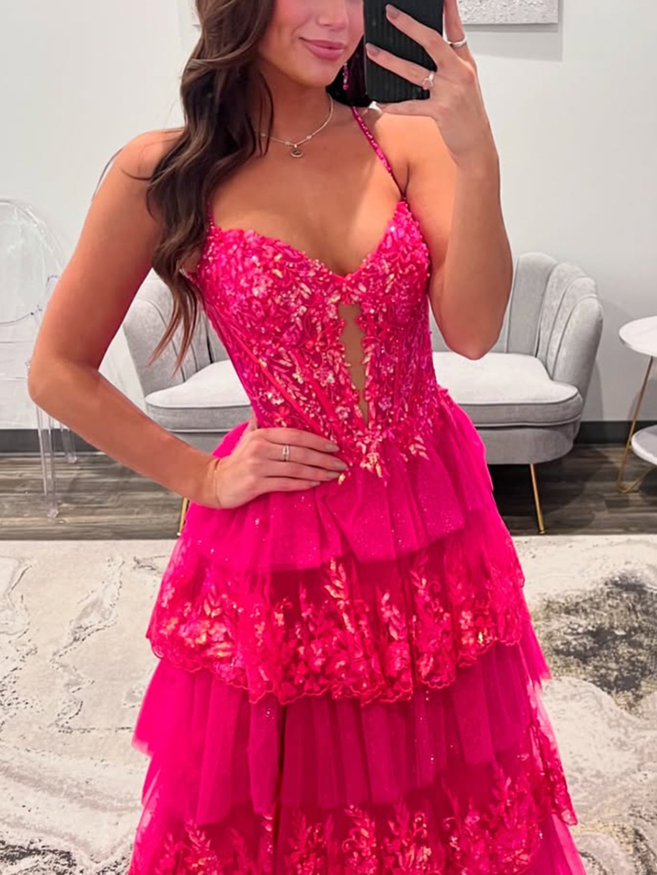 Cut Front Sparkly Lace Embroidery Tiered Ball Gown Prom Dress With Ruffle - Hot Pink