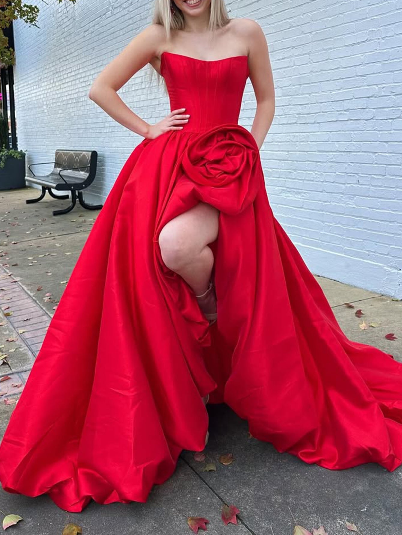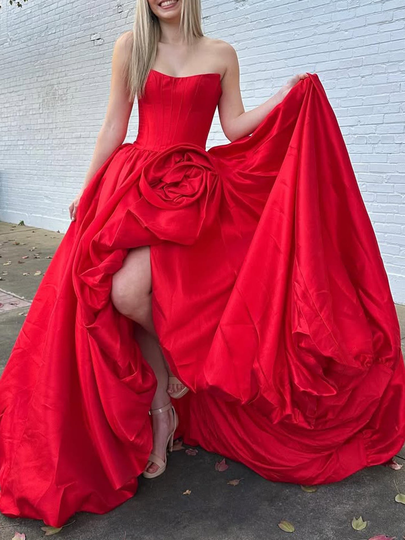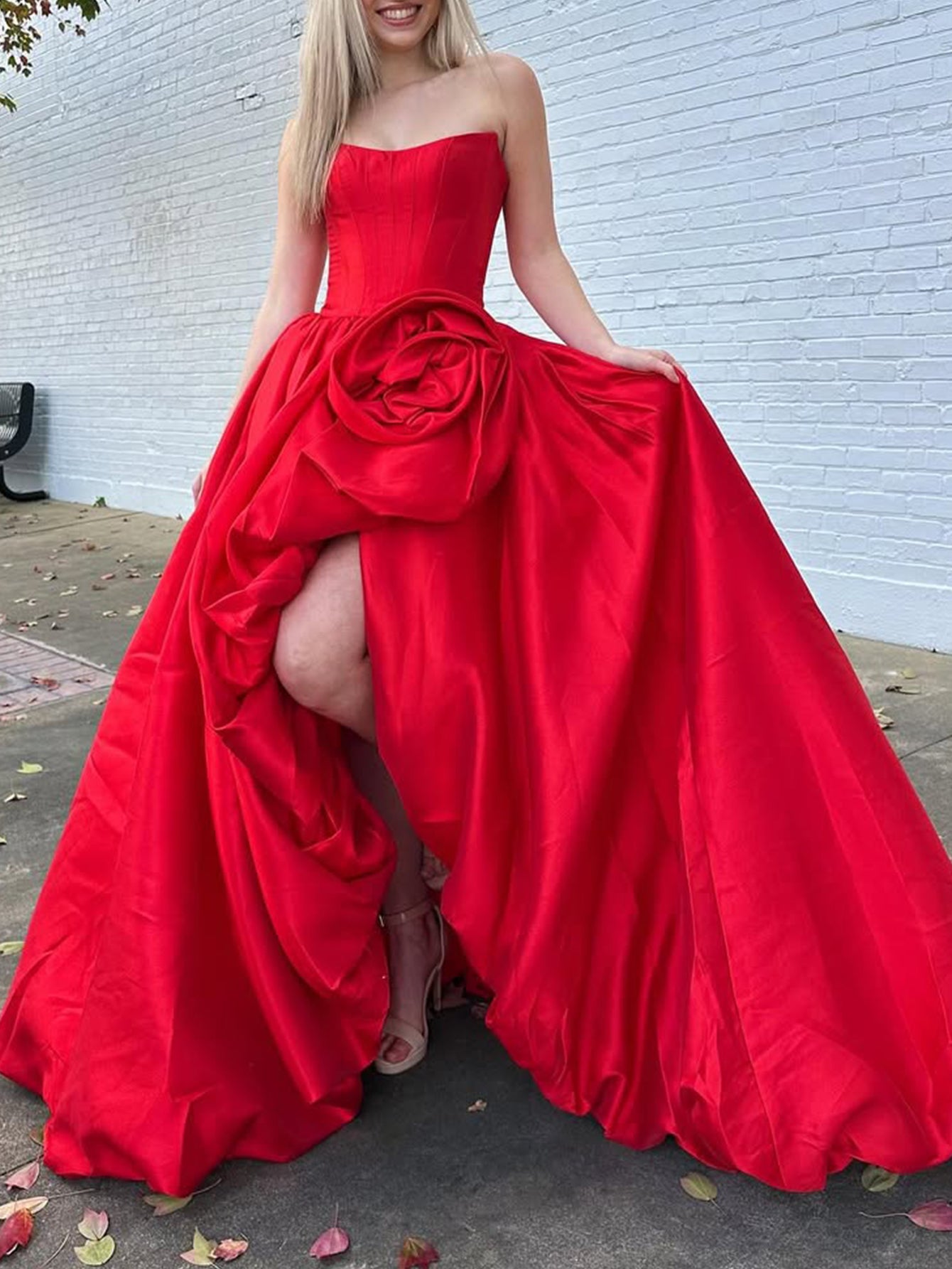 This satin prom gown features hand made flower on the bodice. The strapless dress has a pleated and split hem. Worldprom ball gown dresses are ideal for party, evening or festivals.