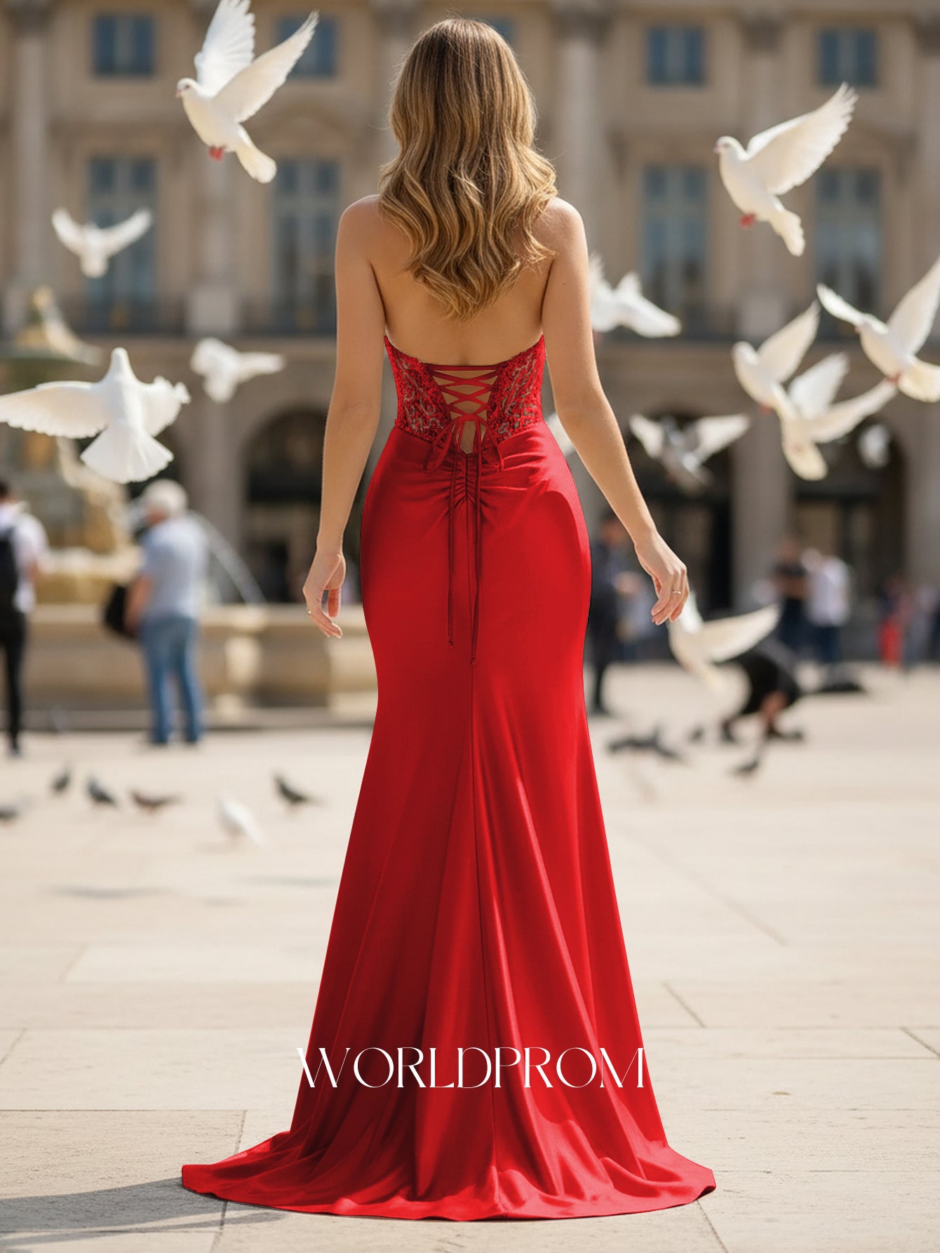 This satin prom gown features embroidery cut front on the illusion bodice. The halter dress has a deep V-neckline and split hem. Worldprom mermaid prom dresses are ideal for party, evening or festivals.