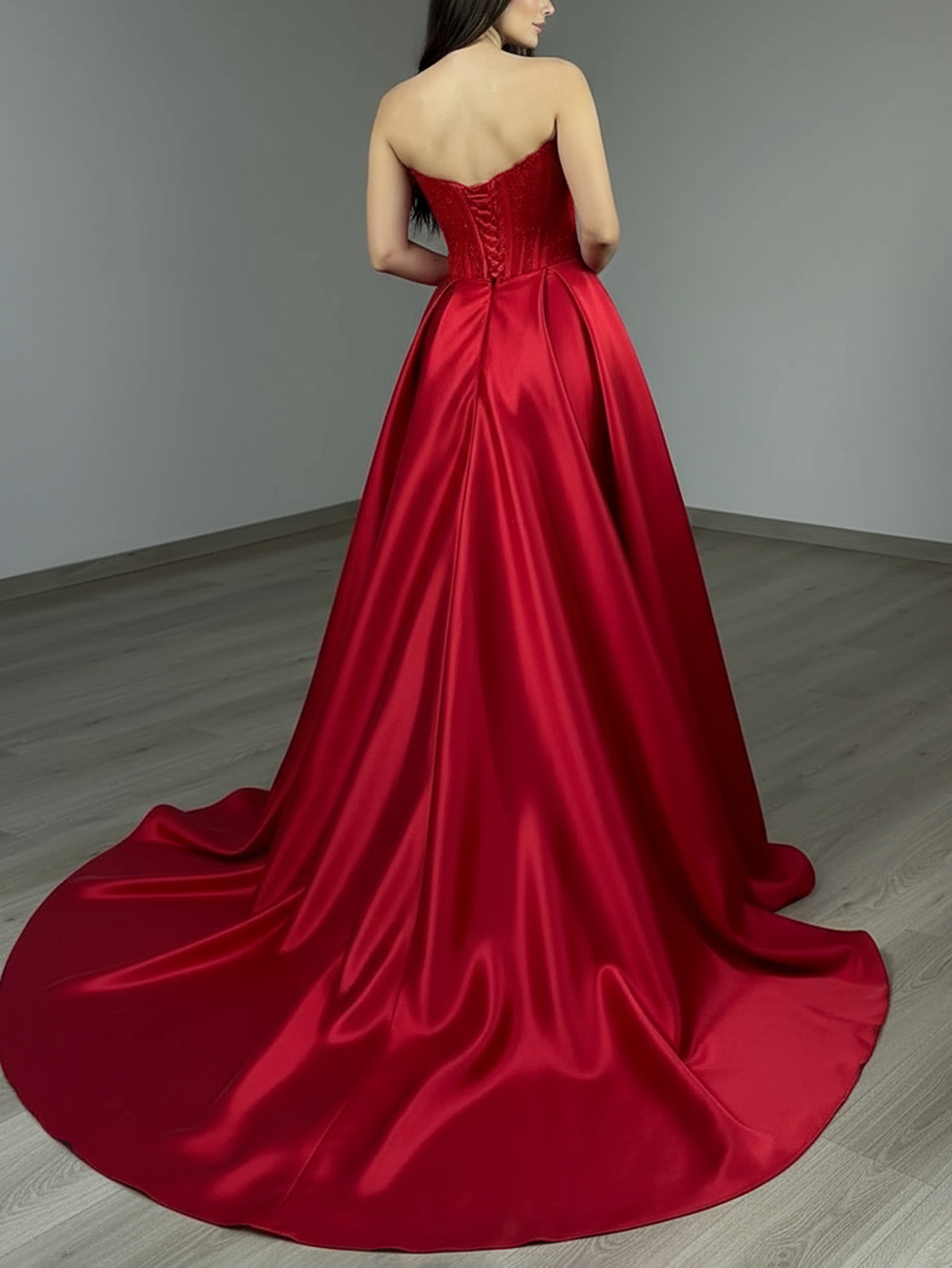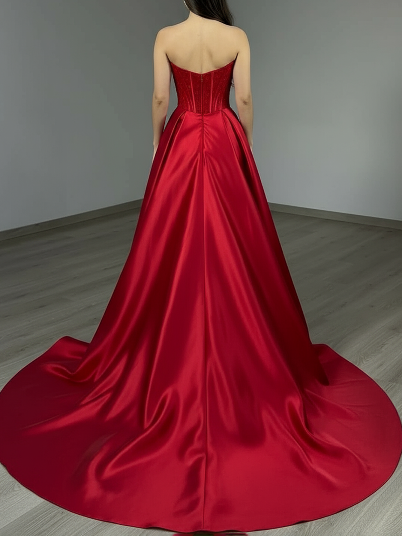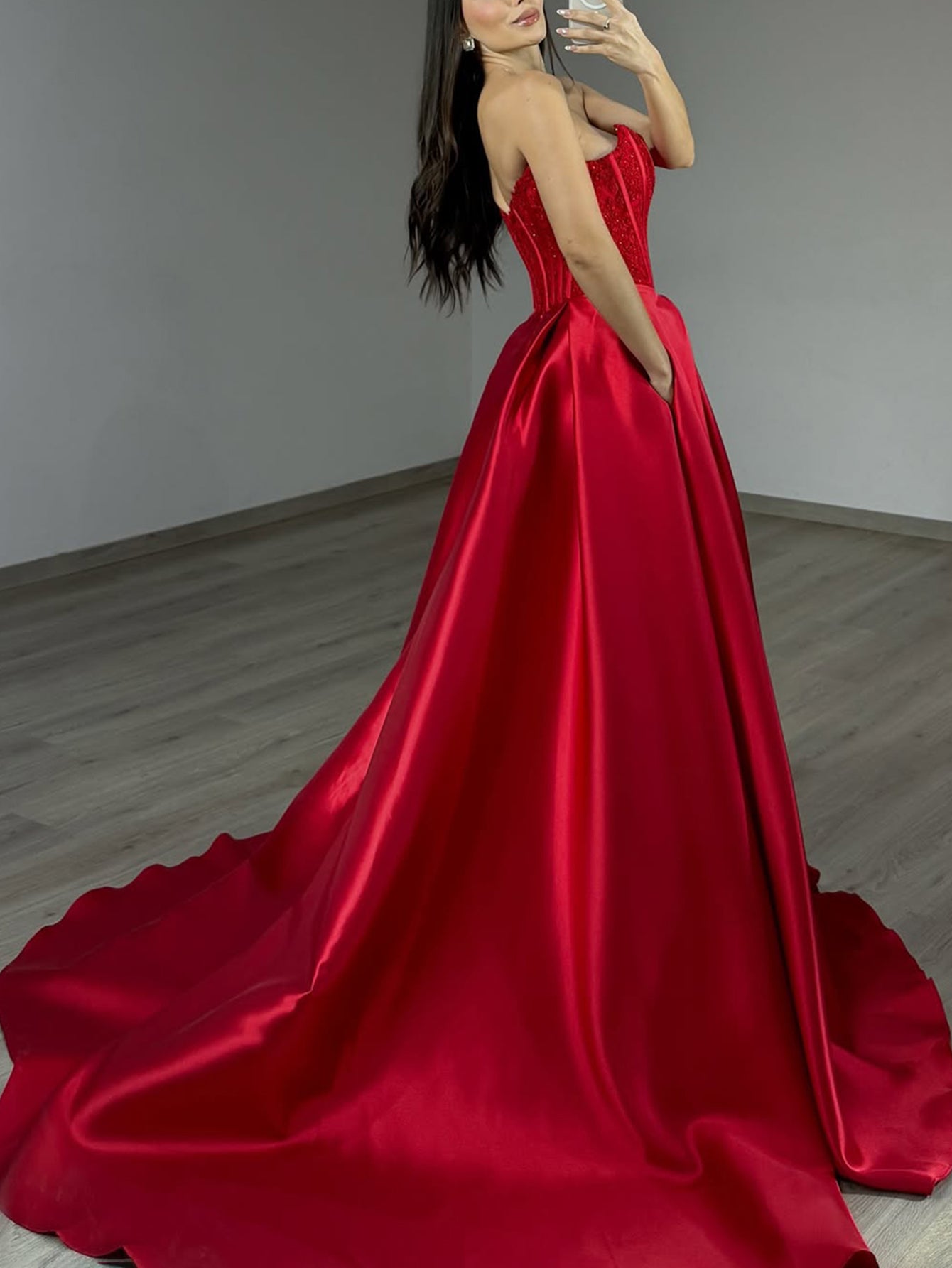 This satin prom gown features hand beading on the bodice. The strapless dress has a sweetheart neckline and pleated hem. Worldprom ball gown prom dresses are ideal for party, evening or festivals.