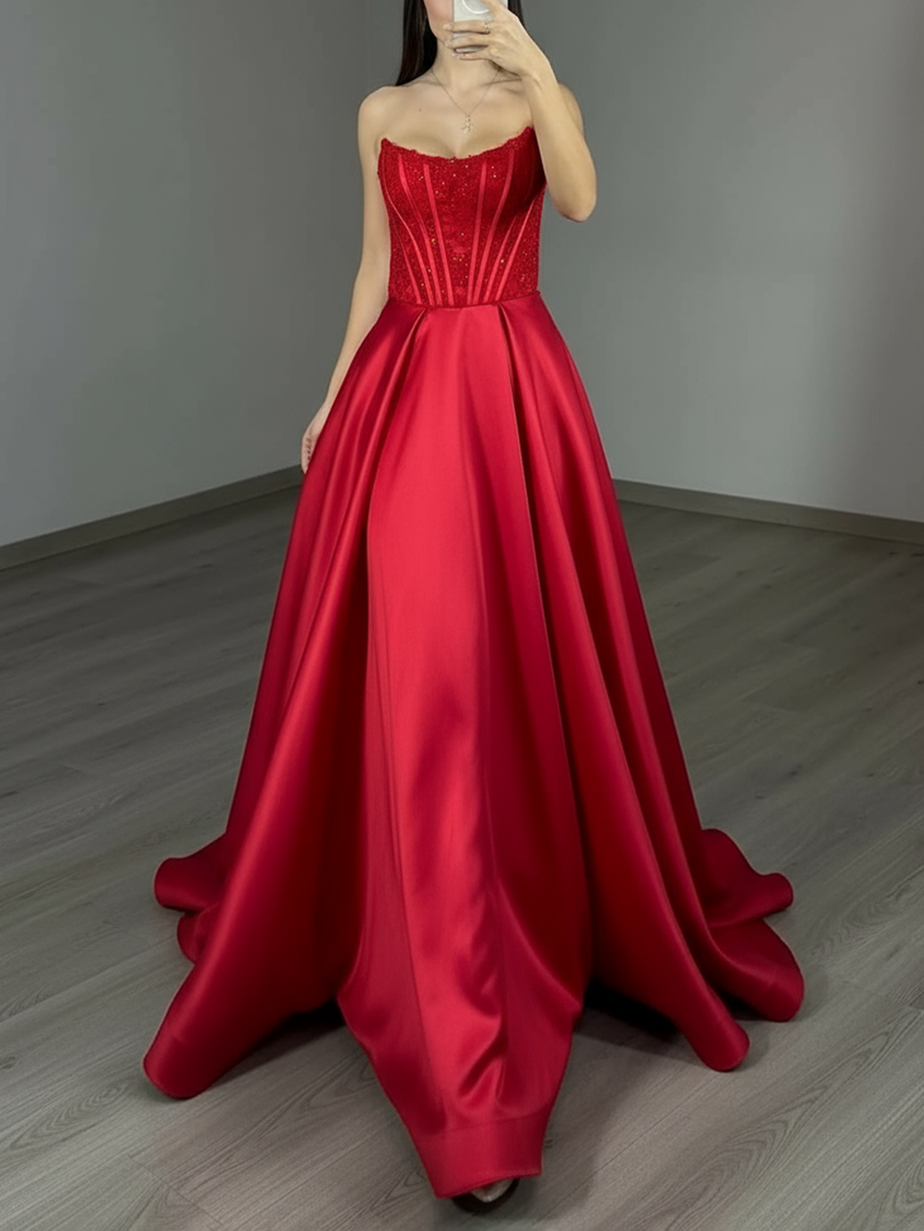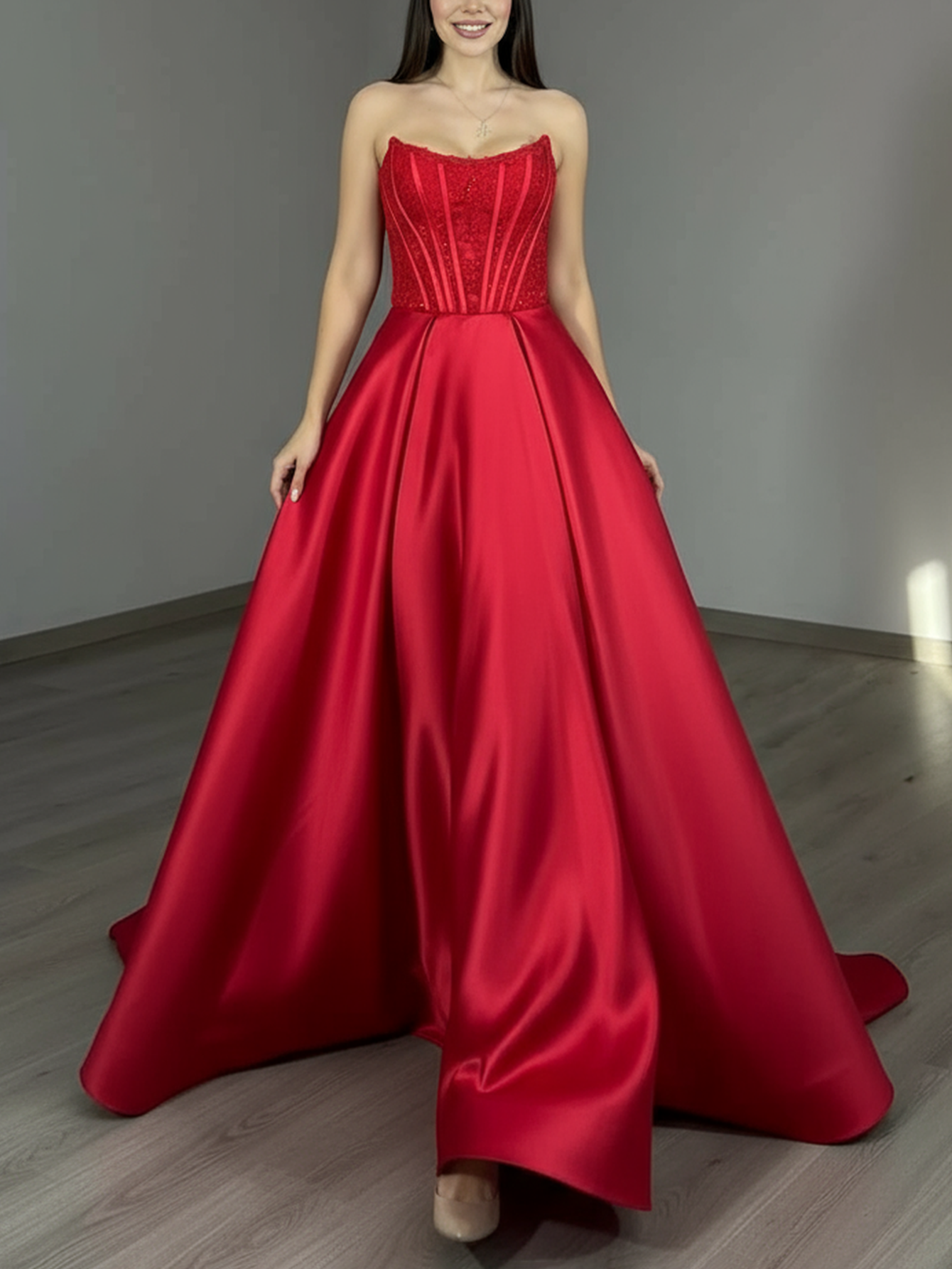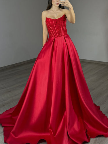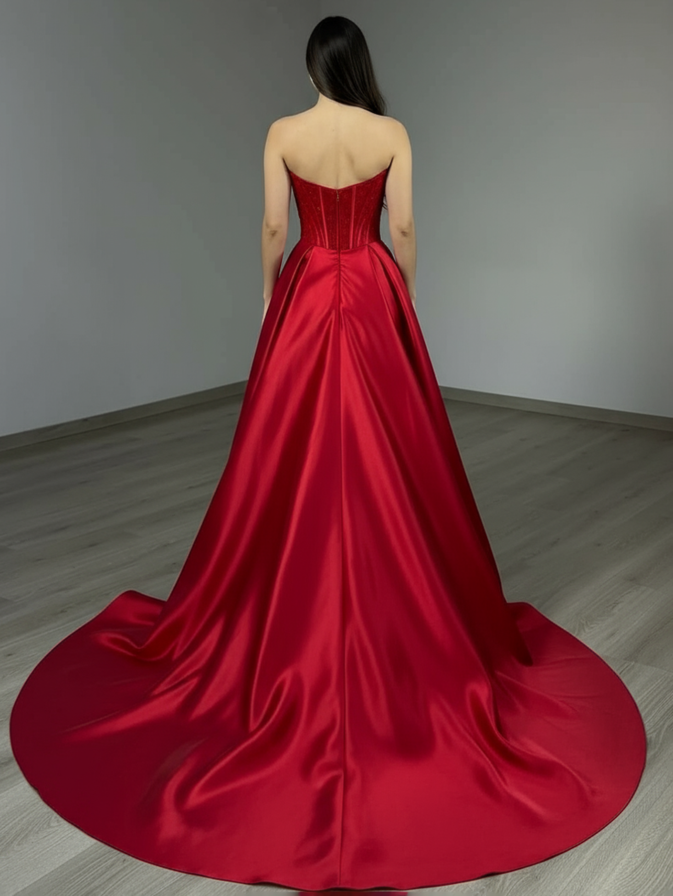 This satin prom gown features hand beading on the bodice. The strapless dress has a sweetheart neckline and pleated hem. Worldprom ball gown prom dresses are ideal for party, evening or festivals.