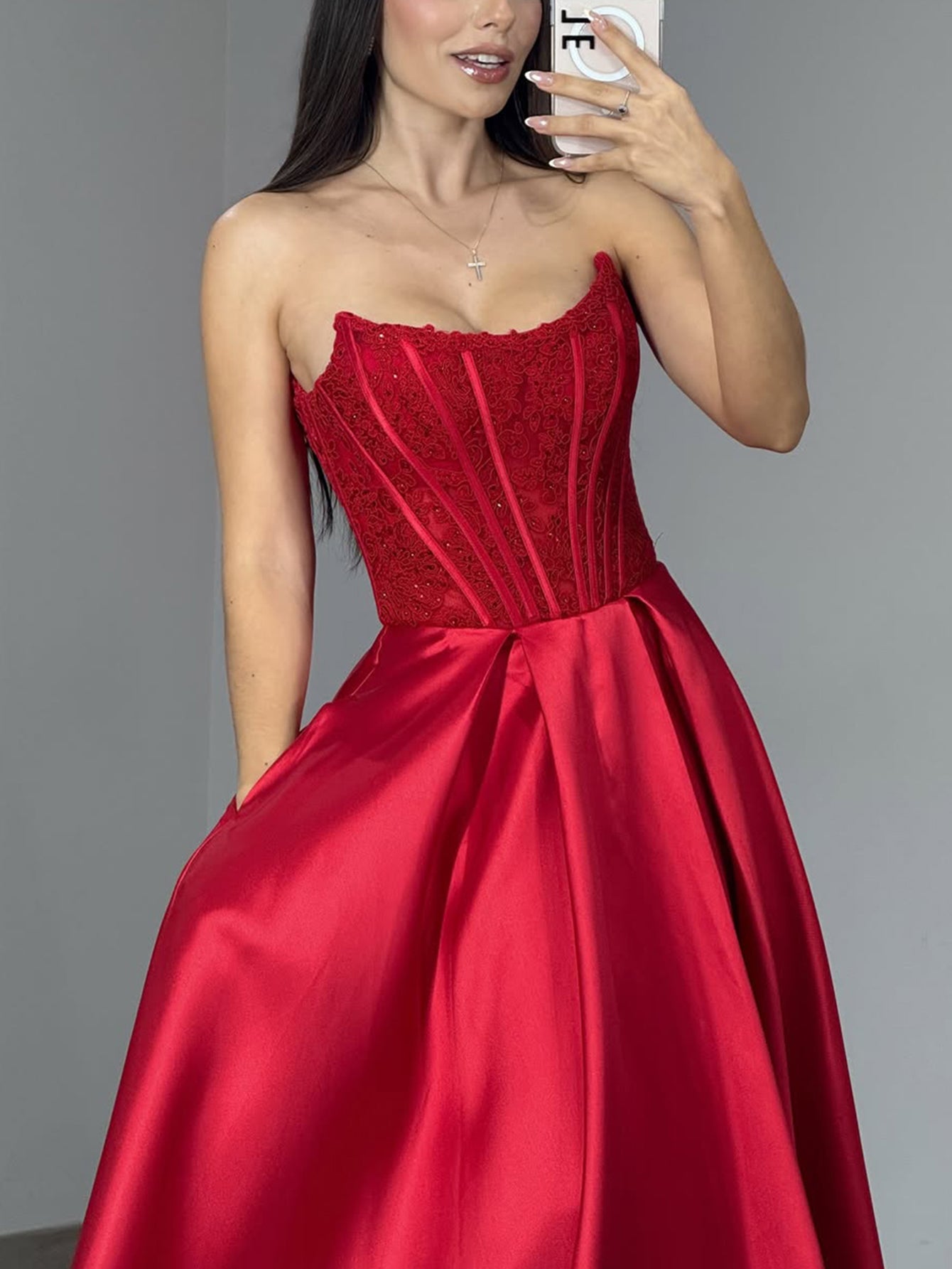 Embroidery Strapless Hand Beading Bodice Ball Gown Prom Dress - Red