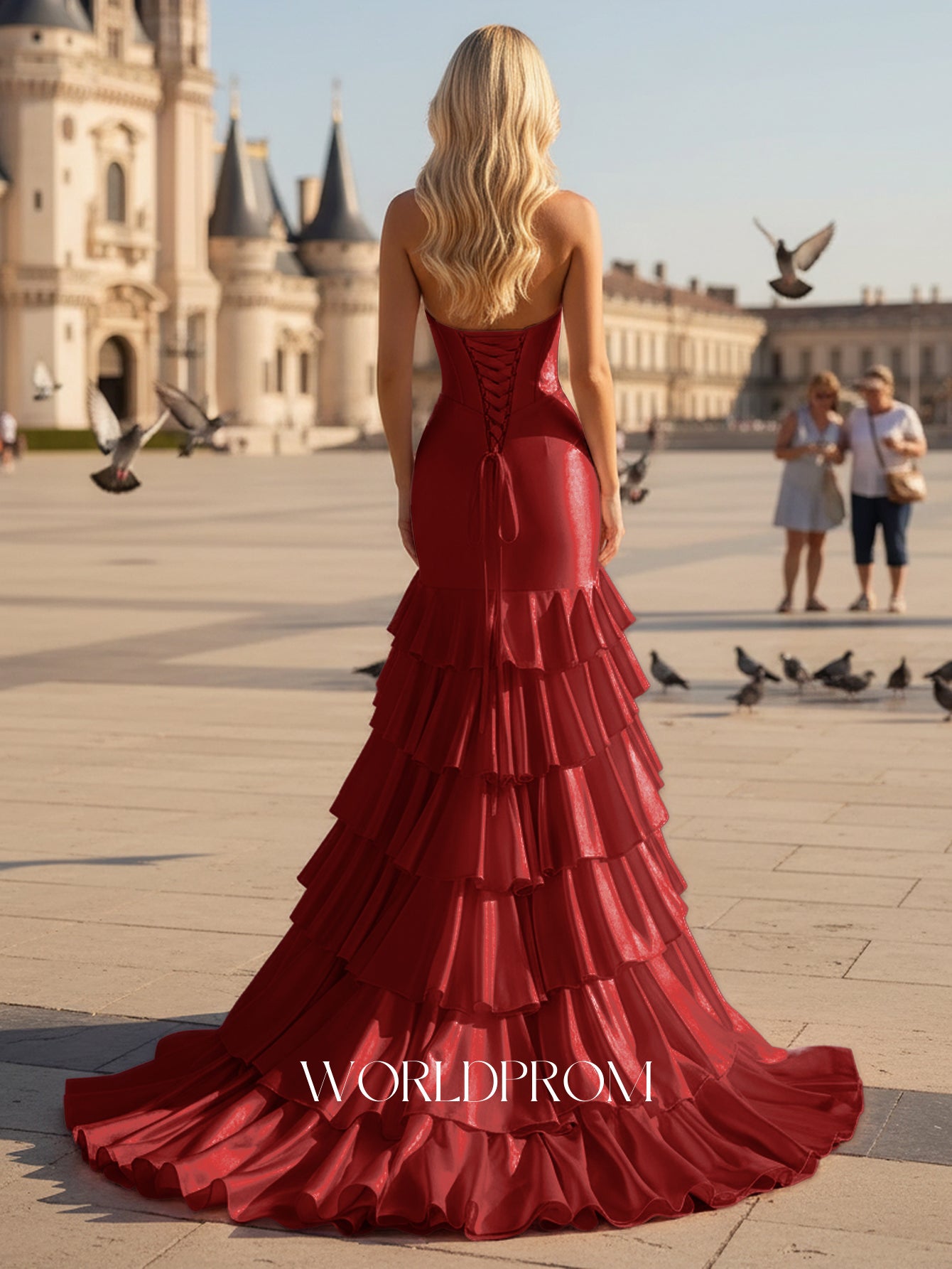 Halter Pleated Ruched Bust Layered Ruffle Hem Long Mermaid Prom Dress With Slit - Red