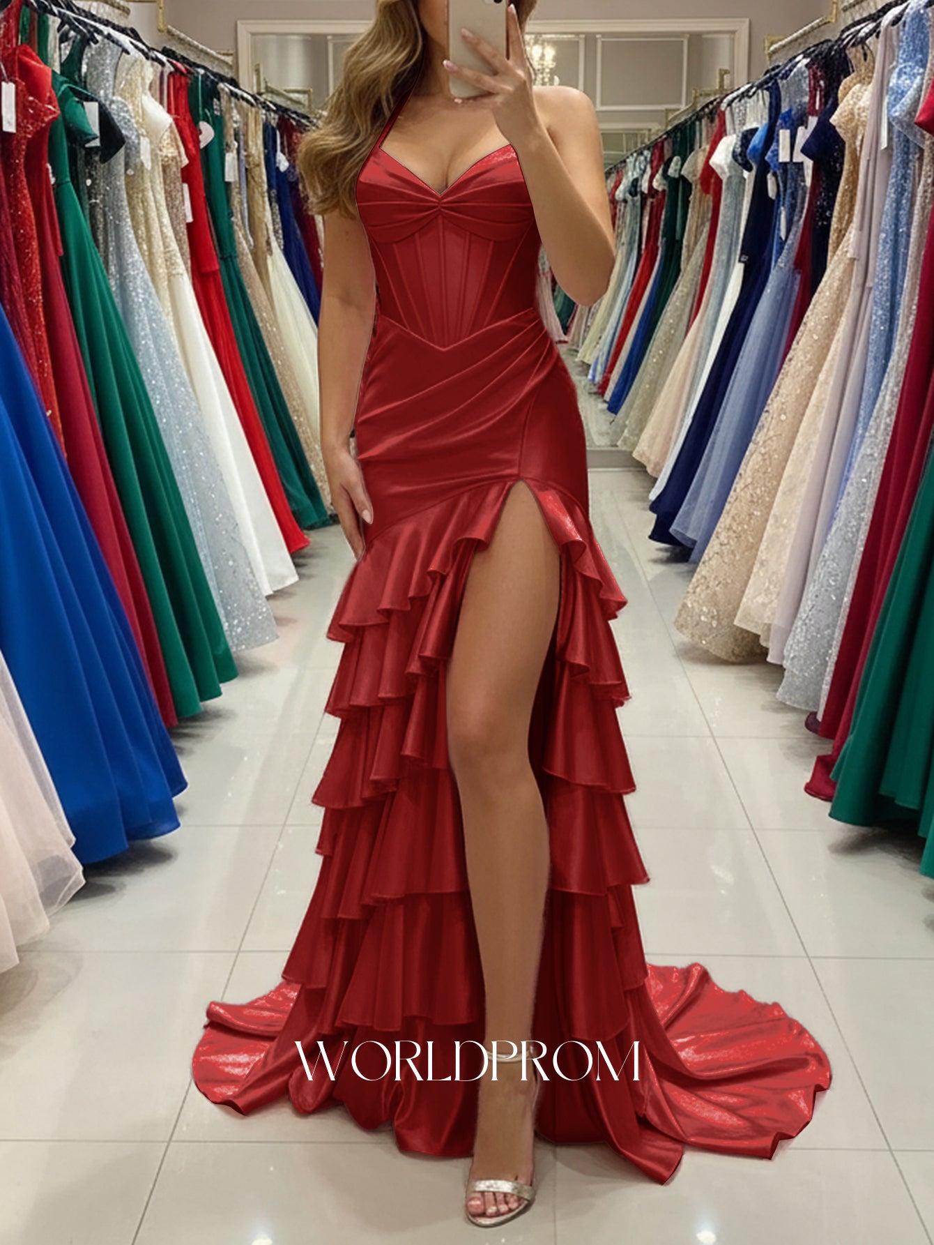 This satin prom gown features ruched bust on the bodice. The halter ruffled dress has a V-neckline and split hem. Worldprom trumpet prom dresses are ideal for party, evening or festivals.
