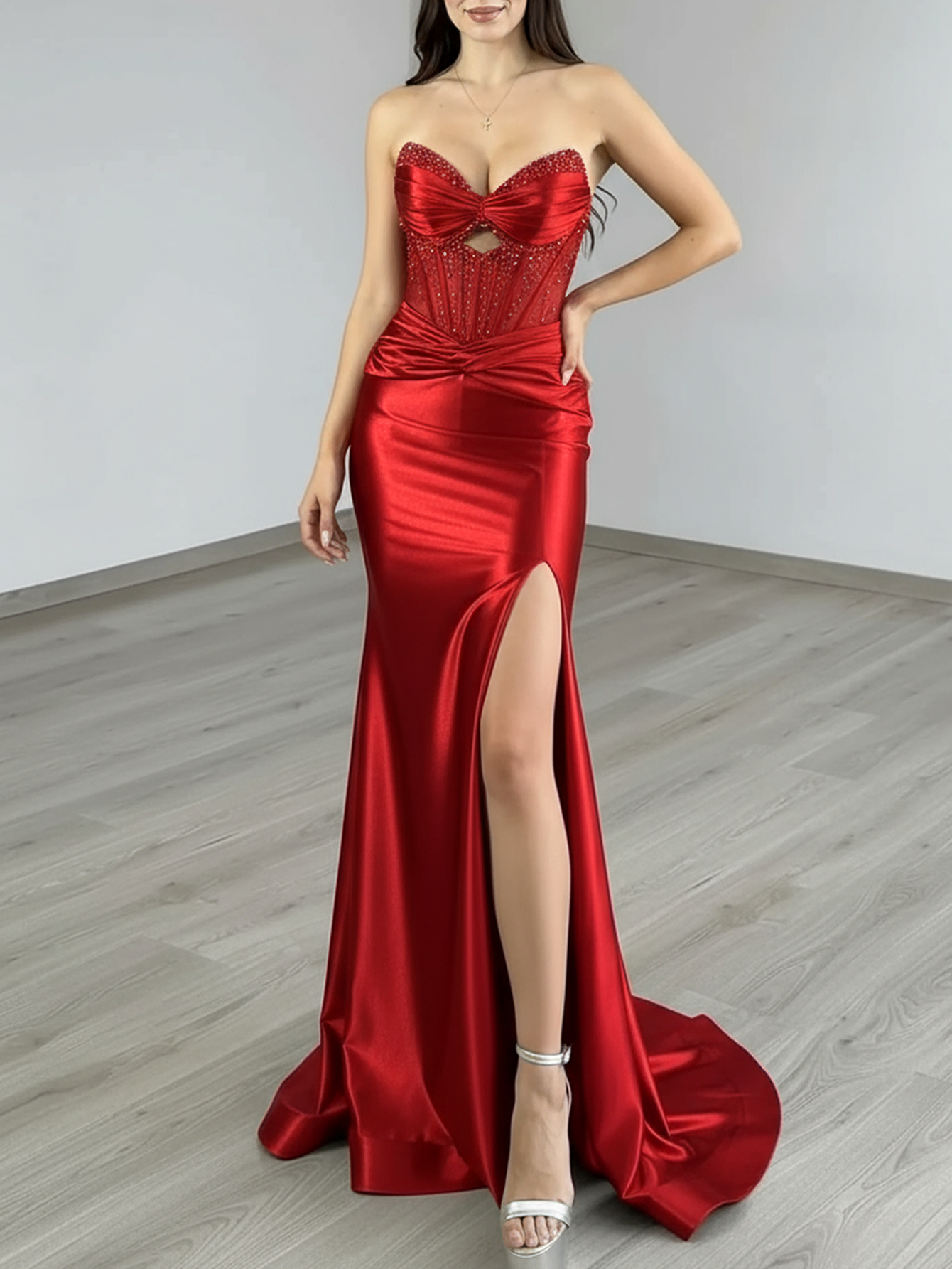 This stretch satin prom gown features hand-beading and cutout crystals on the illusion bodice. The strapless maxi sheer dress has a sweetheart neckline and pleated hem. This mermaid split dress is ideal for party, evening or festivals.