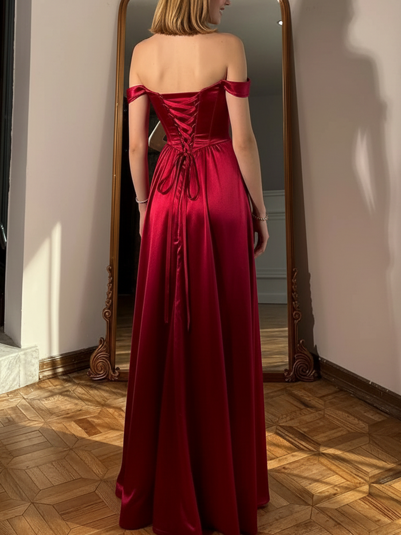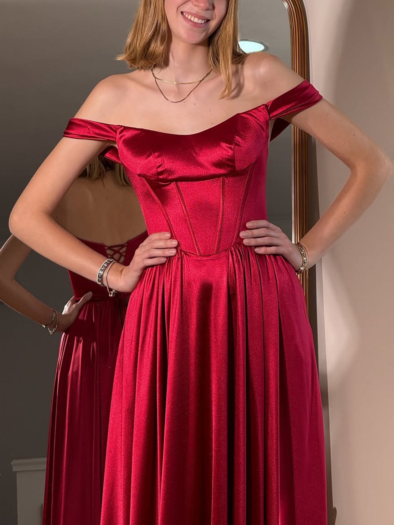 This satin prom gown features corset on the bodice. The off shoulder dress has a detachable strap and pleated hem. Worldprom a-line prom dresses are ideal for party, evening or festivals.
